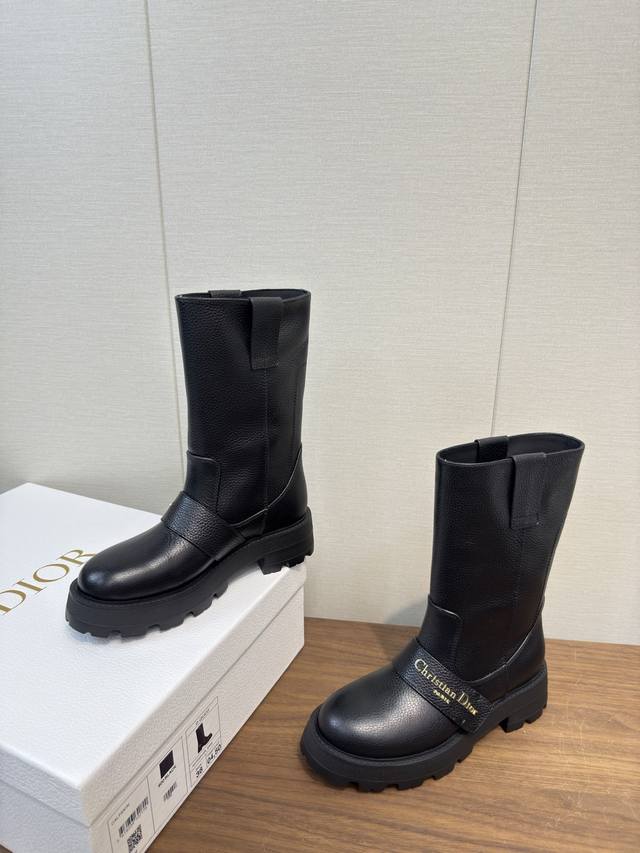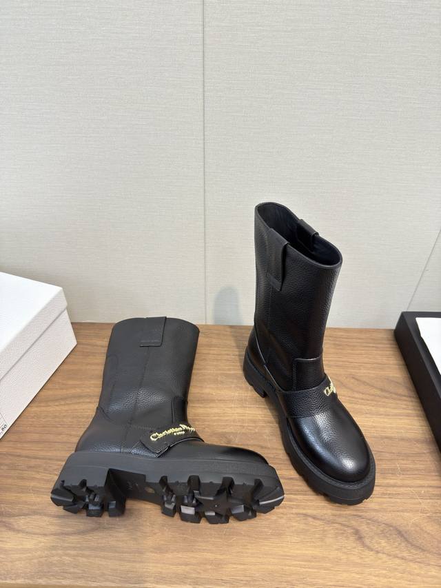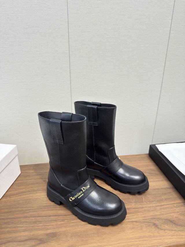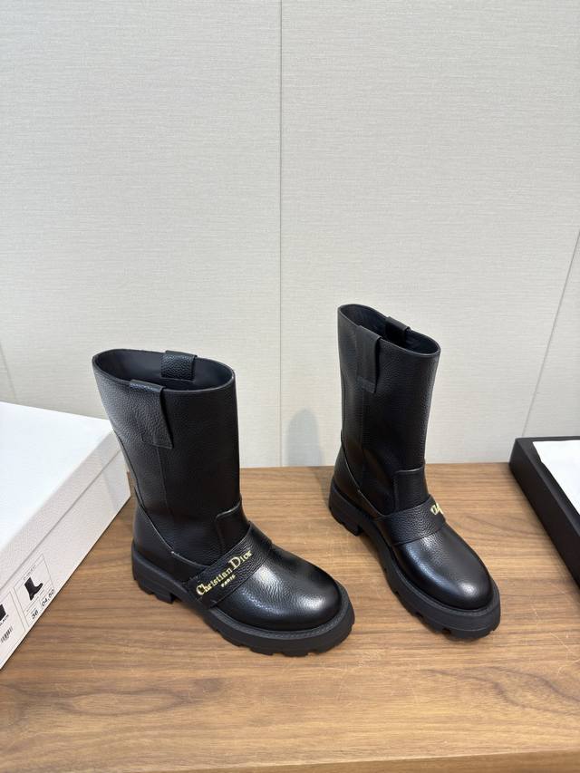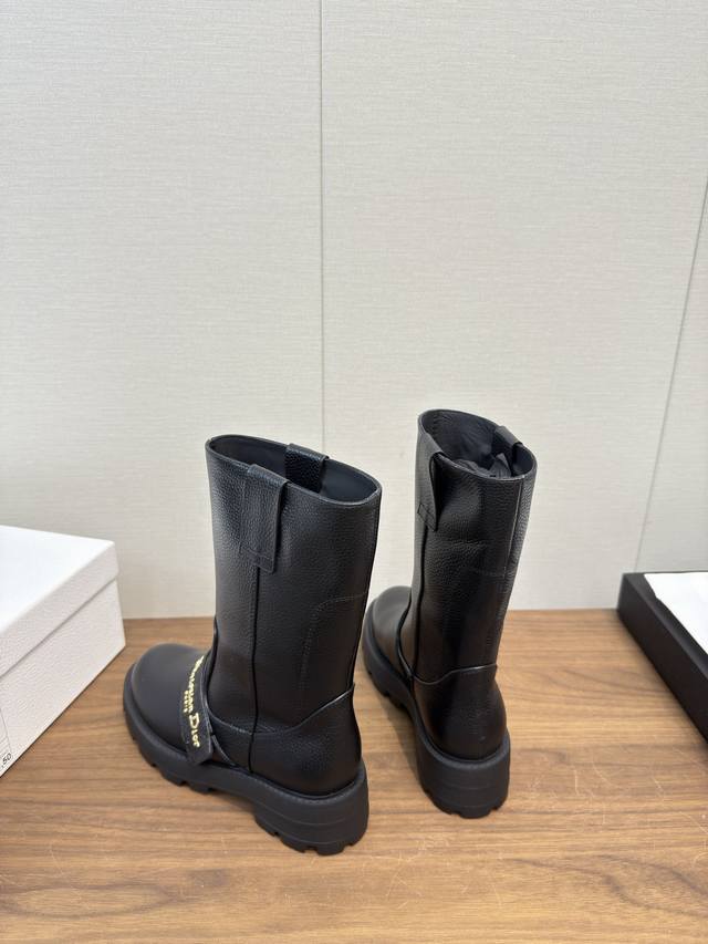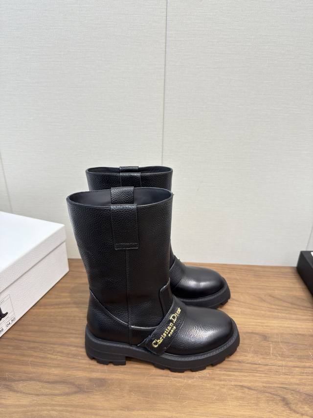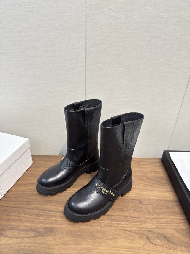 Dior Dior 25Fw latest autumn and winter high-end poster style electric embroidered color-blocked letter logo round toe mid-calf women's boots celebrity style low-heeled slip-on knight military boots original development top high-end version