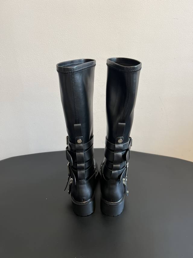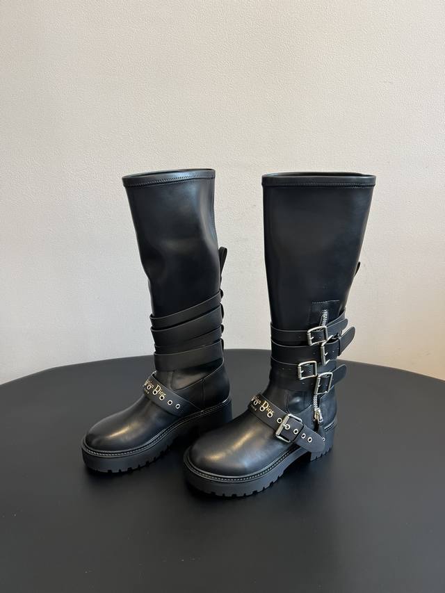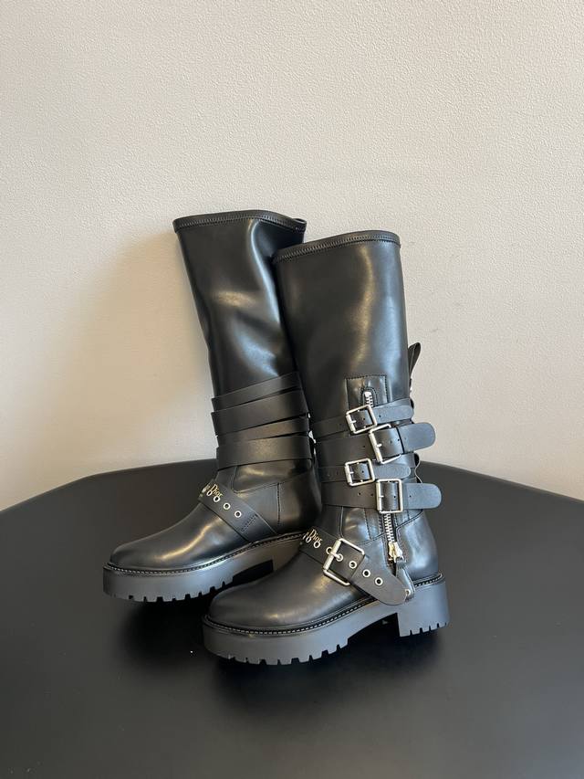 Top-tier Dior 25Ss new punk motorcycle boots. Made of premium leather, these boots are delicate yet structured, with exquisite craftsmanship and details showcasing the brand's high-end quality. Available in both high-top and mid-top styles, the thick sole not only adds height but also exudes a strong retro workwear feel. The shoe has a sleek shape and excellent support. The high-top black version can be paired with black skinny leather pants, a distressed denim jacket, and a metal necklace and chain bag for a cool, street-punk look. Upper: Cowhide; Lining: Cowhide; Outsole: Original molded outsole; Size: 35-41; Sizes 40 and 41 are custom-made and non-refundable.