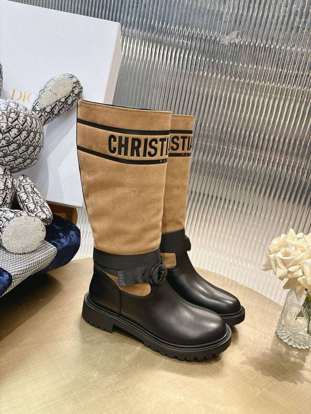 Top-tier Dior Major Embroidered Riding Boots with Leather and Mahogany Trim. These stylish boots feature a distinctive design element for a striking look. Crafted from black technical fabric and cowhide leather, they are easy to slip on and off. Inspired by the Dior Book Tote bag, they are adorned with a two-tone "Christian Dior" logo at the top. An adjustable nylon strap with the "Cd" logo and a wavy rubber sole create a striking silhouette. The boot shaft is decorated with the "Christian Dior" logo. The ankle is wrapped with a technical fabric strap and paired with a brass ring. The notched rubber sole is decorated with Christian Dior's lucky star symbol. Size: #35-40. Size 40 is custom-made and non-refundable.