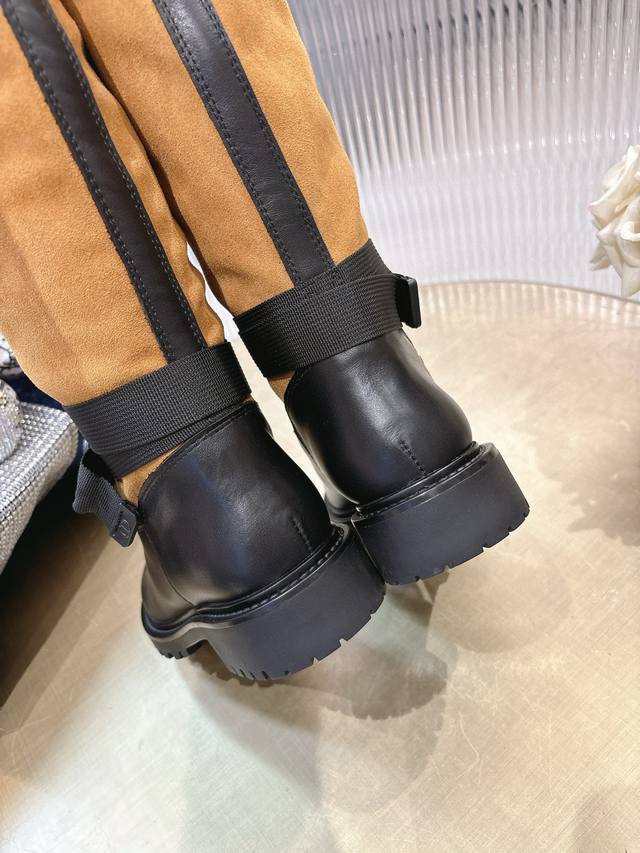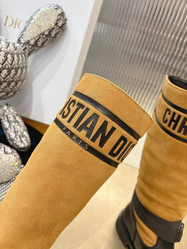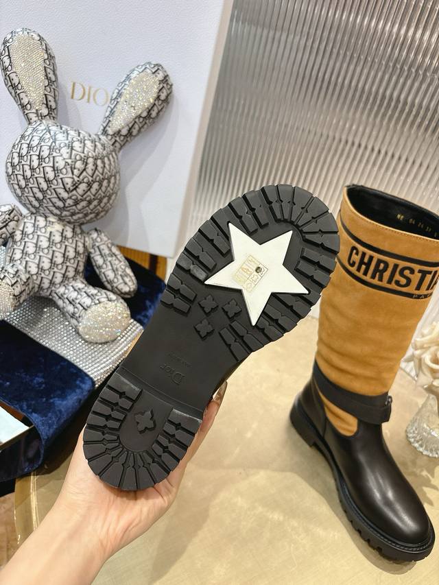 Top-tier Dior Major Embroidered Riding Boots with Leather and Mahogany Trim. These stylish boots feature a distinctive design element for a striking look. Crafted from black technical fabric and cowhide leather, they are easy to slip on and off. Inspired by the Dior Book Tote bag, they are adorned with a two-tone "Christian Dior" logo at the top. An adjustable nylon strap with the "Cd" logo and a wavy rubber sole create a striking silhouette. The boot shaft is decorated with the "Christian Dior" logo. The ankle is wrapped with a technical fabric strap and paired with a brass ring. The notched rubber sole is decorated with Christian Dior's lucky star symbol. Size: #35-40. Size 40 is custom-made and non-refundable.