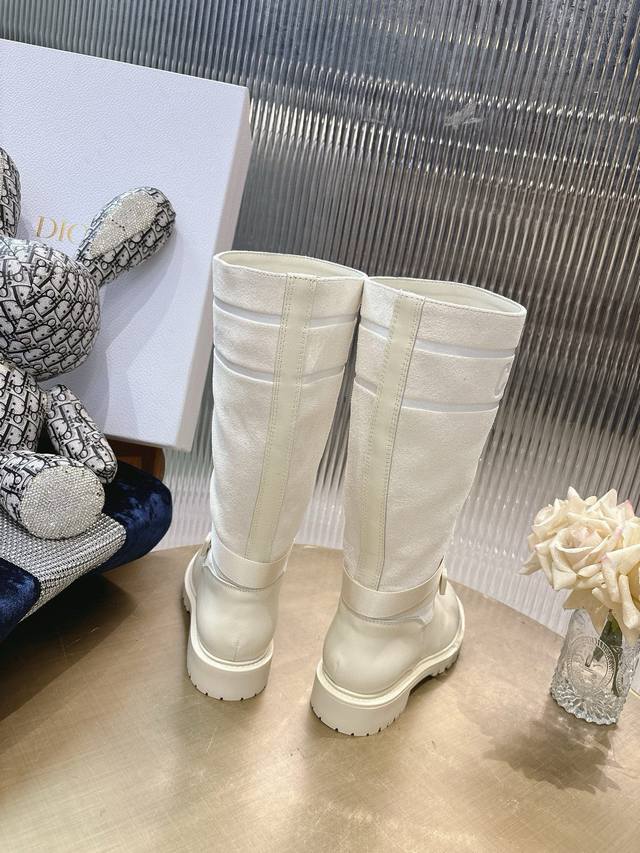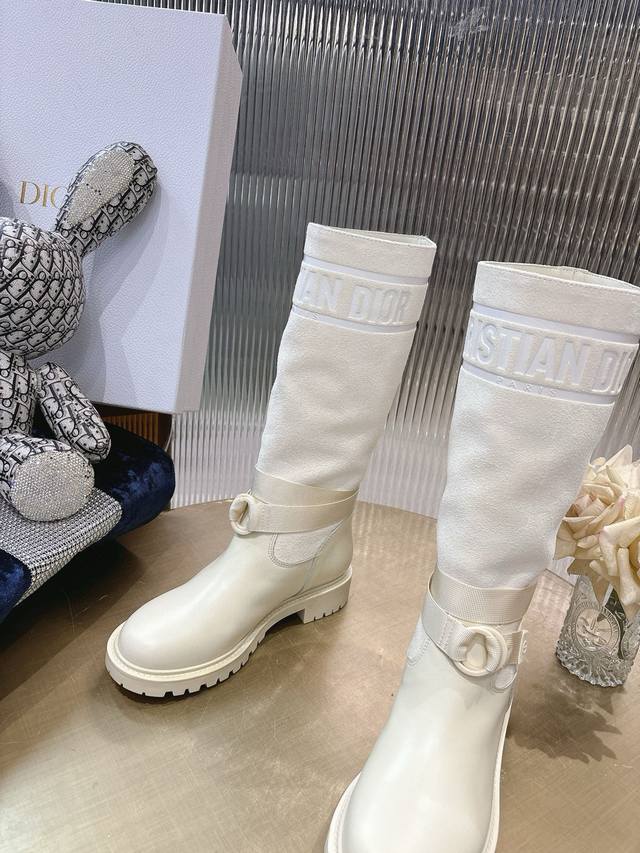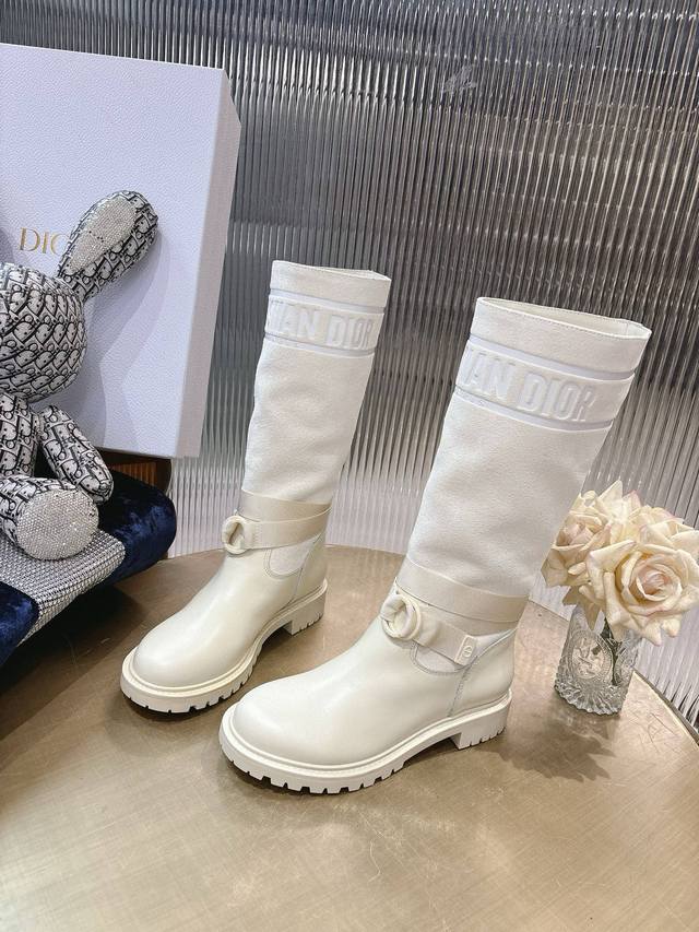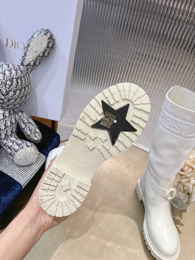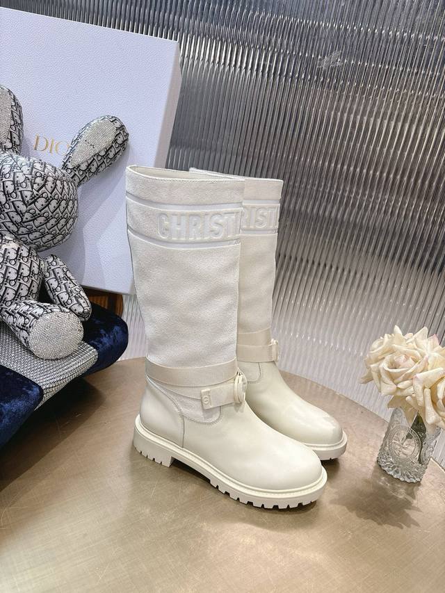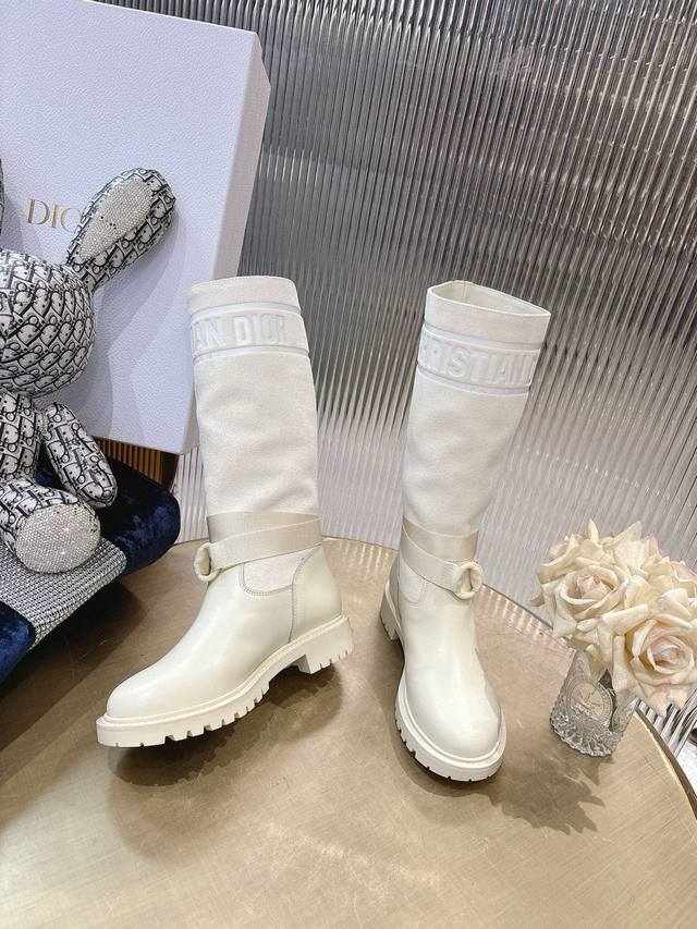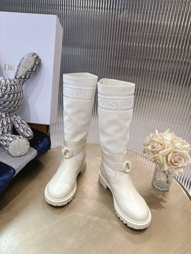 Top-tier Dior Major Embroidered Riding Boots with Leather and Mahogany Trim. These stylish boots feature a distinctive design element for a striking look. Crafted from black technical fabric and cowhide leather, they are easy to slip on and off. Inspired by the Dior Book Tote bag, they are adorned with a two-tone "Christian Dior" logo at the top. An adjustable nylon strap with the "Cd" logo and a wavy rubber sole create a striking silhouette. The boot shaft is decorated with the "Christian Dior" logo. The ankle is wrapped with a technical fabric strap and paired with a brass ring. The notched rubber sole is decorated with the Christian Dior lucky star symbol. Size: #35-40. Size 40 is custom-made and non-refundable.