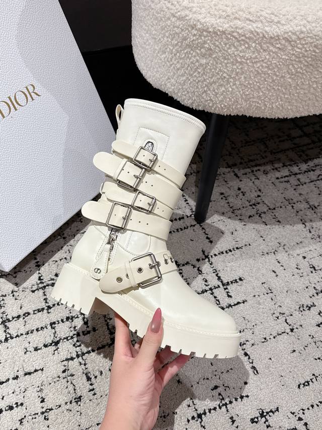 Dior 25 Fall/Winter new D-Fight mid-calf boots, brogue boots. A new addition to the 25 early spring ready-to-wear collection, showcasing haute couture charm. The black rubber-effect cowhide barrel design is accented with silver zipper details on the sides for added style. Paired with a thick yet lightweight notched sole, it adds a touch of glamour to this season's casual looks.