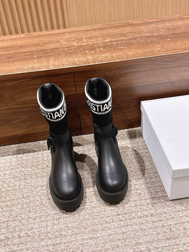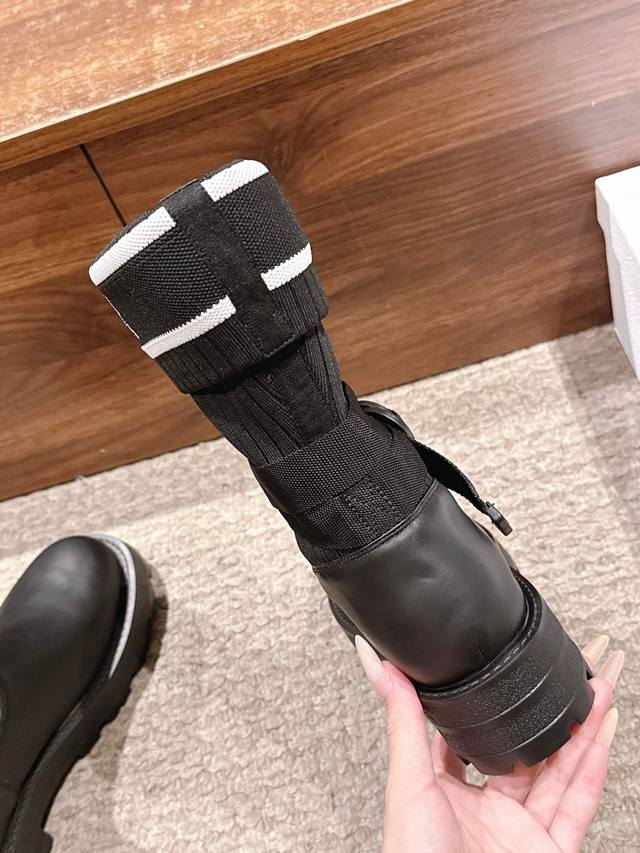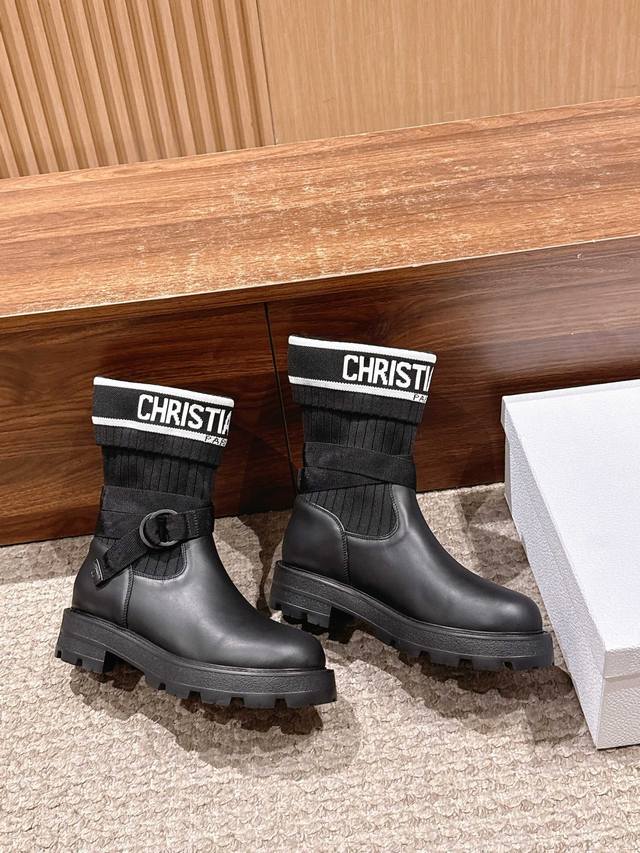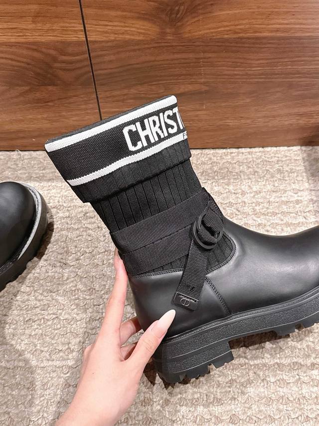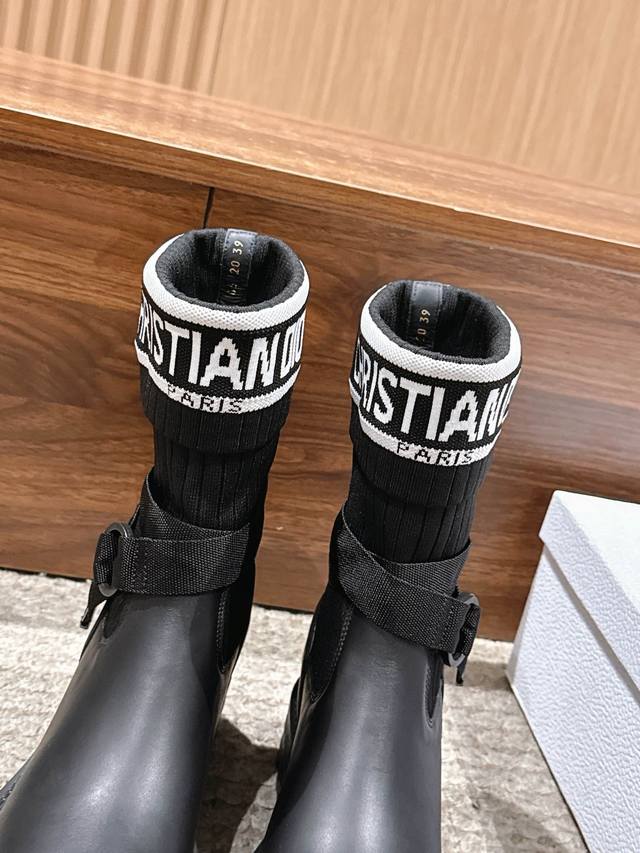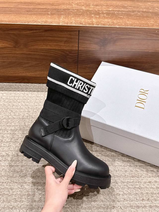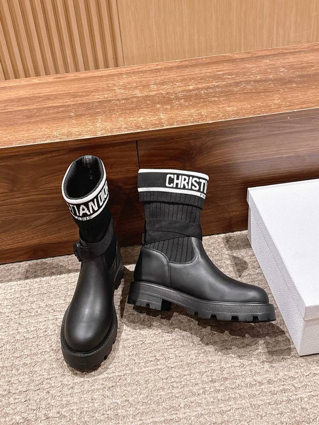 Upgraded Version# Dior New Sock Boots Ankle Boots Stretch Knee-High Boots DDD The boot body combines a leather sole with a knitted sock-like cuff. The leather part is structured and stylish, while the knitted cuff adds softness and elasticity, combining both coolness and comfort. A striking white "Christian Dior Paris" lettering webbing is printed on the upper of the sock cuff, enhancing brand recognition and becoming the visual focus of the look. DDD The boot body features buckle-style laces, enhancing practicality and adding a rugged workwear detail to the overall look; the platform sole provides both height and a retro feel. This boot is highly versatile and can be flexibly combined with clothing and accessories to suit different style needs, easily adapting to various occasions such as everyday outings, parties, or light work. DDD Upper: Cowhide Stretch Socks DDD Lining: Cowhide DDD Outsole: Original Mold Outsole DDD Size: 35-39 40 41 Sizes are custom-made and non-refundable DDD