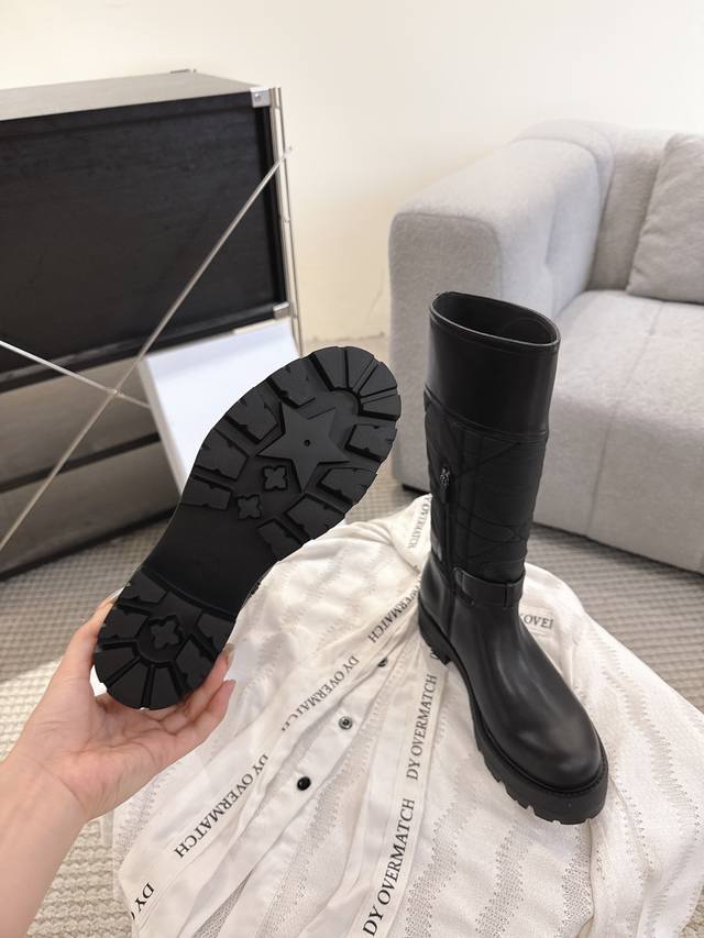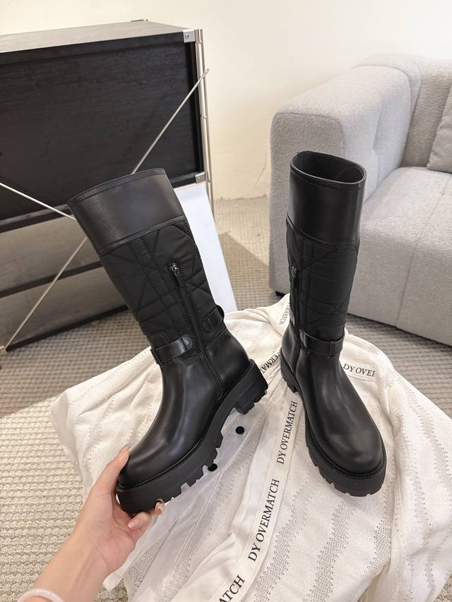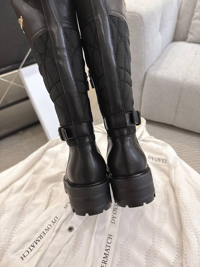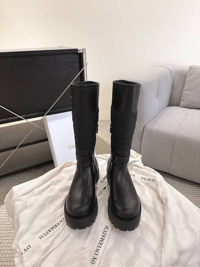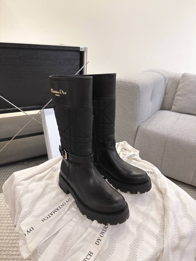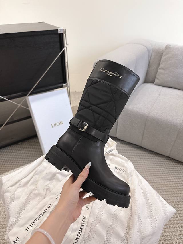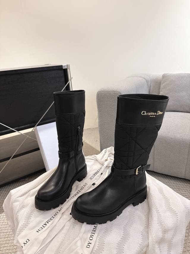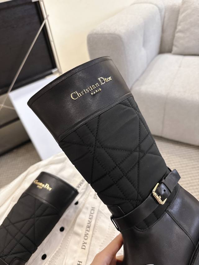 2025 Fall/Winter New Dior D-Town Boots Black Calfskin and Nylon with Cannage Pattern Embroidery Mid- Calf Riding Boots Classic Cd Logo Buckle Fabric Slip-on Straight Boots Ddd This D-Town boot is striking and stylish. The upper is made of black calfskin and nylon, with the nylon featuring cannage stitching. The sides are adorned with a gold-plated Christian Dior Paris logo and adjustable laces with buckles to elevate the look and accentuate the ankle. A thick, lightweight notched sole adds a fashionable touch to any outfit. Ddd Upper: Original calfskin, custom-made imported technical embroidered fabric Ddd Insole: Mixed cowhide Ddd Sole: Original mold TPU rubber outsole Ddd Size: 35-40 DDD