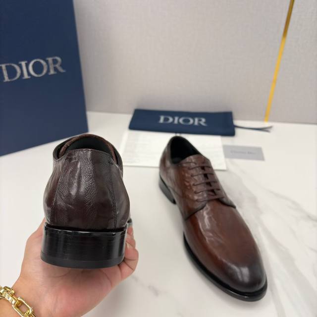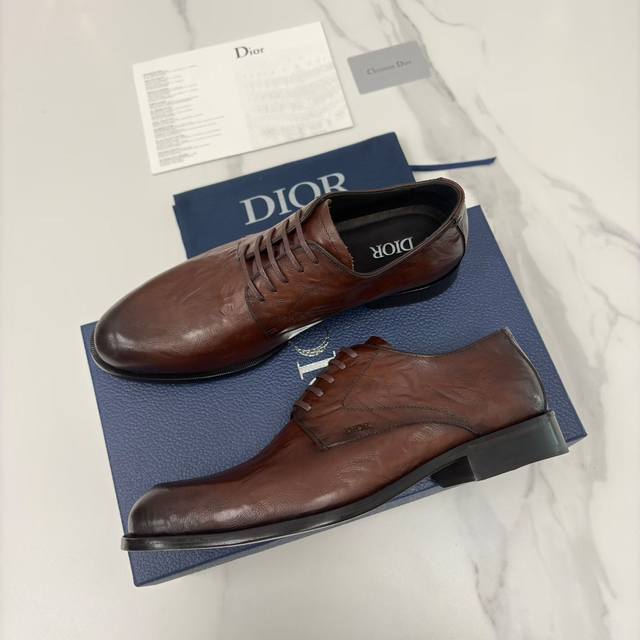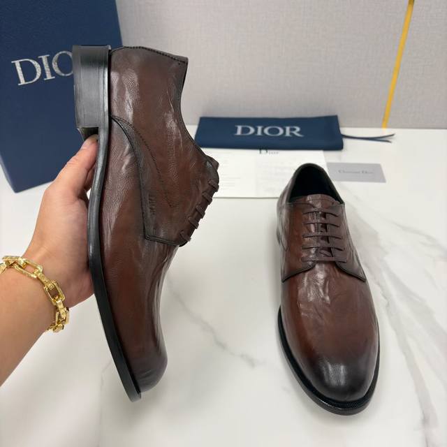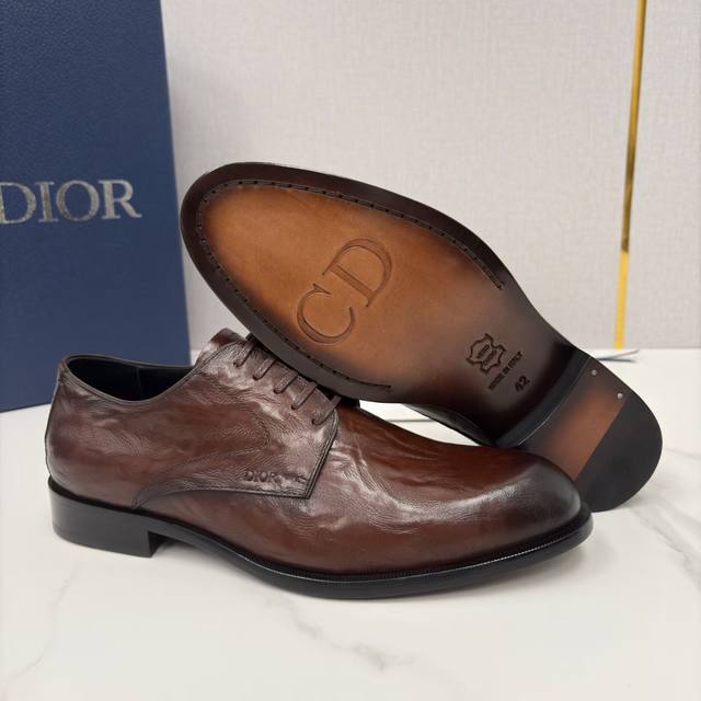 Dio*, a new men's dress shoe from Cd, the Timeless Derby, officially priced at RMB 128,380. This shoe fully showcases Dio*'s exquisite craftsmanship. It is meticulously crafted from imported glossy split-edge calfskin leather with a matte, hand-scraped, wrinkled texture, and features a water-dyed calfskin lining. The Italian genuine leather outsole with a composite rubber plate is adorned with a subtle "Dio*" logo embossed on the heel, while the tongue and insole feature the classic "Cd" logo, exuding a sense of understated luxury. The shoe's elongated pointed toe flatters the foot, creating a more streamlined look. The laces are made of a matching waxed material, and the heel is treated for slip resistance and durability. Some styles feature a wrinkled texture design, breaking the monotony of dress shoes and adding a touch of retro style. The classic lace-up closure is comfortable and elegant, perfectly complementing this season's sophisticated looks. It embodies the brand's luxury and exquisite craftsmanship. Crafted from select premium leather, these shoes boast a delicate touch and superior texture, undergoing multiple processes to ensure impeccable detail. The classic and sophisticated design, whether glossy or matte, easily adapts to various occasions, from business to formal. Exquisite brogues and meticulous stitching showcase a unique aesthetic taste, perfectly blending elegance and style. These Dior shoes are a must-have for those who appreciate quality, capable of handling both serious business settings and relaxed everyday looks. Without overly ostentatious design, they embody understated luxury through materials and details, offering both presence and comfort