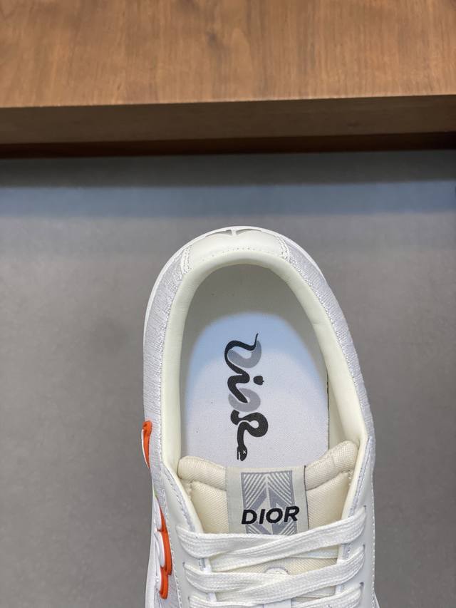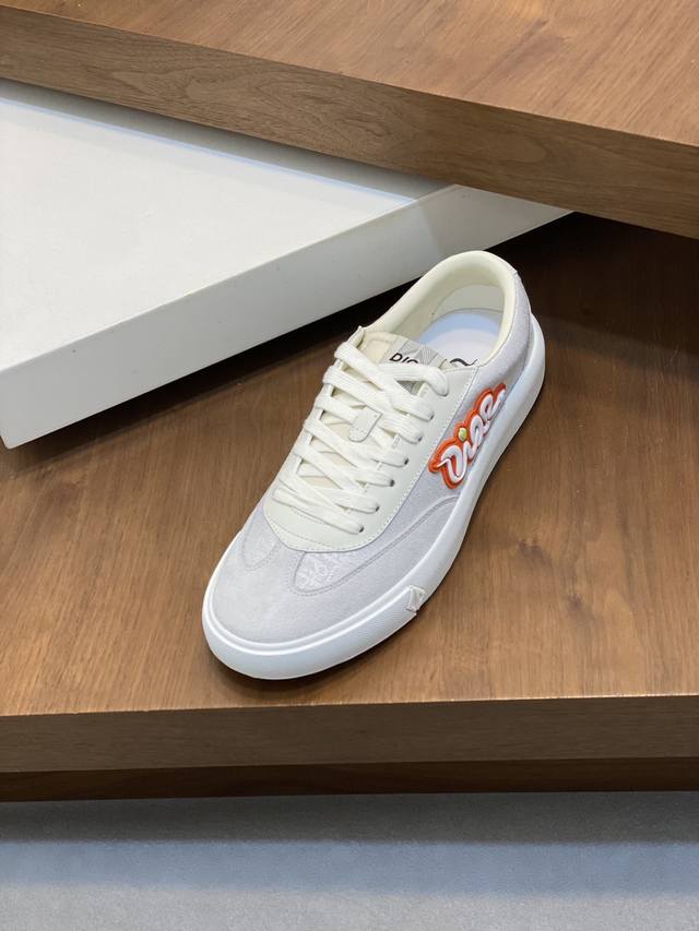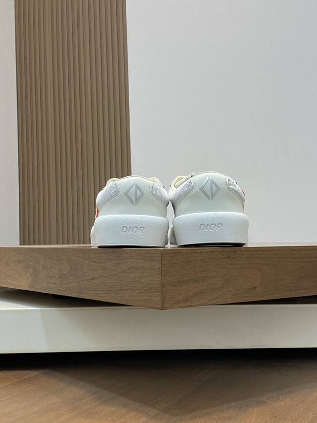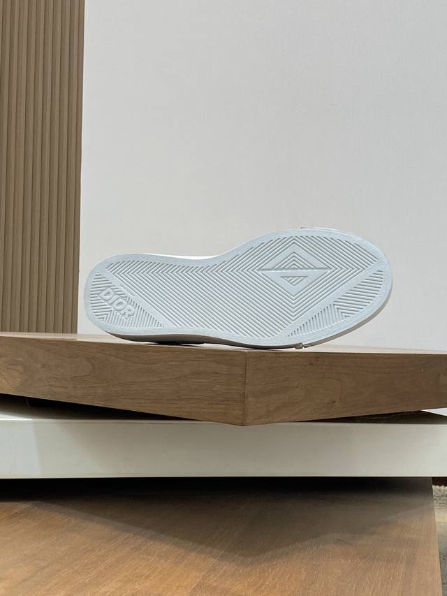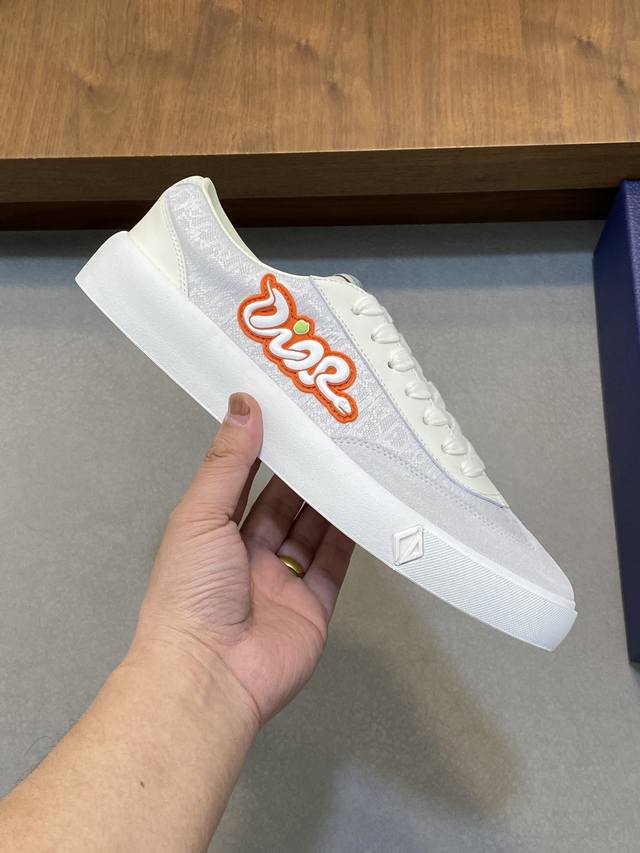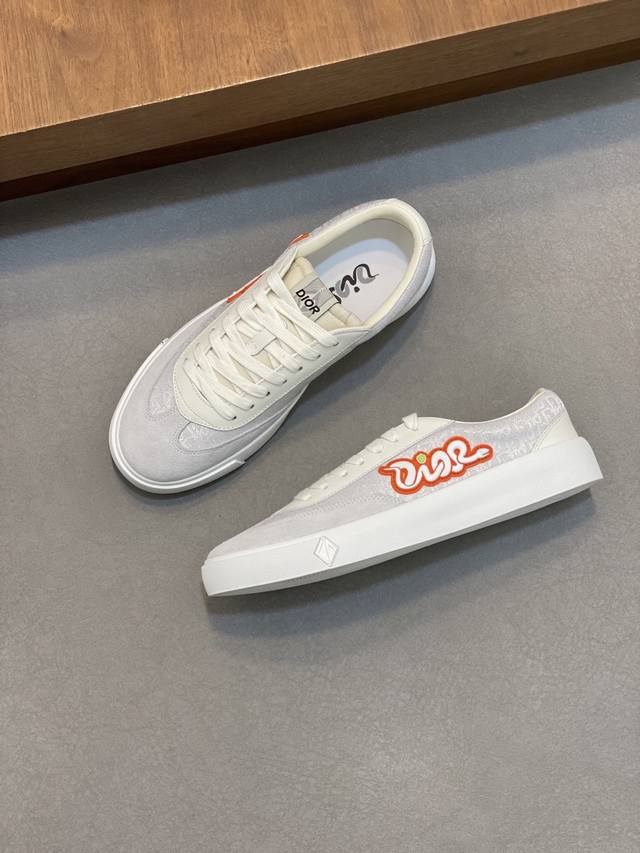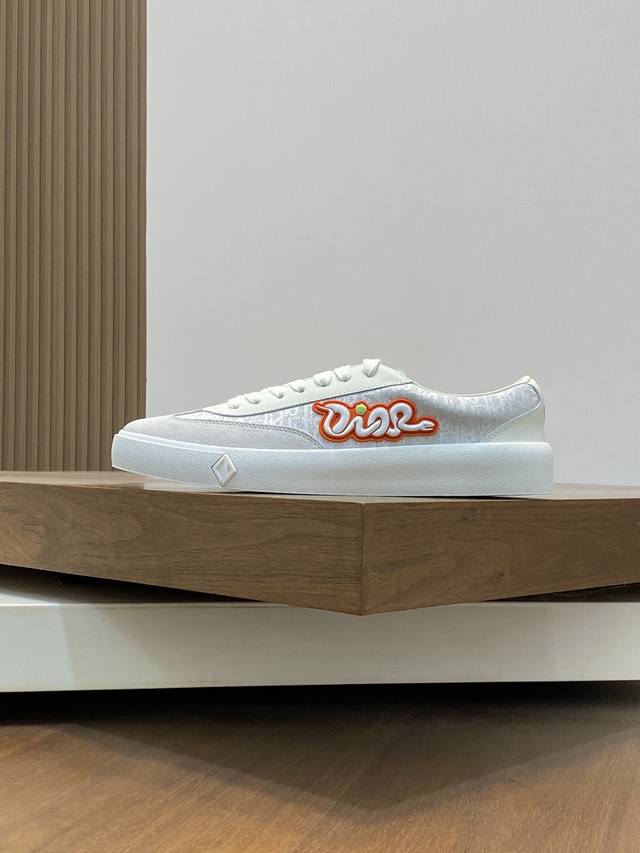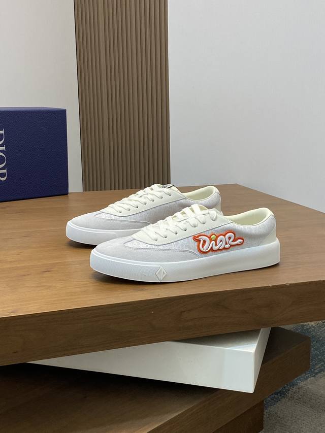 Dior's latest Dior x Denim Tears collaboration features casual sneakers and skateboard shoes. Originally purchased, developed, and crafted, these sneakers, a Fall 2023 release, reinterpret the classic tennis shoe with a sleek silhouette that emphasizes a sturdy feel. Crafted from navy and white jacquard with an Oblique print, they feature suede panels and a distinctive padded tongue embellished with an embossed Dior signature. They are finished with wide navy mohair laces and tonal brass eyelets with a matte finish. A white Dior Oblique rubber sole and a contrasting Dior 30 Avenue Montaigne logo on the rear add a touch of class. Can add fashion temperament to casual style