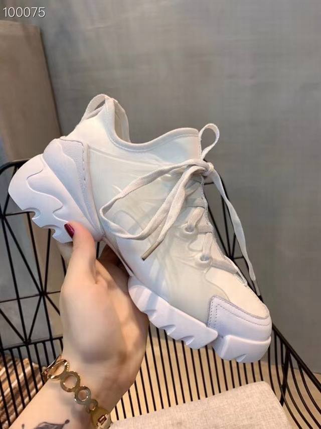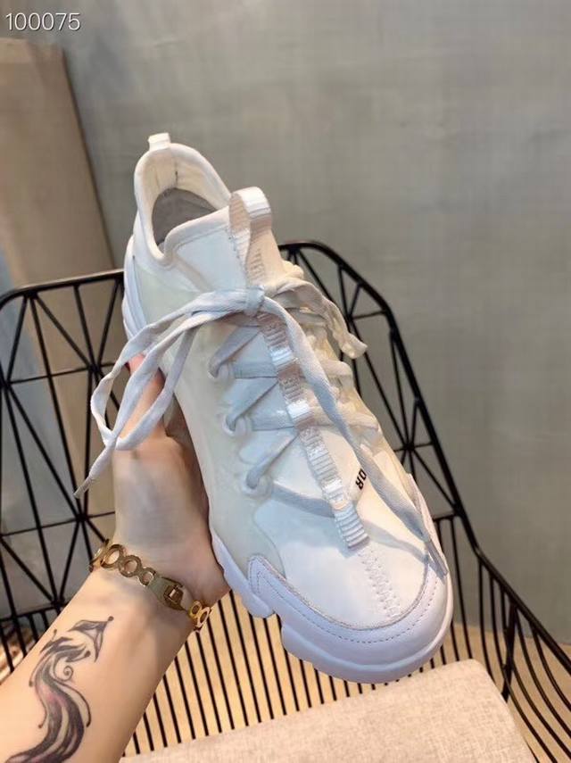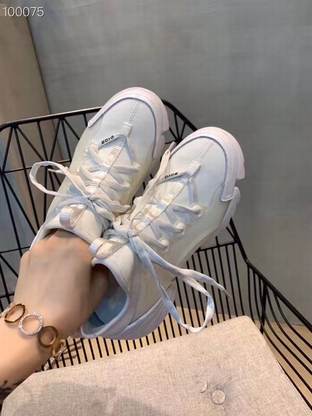 Dior's new collaboration is trendy and versatile, destined to be a hit! Upper: Exclusively custom-made, original pearl-shimmering PVC translucent film with Dior logo fabric. Outsole: Exclusively molded and identical to the original rubber outsole. Lining: Original knitted footbed. Includes exclusive packaging. The outsole features a full, solid, original stitching. Sizes: Women's 70-41, Men's 80-45; Style Number: Bem-65.