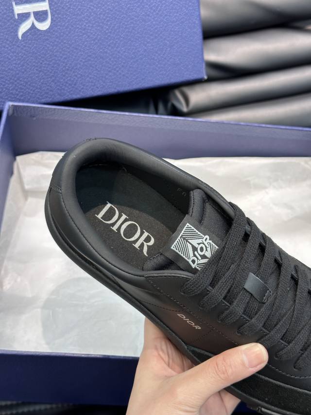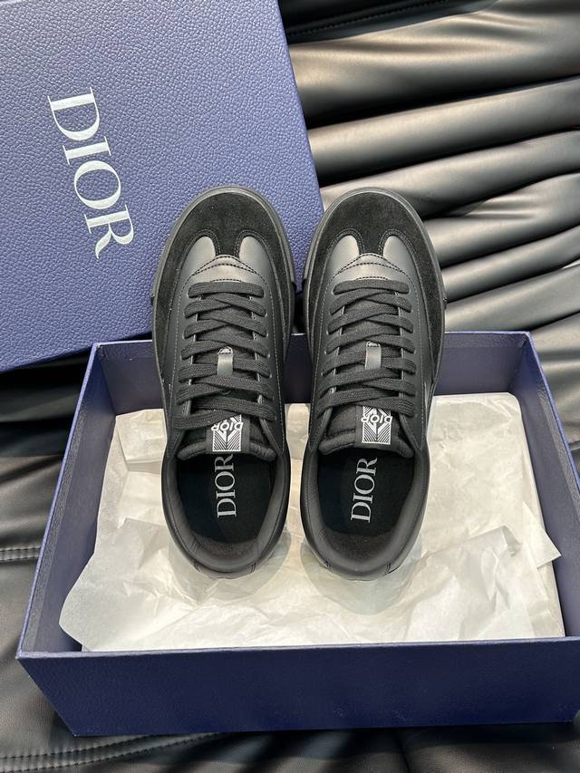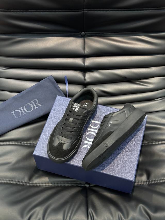 di~R low-top B101 casual sneakers are a wardrobe classic. Crafted from Dior original leather, they feature tonal smooth leather and nubuck panels. The padded tongue, heel, and sides are embellished with Cd Diamonds and the Dior logo. Paired with a white textured outsole, they pair perfectly with jeans or dress trousers for a casual look. Sizes: 39-44, 38, 45, 46. Made to order.