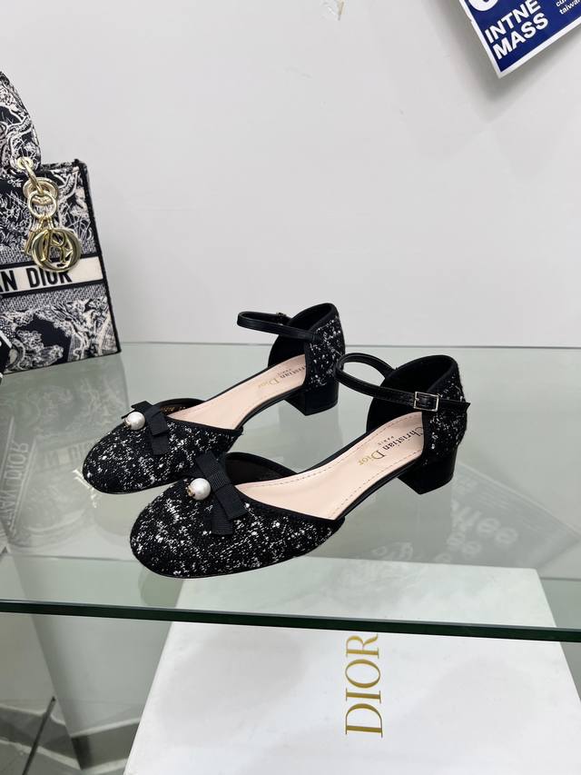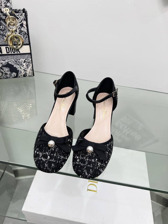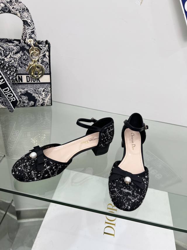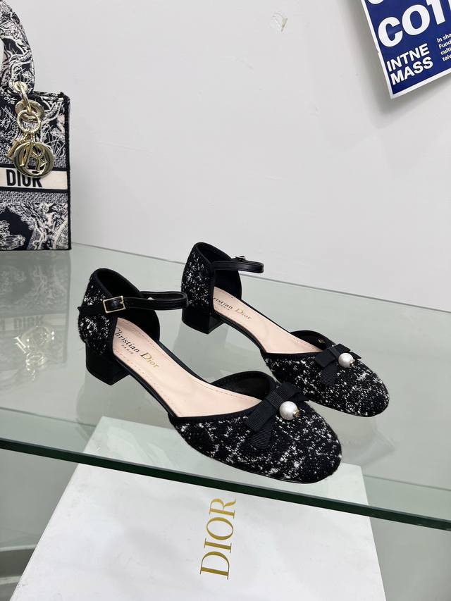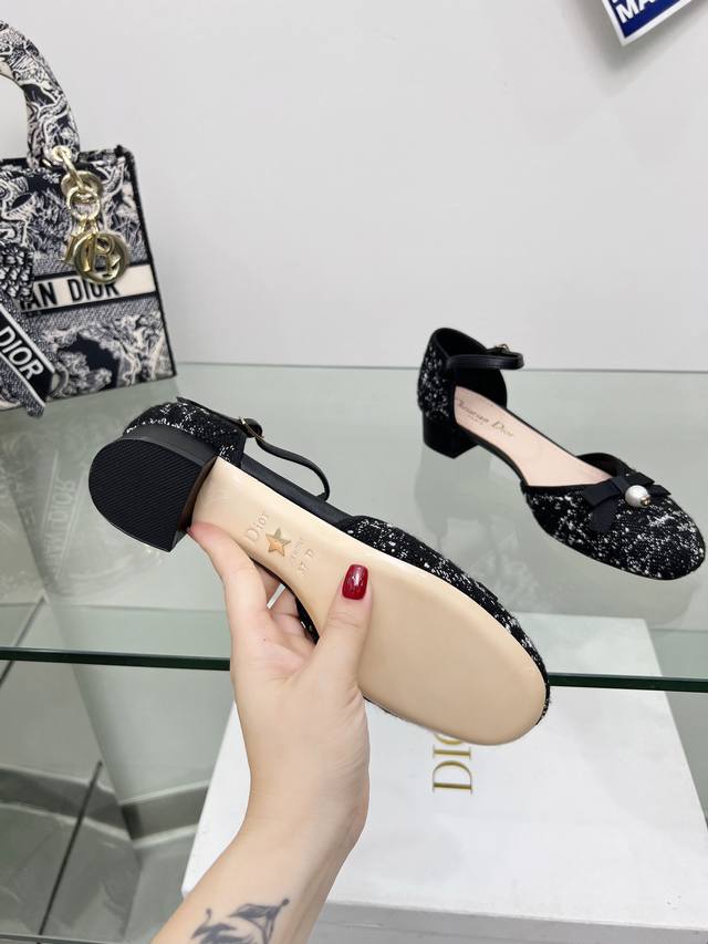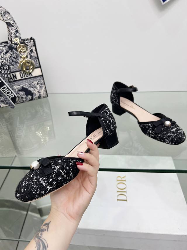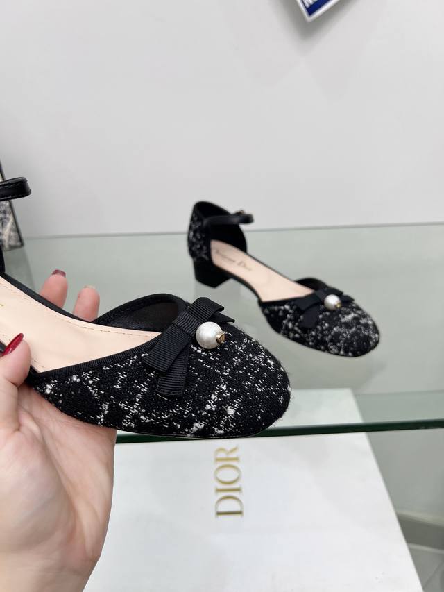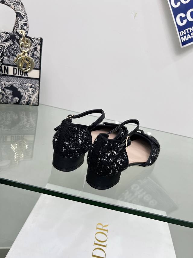 Factory direct. Dior Spring/Summer Haute Couture Collection New Ballet Shoes, Iconic Embroidered Cannage Pattern Low-Heel Ballet Flats, Cd Logo, Pearl Buckle, Chunky Heel, Bow Sandals. Material: Imported metallic sheepskin eco-friendly cannage tweed. Lining: Water-dyed sheepskin lining. Outsole: Italian genuine leather outsole. Heel height: 3.5cm, 5cm. Sizes: 34-43. Sizes 34, 40, 41, 42, and 43 are custom-made, non-refundable and non-exchangeable.