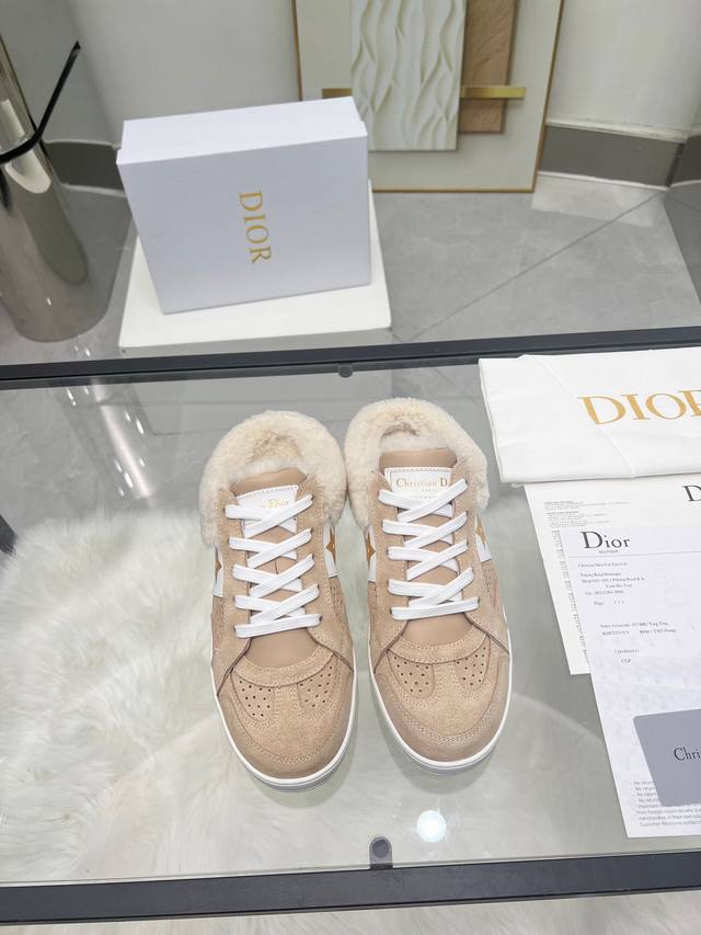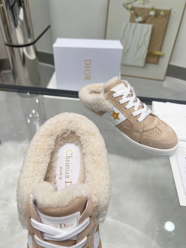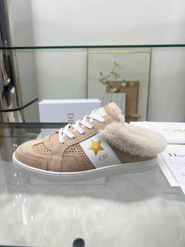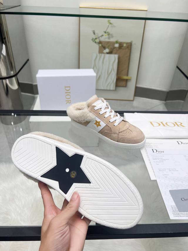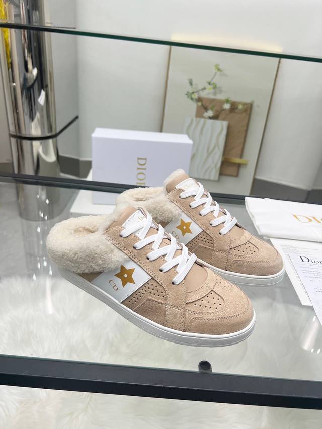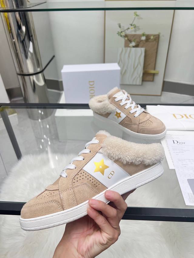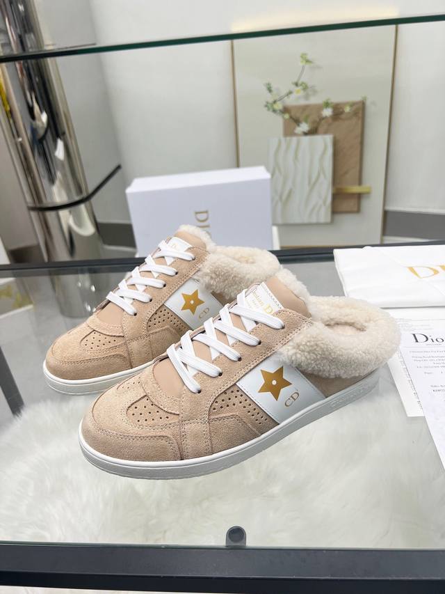 Factory direct price women's shoes and athletic shoes original single item. This Dior Star sneaker is a fashionable item that further enriches the collection. The open-heel design, paired with white lambskin-effect lining, highlights a unique style. The high-gloss beige suede cowhide upper is complemented by white cowhide inlays and other materials to enhance the style, adorned with a gold-plated Cd logo and star pattern. It features a lightweight and distinctive sole, making it light and comfortable, suitable for all seasons, and can be paired with various casual styles. Sizes: 35-41. Welcome to upload pictures to place orders.