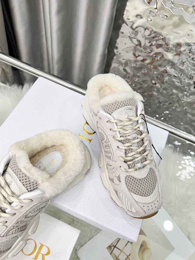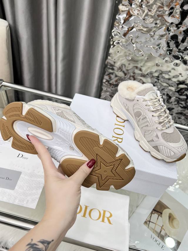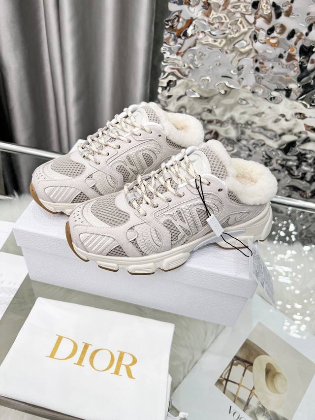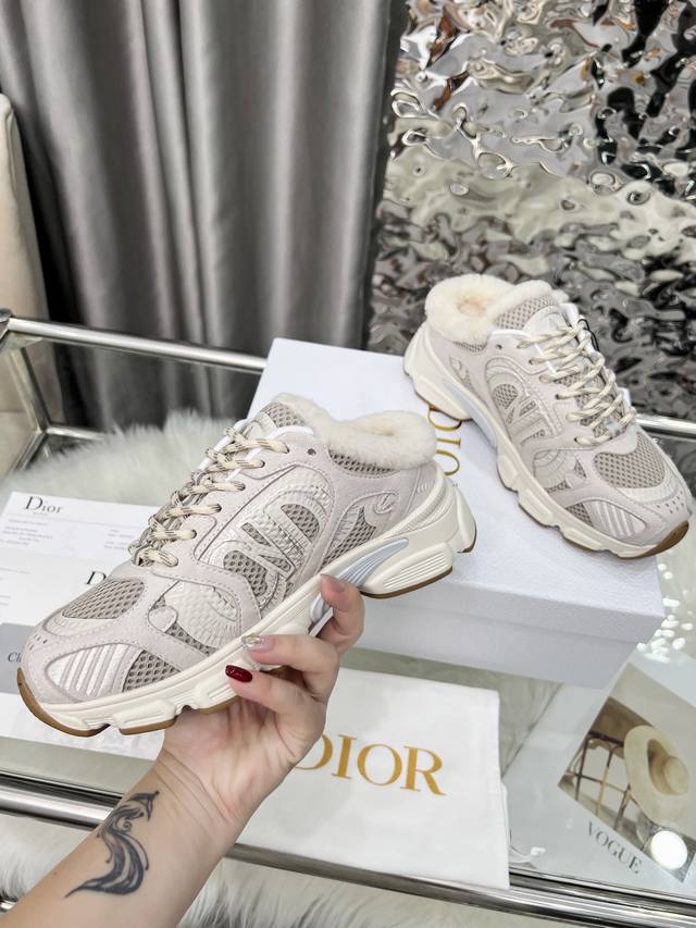 Factory direct price women's shoes and athletic shoes original single item. This Dior Chrono athletic shoe reinterprets running shoes with Dior's haute couture style. Beige mesh fabric is paired with tonal suede cowhide panels, and classic details such as the Cd logo on the side, star patch on the tongue, and Dior logo on the heel highlight its style. It features two-tone shoelaces, a lightweight sole with a star pattern, and is fashionable and versatile for winter. Price: P: P Lining: Wool Sizes: Women's 35-41, 35, 42 can be customized. Colors:
