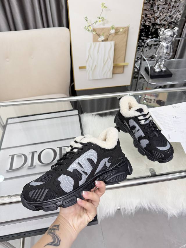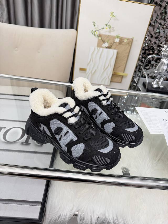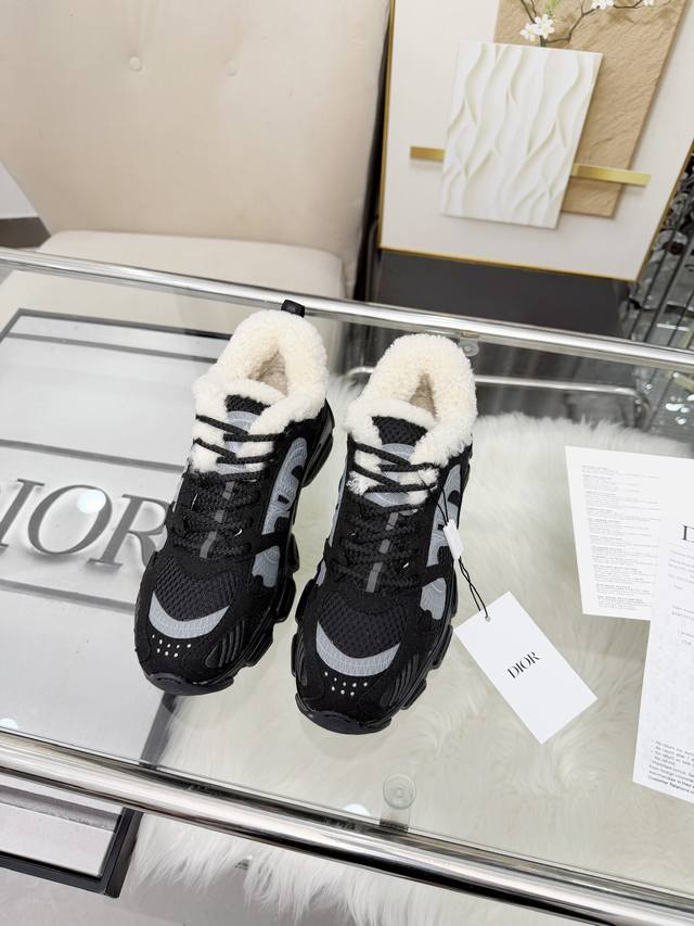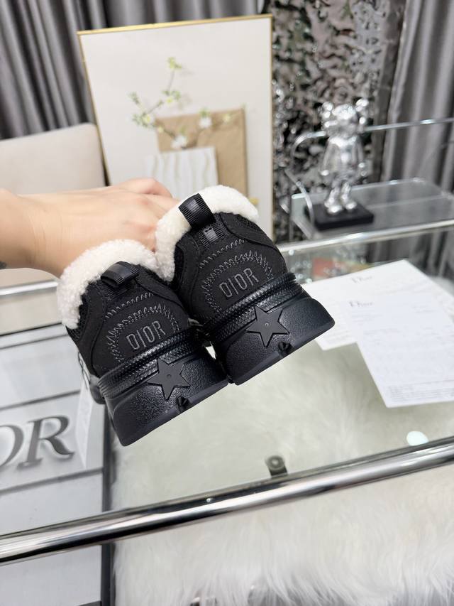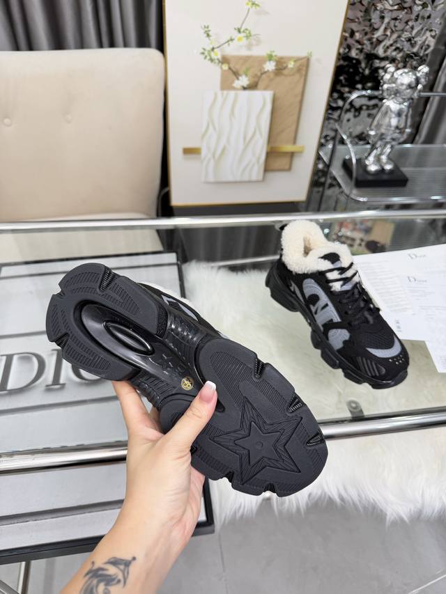 Factory direct price women's shoes and sportswear original single item, Dior official website new colors updated simultaneously. This Dior Chrono sneaker is from the Dioralps limited edition series, reinterpreting running shoes with Dior's haute couture style classic logos and open-heel design. Black mesh fabric is paired with tonal suede cowhide panels and white sheepskin shearling lining, adorned with classic details to enhance the style, including the Cd logo on the side, star patch on the tongue, and Dior logo on the back. It features two-tone shoelaces, an ultra-light sole decorated with stars, and can be paired with other Dioralps items. Price: P: P Lining: Wool Sizes: Women's 35-41