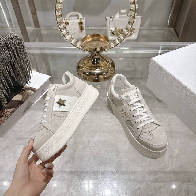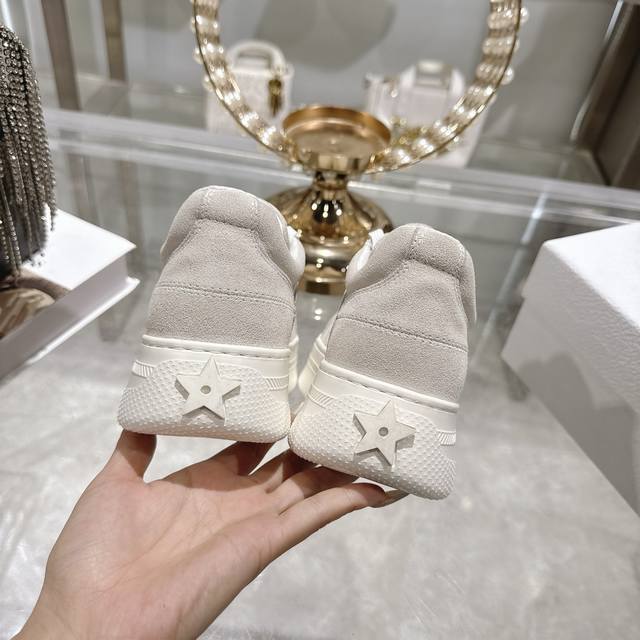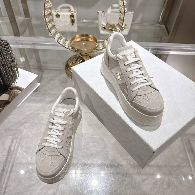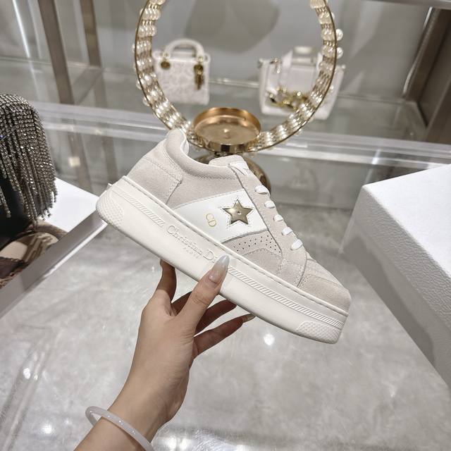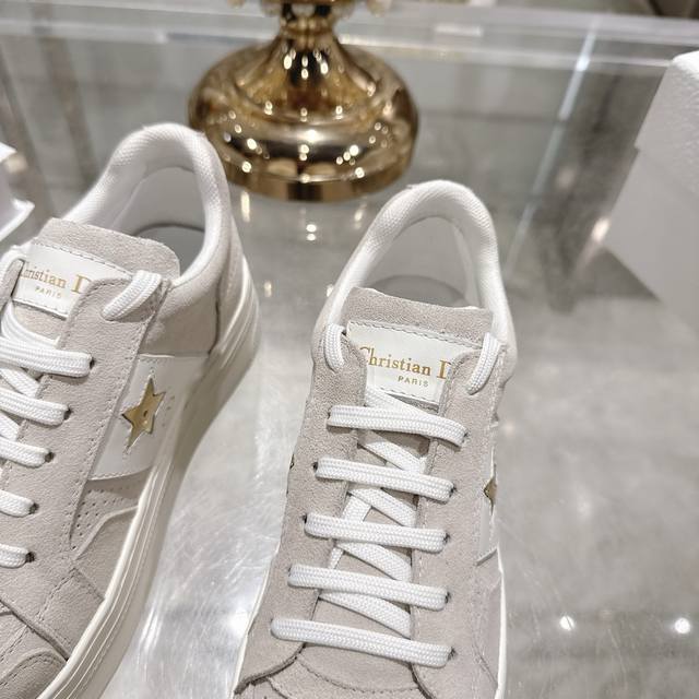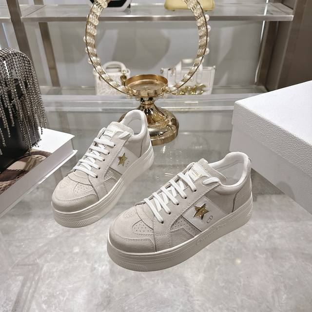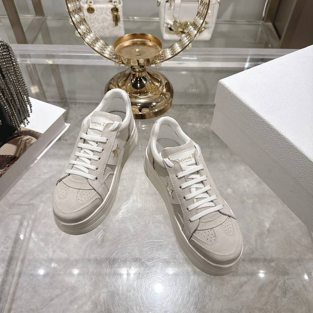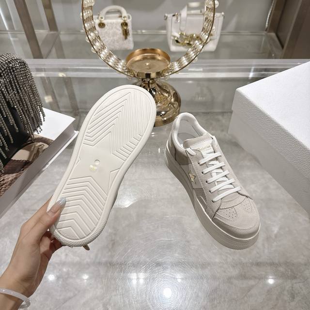 High-quality factory-made slippers, Dior 2025 new platform casual shoes. These Dior Star sneakers continue the timeless silhouette, crafted from premium cowhide leather for exceptional comfort. They feature toned suede accents with metallic star details on the eyelets, enhancing their style. The lightweight design, paired with the iconic "Christian Dior" logo and a thin sole, makes them suitable for all seasons and versatile enough to add a touch of elegance to any casual look. Classic and timeless design, cowhide upper with original IP sole. Sizes 35-41.