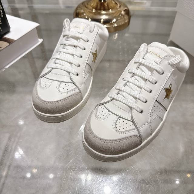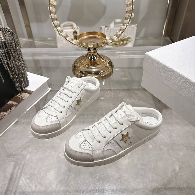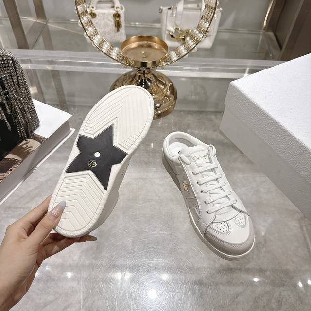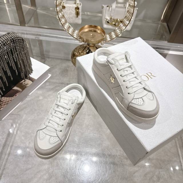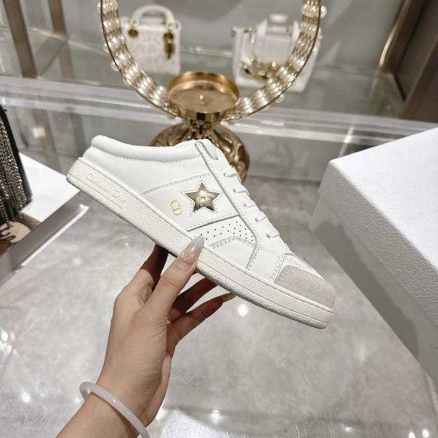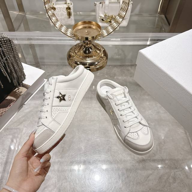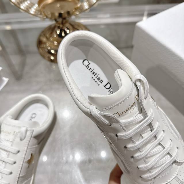 High-quality factory-made slippers, Dior 2025 new platform casual shoes. These Dior Star sneakers continue the timeless silhouette, crafted from premium cowhide leather for exceptional comfort. They feature toned suede accents with metallic star details on the eyelets, enhancing their style. The lightweight design, paired with the iconic "Christian Dior" logo and a thin sole, makes them suitable for all seasons and versatile enough to add a touch of elegance to any casual look. Classic and timeless design, cowhide upper with original IP sole. Sizes 35-41.