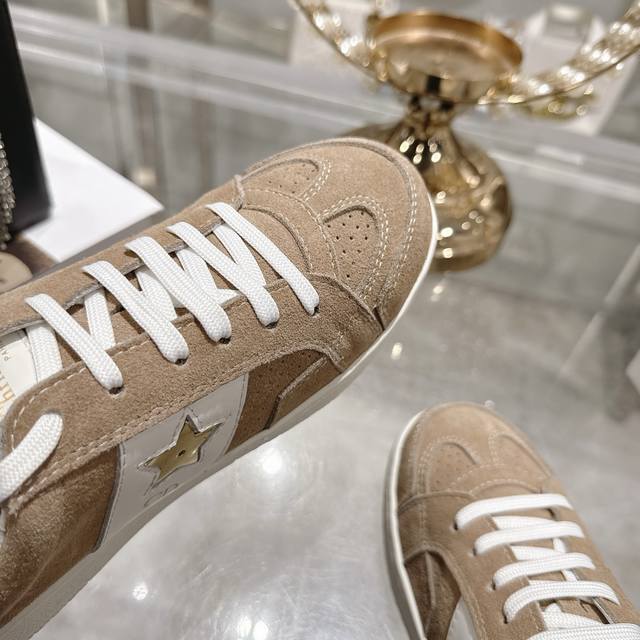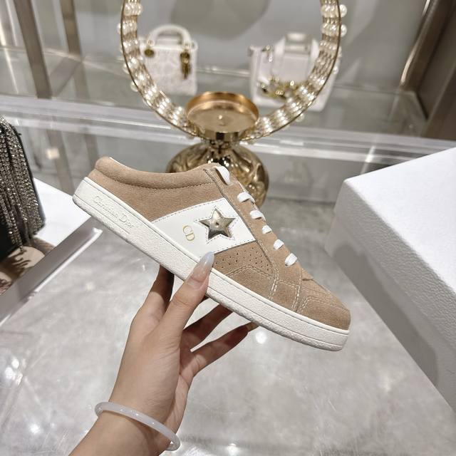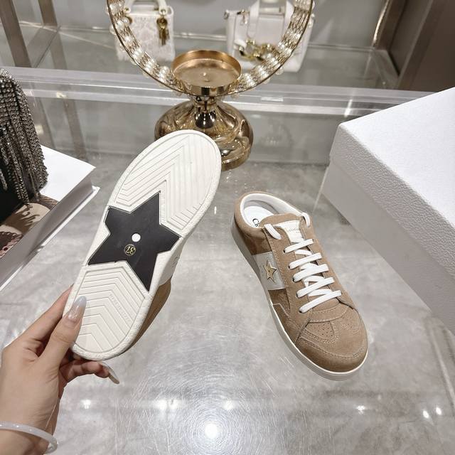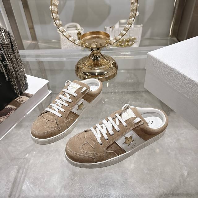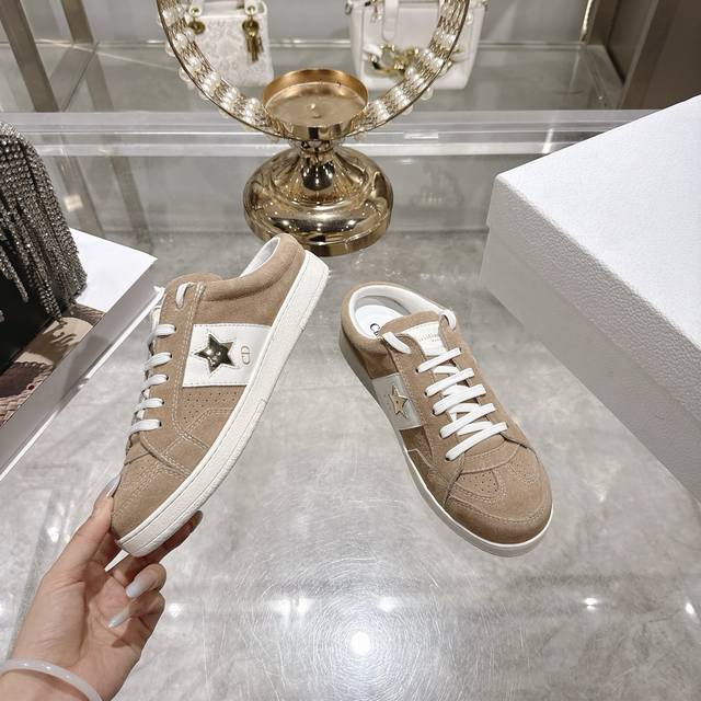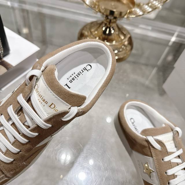 High-quality factory-made slippers, Dior 2025 new platform casual shoes. These Dior Star sneakers continue the timeless silhouette, crafted from premium cowhide leather for exceptional comfort. They feature toned suede accents with metallic star details on the eyelets, enhancing their style. The lightweight design, paired with the iconic "Christian Dior" logo and a thin sole, makes them suitable for all seasons and versatile enough to add a touch of elegance to any casual look. Classic and timeless design, cowhide upper with original IP sole. Sizes 35-41.