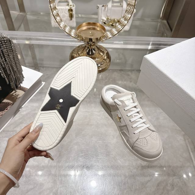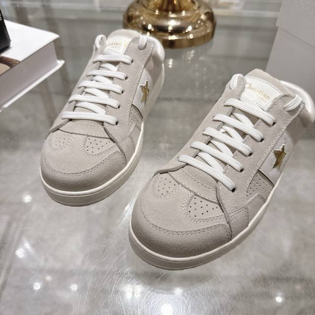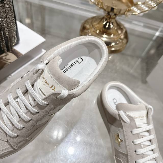 High-quality factory-made slippers, Dior 2025 new platform casual shoes. These Dior Star sneakers continue the timeless silhouette, crafted from premium cowhide leather for exceptional comfort. They feature toned suede accents with metallic star details on the eyelets, enhancing their style. The lightweight design, paired with the iconic "Christian Dior" logo and a thin sole, makes them suitable for all seasons and versatile enough to add a touch of elegance to any casual look. Classic and timeless design, cowhide upper with original IP sole. Sizes 35-41.