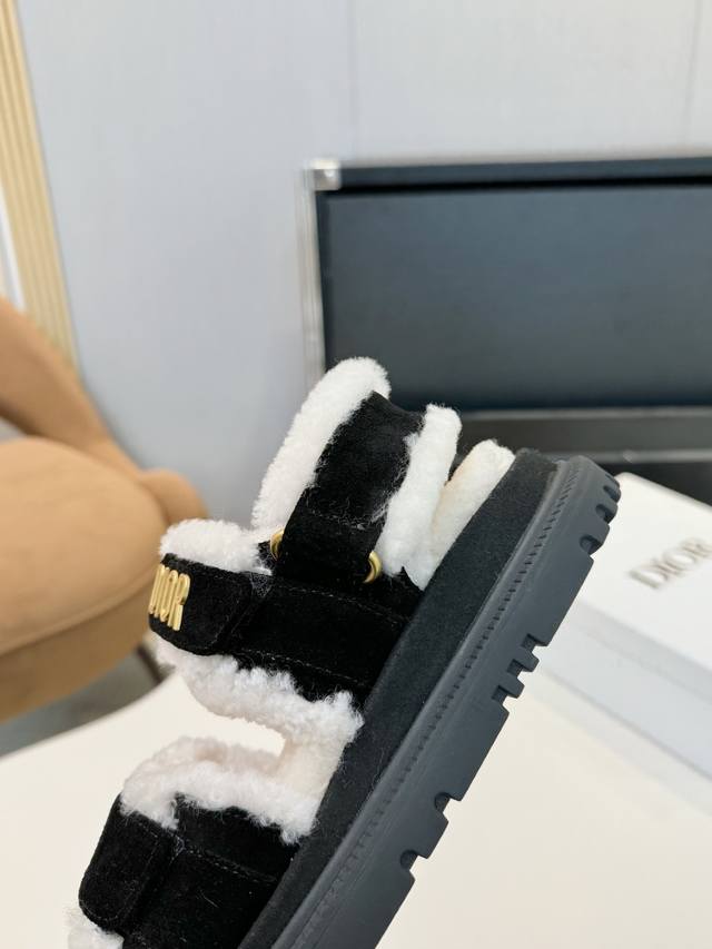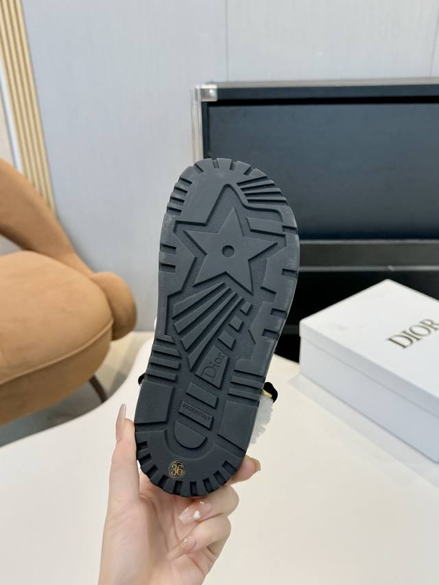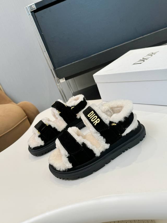 These Diorac sandals are reinterpreted with a beige suede sheepskin upper and white shearling lining for a stylish silhouette. The comfortable, form-fitting sole features Velcro straps, while the upper straps are adorned with a gold-tone Dior logo for added sophistication. Versatile for various looks, showcasing a modern style. Upper Material: Sheepskin Leather Lining: Australian Wool Sizes: 35-40, 41, 42 (Custom Made) Gold-tone Dior Logo Two Adjustable Velcro Straps Form-fitting Shearling Insole Soft and Lightweight Eva Textured Outsole Notched Outsole with Christian Dior's Lucky Star Symbol Made in Italy