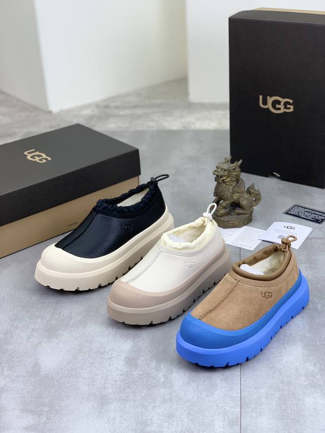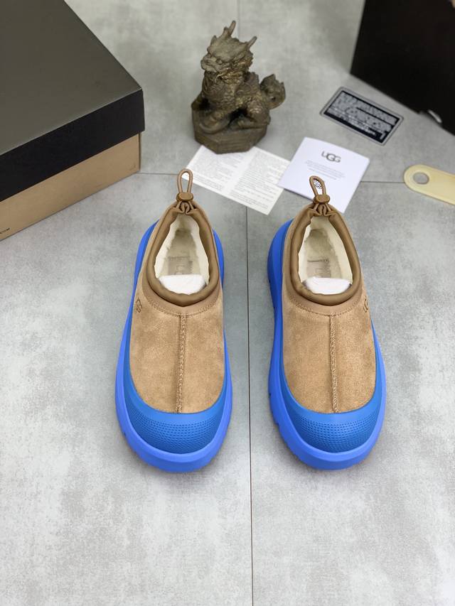 Factory direct price, real price for couples' Ugg Tasman Weather Hybrid slip-on snow boots. Wang Yibo's signature style. The classic Tasman silhouette features a striking orange sole and color-blocked design. Made with eco-friendly, waterproof, and snowproof materials, it combines style and functionality. Pair it with the new Ugg Keane fur-trimmed color-blocked jacket for a vibrant orange and chestnut color combination, creating a new light outdoor style and a fresh early autumn travel experience. Made with premium materials, the 17mm shearling surface is warmer and more breathable, and the outsole has been upgraded to a lightweight and durable LightWing technology outsole! Size: Men's and women's 35-45. Available in 3 colors.
