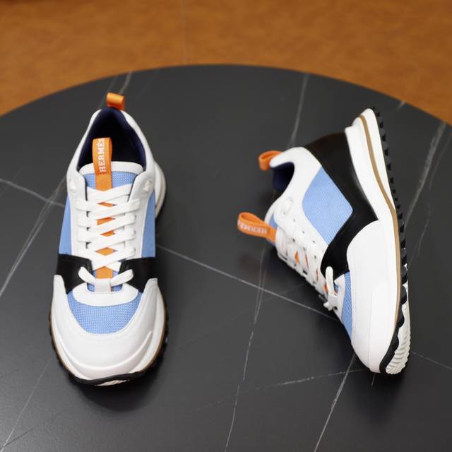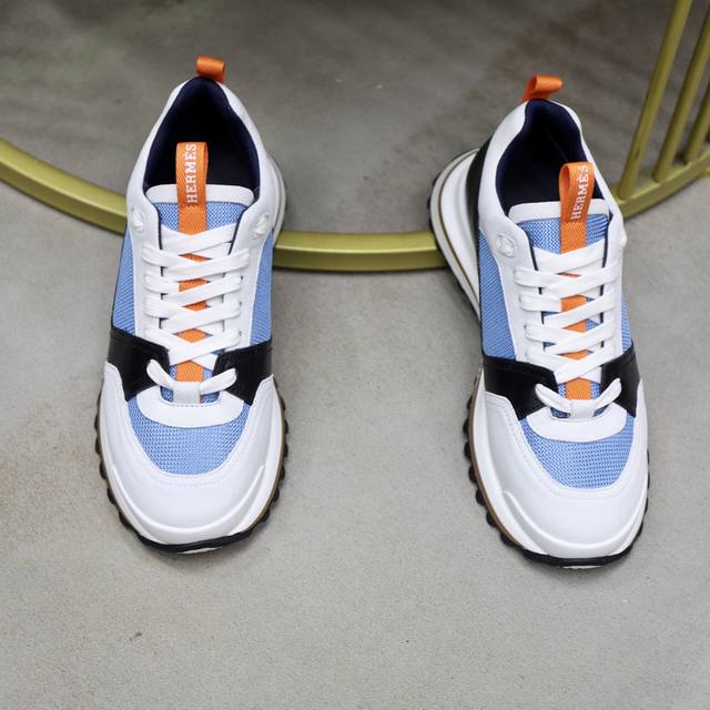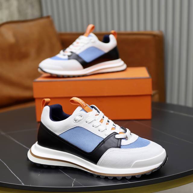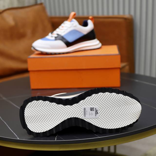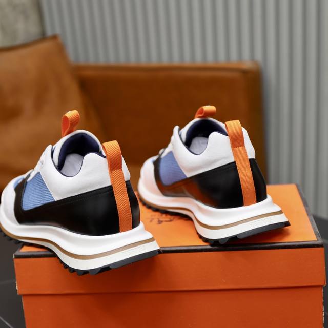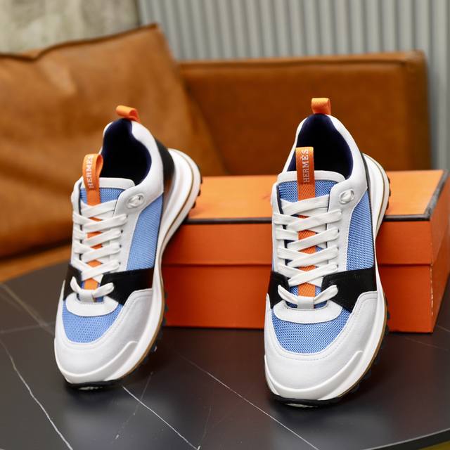 Factory Price: Hermes Leader Sneakers! Multi-color patchwork high-tech twill, calfskin, and suede goatskin sneakers. Lightweight geometric sole for a stylish urban look. Product Details: White and orange rubber sole; Black rubber sole with orange rubber inlays; Light natural leather inlays; White rubber toe cap; Leather insole; Mesh insole and lining; Cotton straps with rubber lettering; Sole height: 4cm; Sizes: 39-40-41-42-43-44; 38.45 (Custom made).