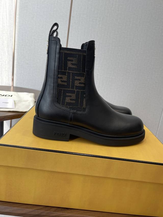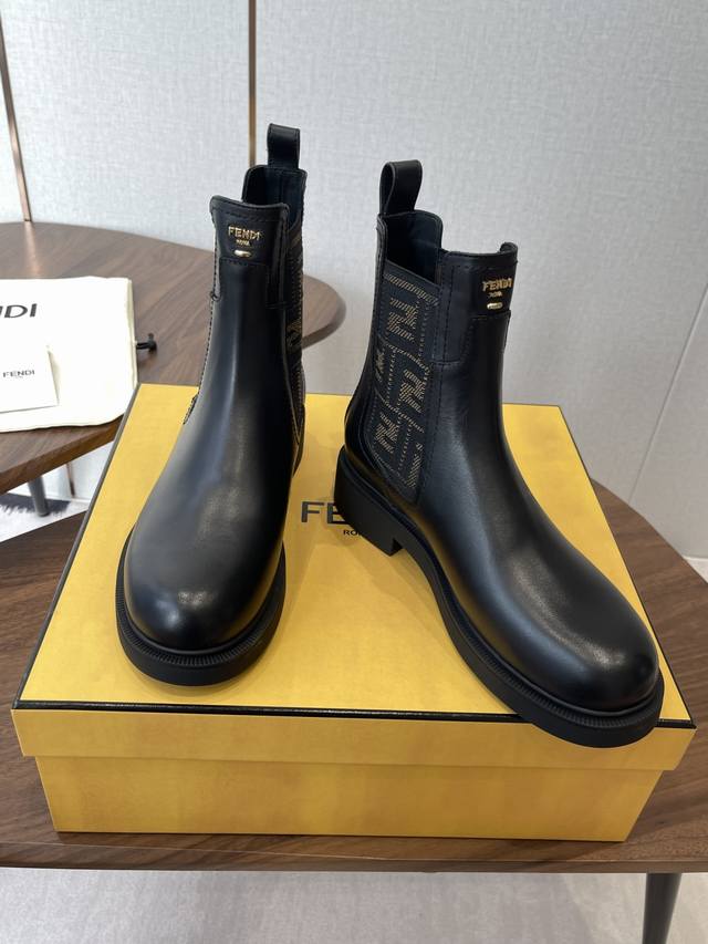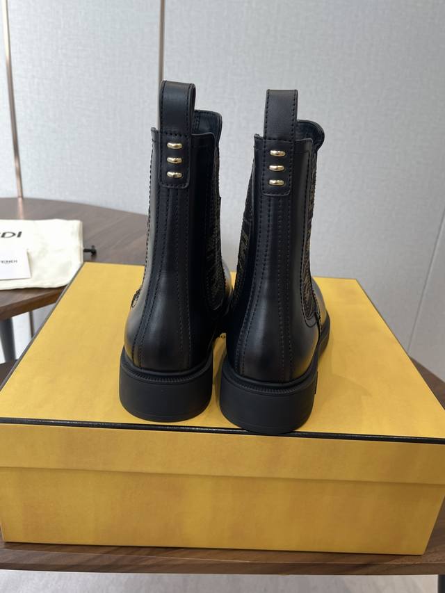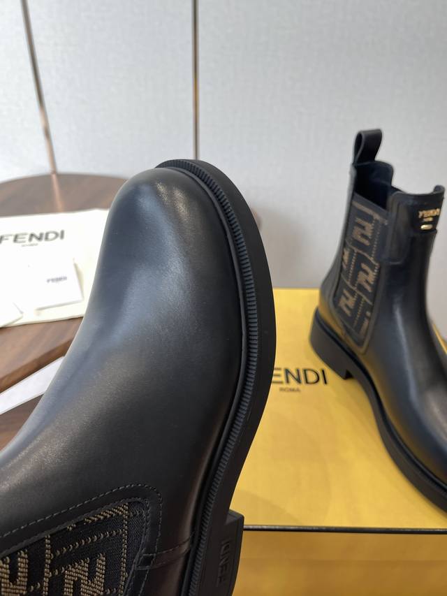 Dongguan-made Fendi Filo Monogram Chelsea Leather Motorcycle Boots (Model 25) These Fendi ankle boots perfectly capture the classic monogram pattern and sleek ankle boot silhouette, instantly giving you a sophisticated and relaxed look! The black leather exudes a cool and edgy vibe, while the monogram patchwork design instantly elevates your style. The slip-on design is perfect for those rushed mornings and commutes