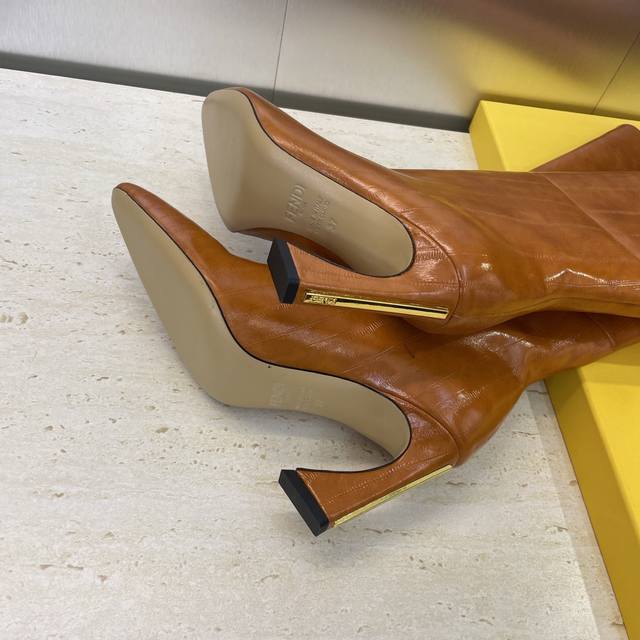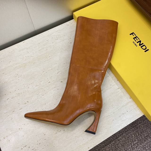 Fendi. 2025 Fall/Winter new collection, women's high boots with celebrity logos. Knee-high motorcycle boots with pointed heels and candy-colored slip-on Martin boots.