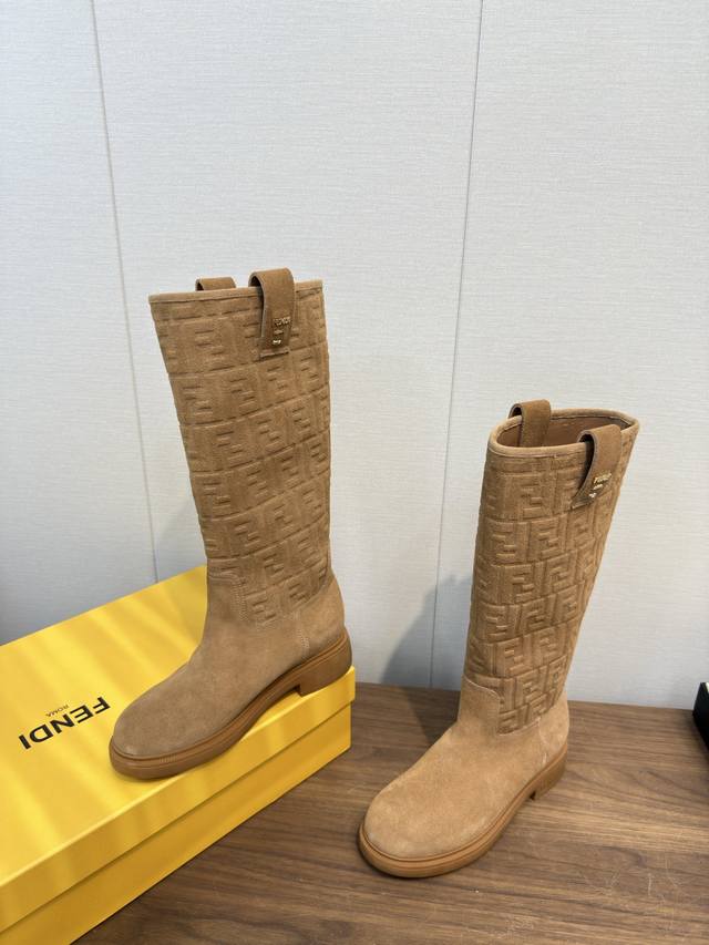 Fendi 2025 Autumn/Winter New Mid-Length Boots, Straight Boots, High Boots, Suede Boots. Fendi has released another beautiful boot! Made of top-grain cowhide with the classic Fendi monogram, featuring embossed cowhide leather with full edge finishing, and a stylish high-frequency embossed biker design on the back. Very comfortable to wear, with a durable sheepskin lining and a 3.5cm thick outsole. The original design is excellent and incredibly flattering! A must-have for winter! Sizes: 35-41, 40 and 41 are custom-made and non-refundable.