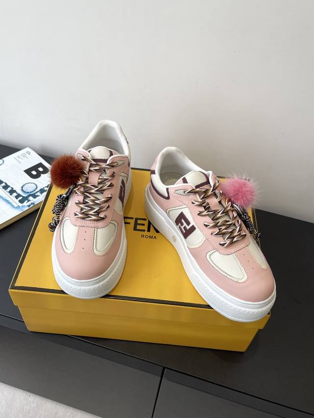 Fendi 25Ss Thick-Soled Match Series Casual Sneakers. Original purchase and custom manufacturing. The Fendi Match is the first sneaker designed by Kim Jones, and is similar in shape to the Louis Vuitton Trainer basketball shoe. The upper features a combination of suede and leather, with a raised double F logo on the side. The lining is made of terry cloth, making it super soft, lightweight, and comfortable. Pairs well with a hoodie for a youthful look. Original custom-made imported top-grain cowhide leather, imported custom-made breathable mesh lining, and original molded ultra-lightweight foam sole. 5cm sole thickness. Sizes: 35-41. Sizes 40 and 41 are custom-made and non-refundable.