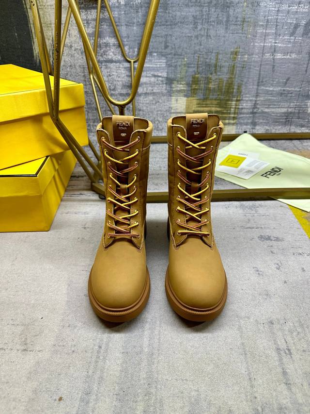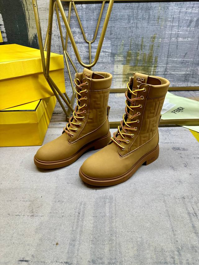 Fendi Filo round-toe lace-up military boots. Light brown waterproof suede upper with tonal embossed Ff pattern. Two-tone hiking lace-up closure with metal eyelets. Gold buckle on the back. Rubber sole with Fendi logo on the side of the heel. Sizes 35-42. (DDD)