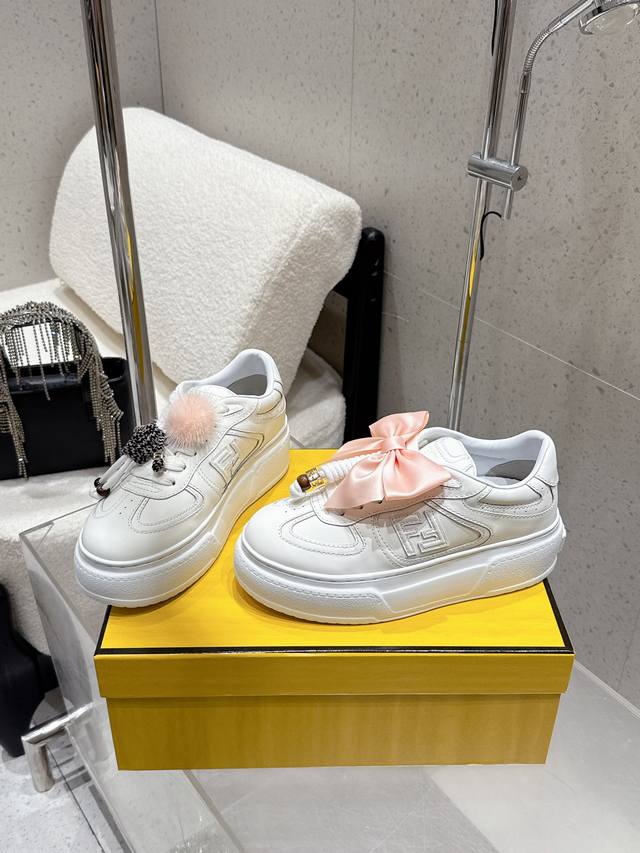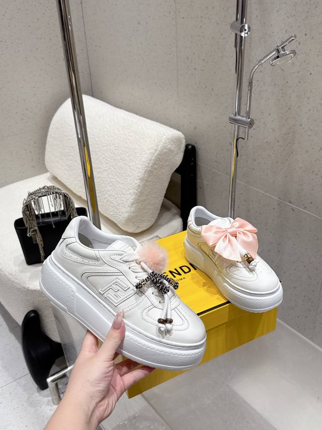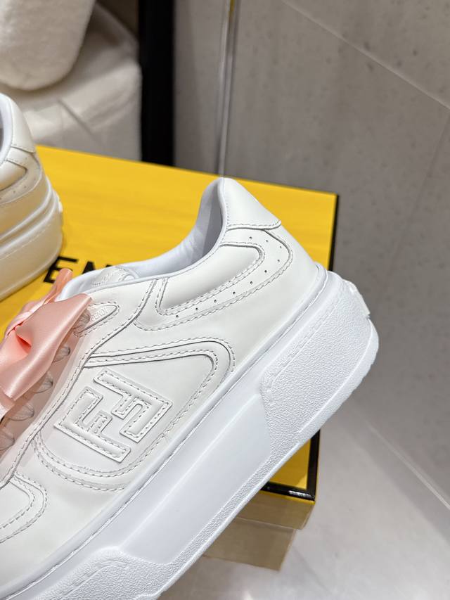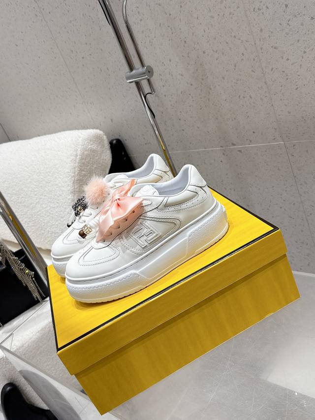 Fendi latest platform sneakers, full leather upper, casual sports shoes. Upgraded new model with full leather patchwork, fresh design, retro style, super good-looking and versatile. Features a combination of rubberized cowhide upper, raised double F logo on the side, breathable sheepskin lining, lightweight and comfortable, original TPU outsole, 5cm height. Sizes: 35-40. 40 custom-made.