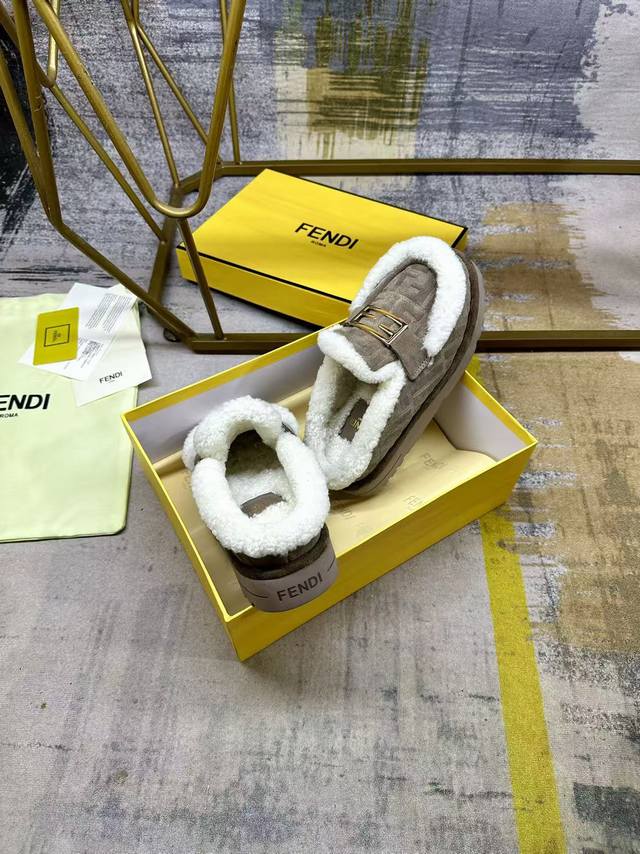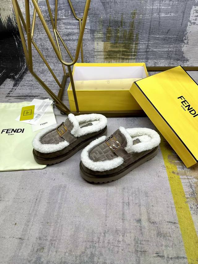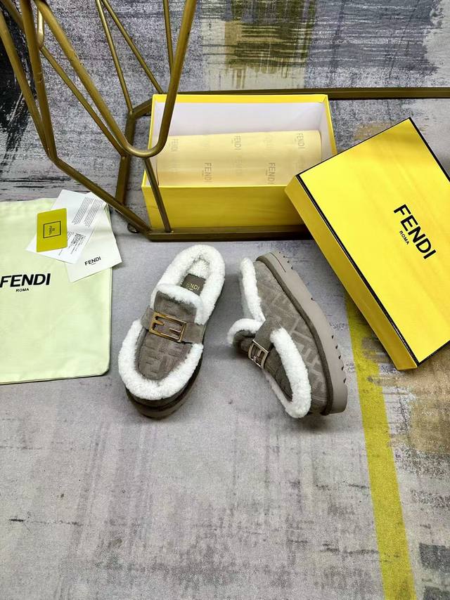 Fendi's latest casual round-toe flat mules. Made of grey suede with a tonal embossed Ff pattern. White wool lining and trim. Features gold-plated Baguette hardware. Thick, tonal, non-slip sole with Fendi logo on the heel. Women's sizes 35-40, Men's sizes 39-45.