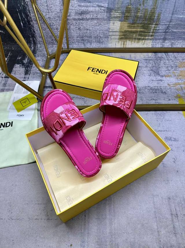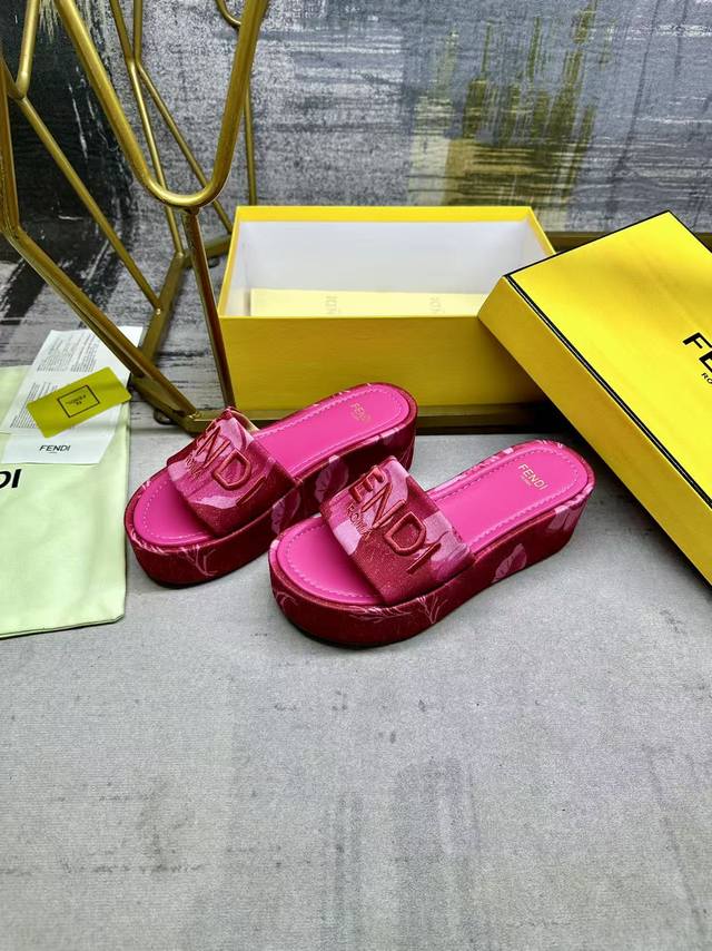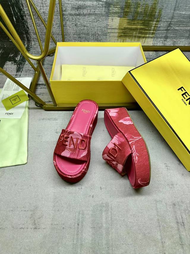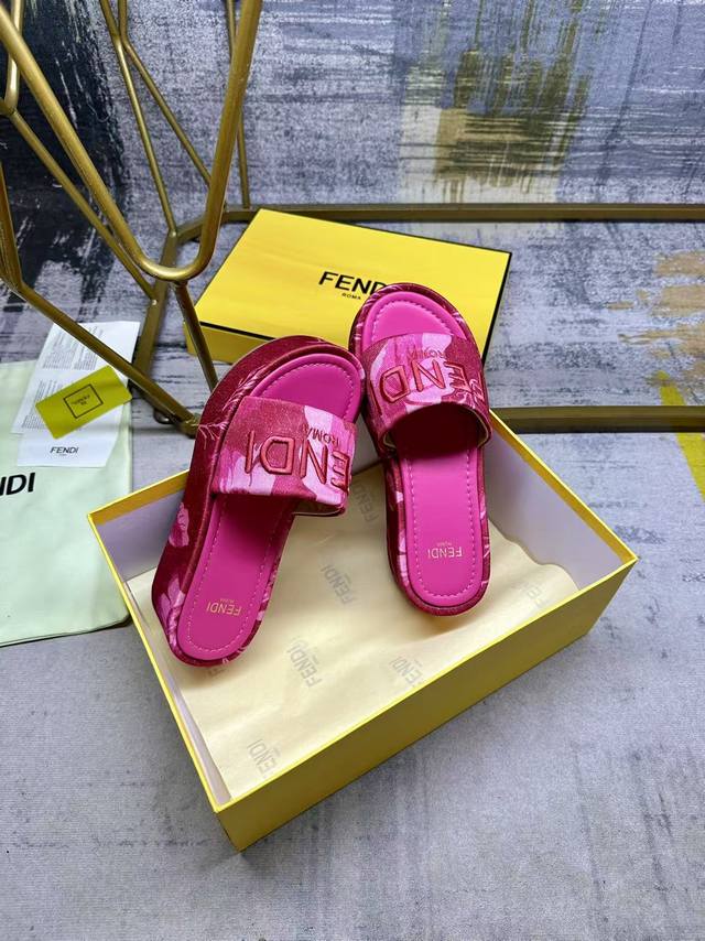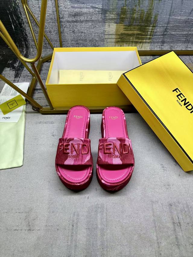 Fendi's latest hit wide-leg platform slippers, made of colorful printed fabric with a light contrasting print, a matching leather insole, and matching Fendi yarn embroidery, sizes 35-42,