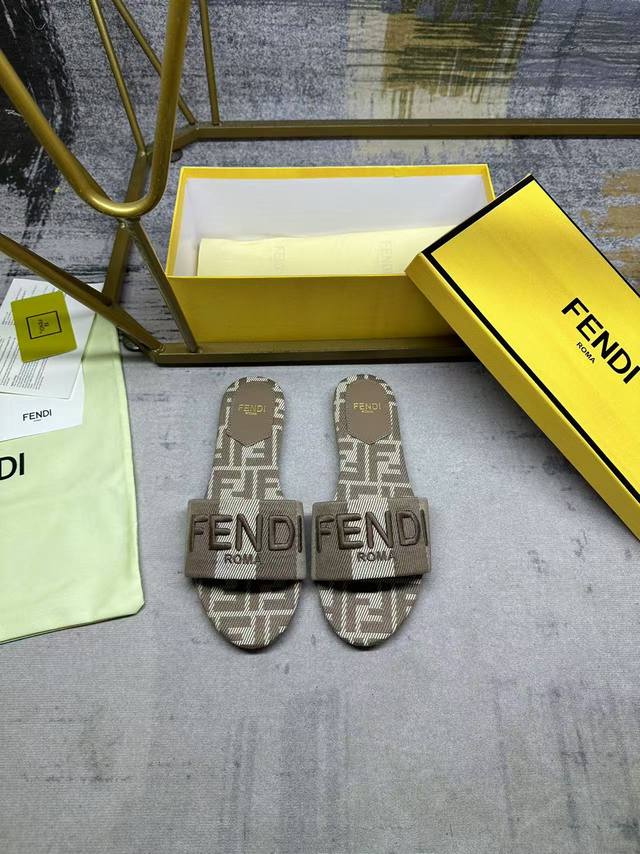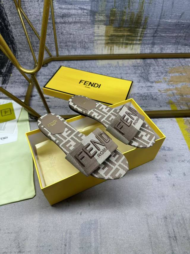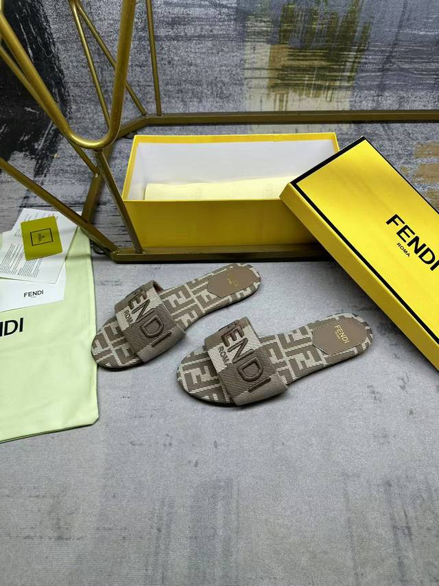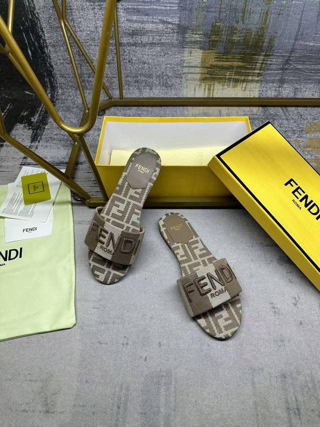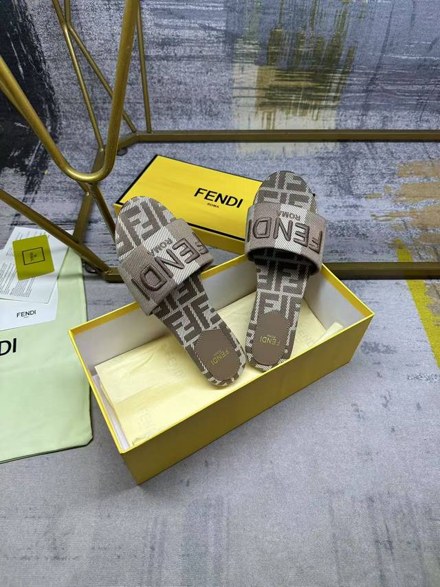 Fendi's latest hot item, wide-strap flat sandals, striped canvas material with tonal leather trim, Ff jacquard canvas insole, tonal sheepskin insole, sizes 35-42, rubber outsole, genuine leather outsole