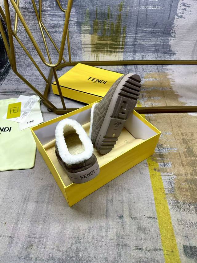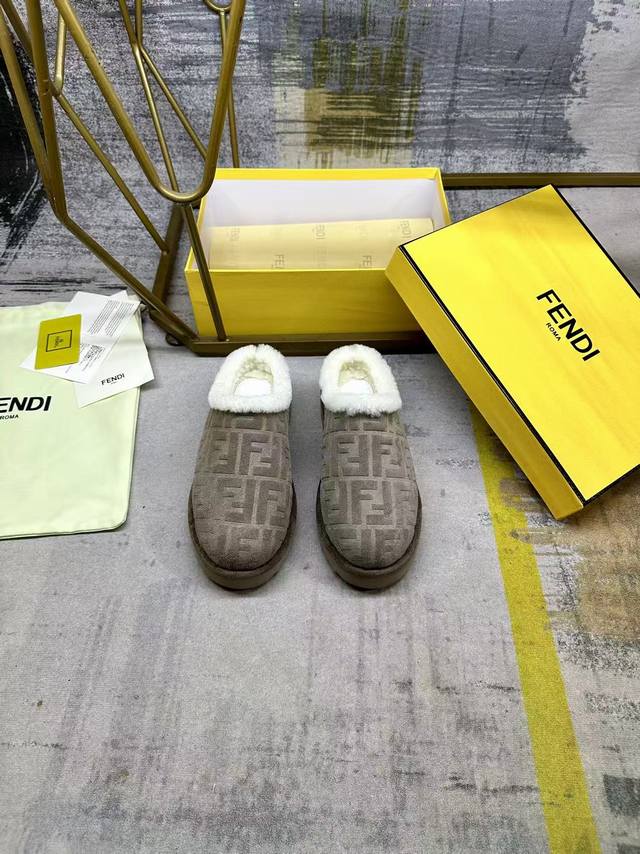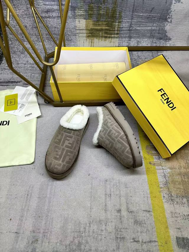 / Fendi's latest round-toe unisex flat mules. Made with grey suede embossed with