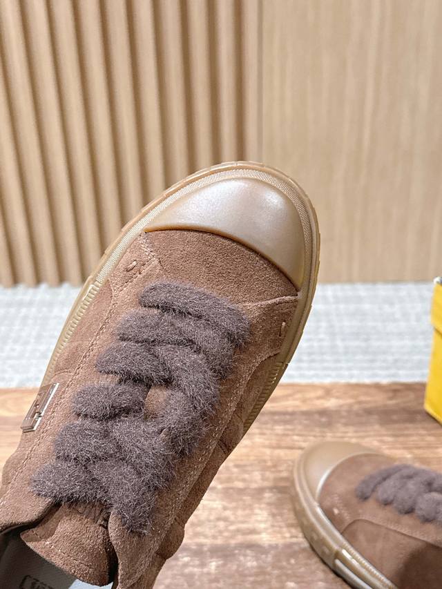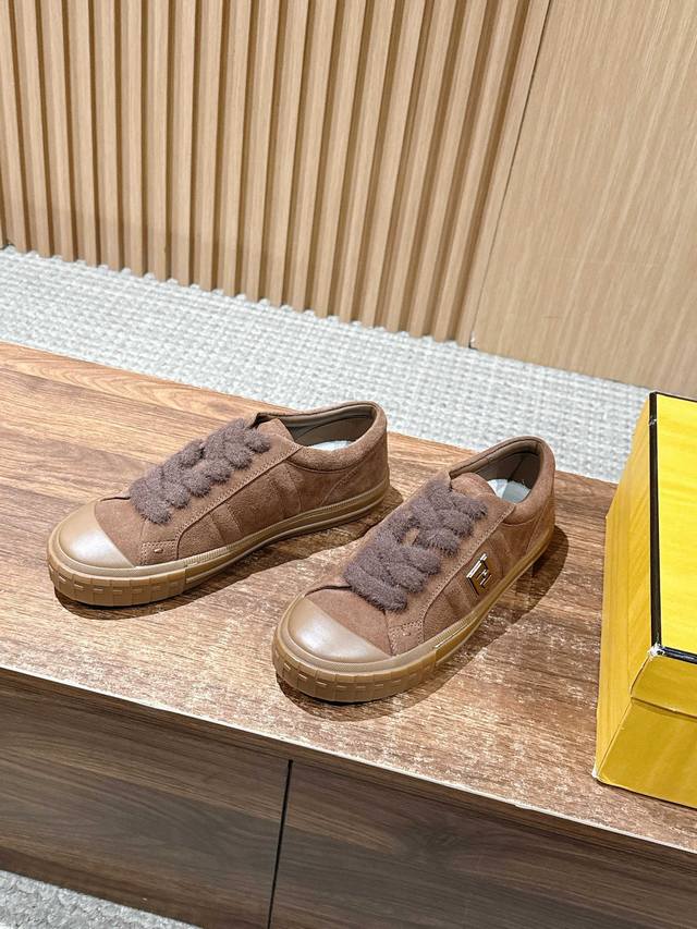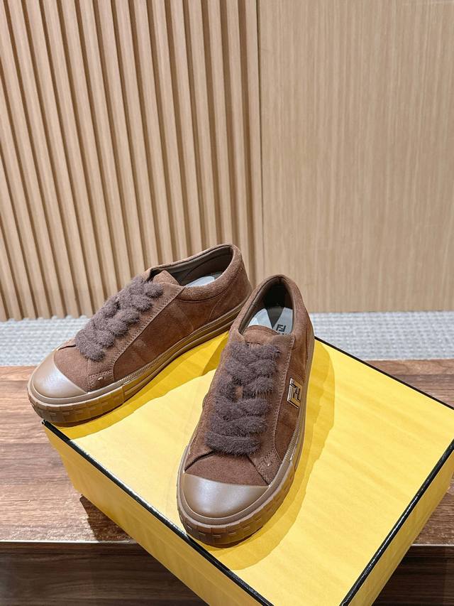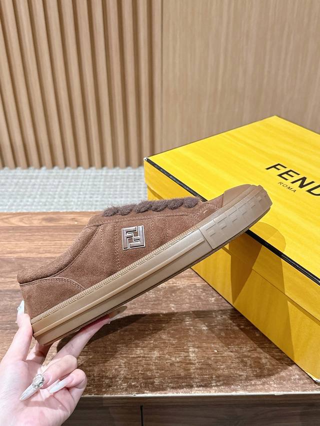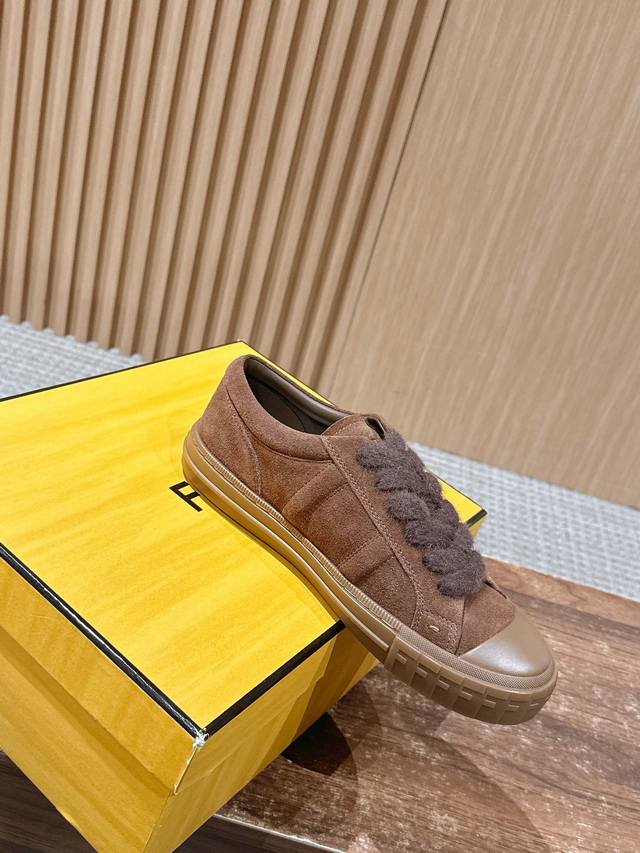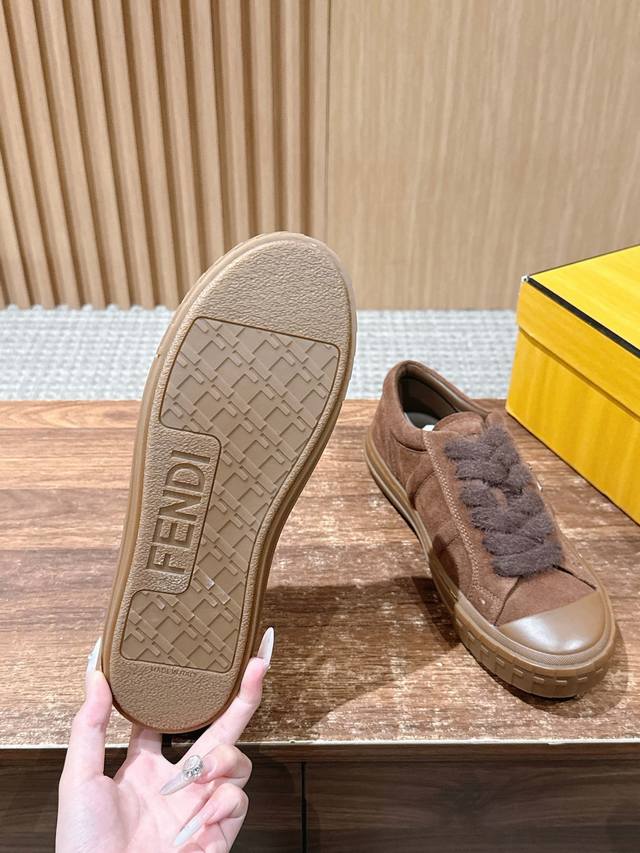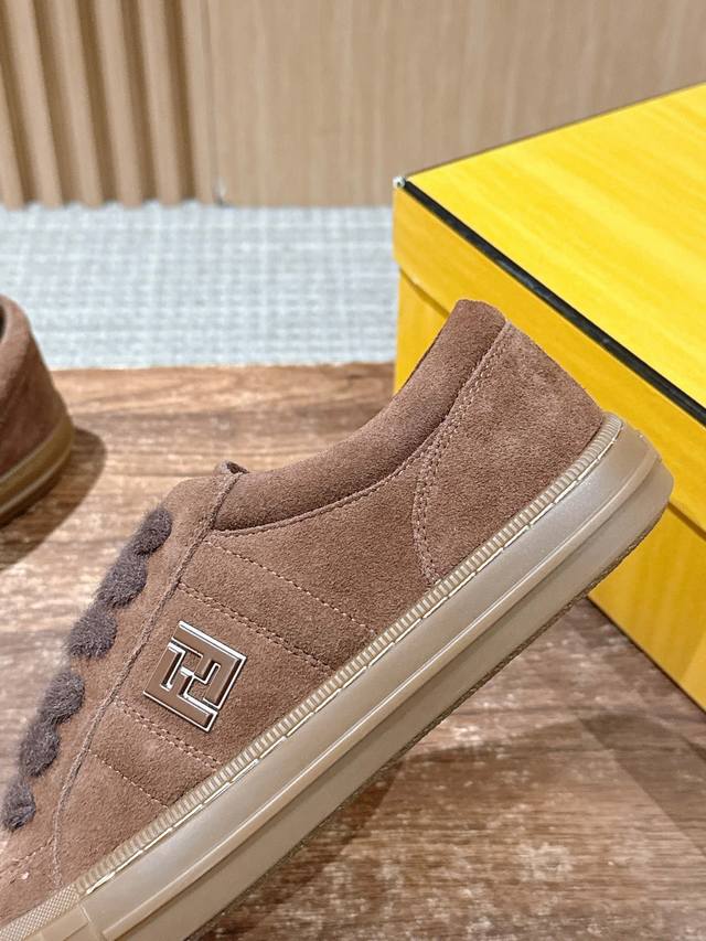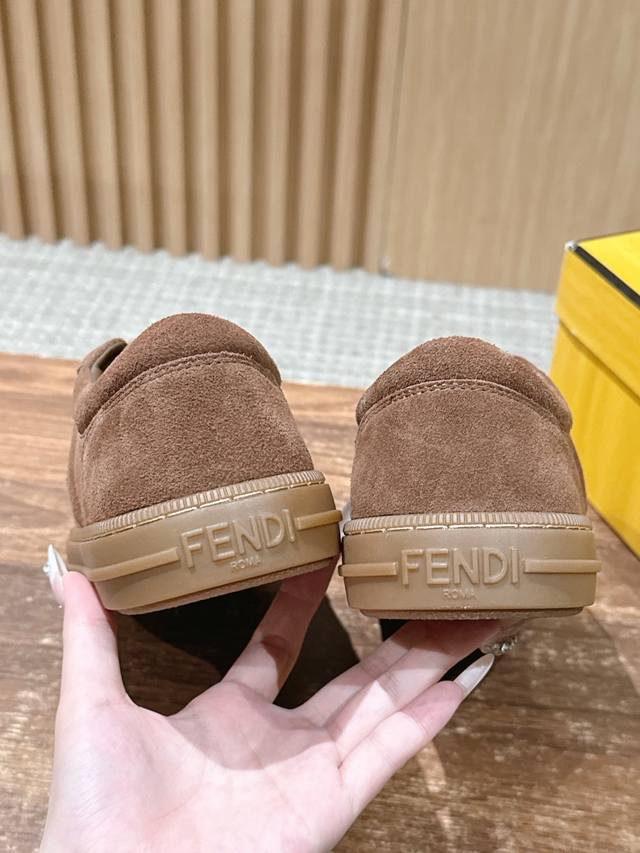 Fendi's new low-top sneakers, featuring a rubber sole, suede lambskin lining with stitched FF pattern embroidery, a white sole with contrasting color details, embossed textures, an overlaid FF pattern on the toe, and the Fendi Roma logo on the heel. Sizes: 35-45 (Women's 40, Men's 45, Custom Made).