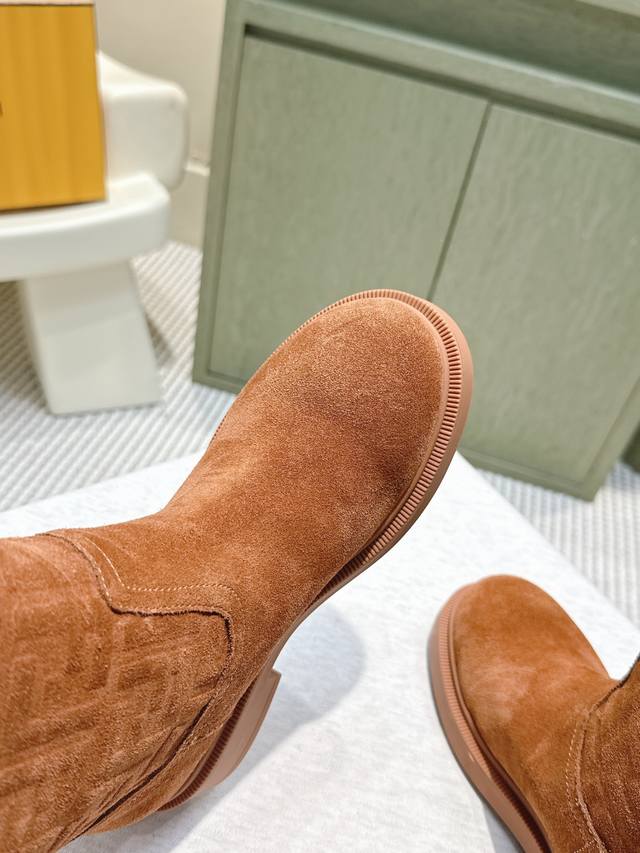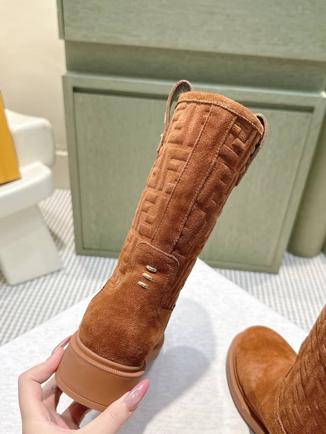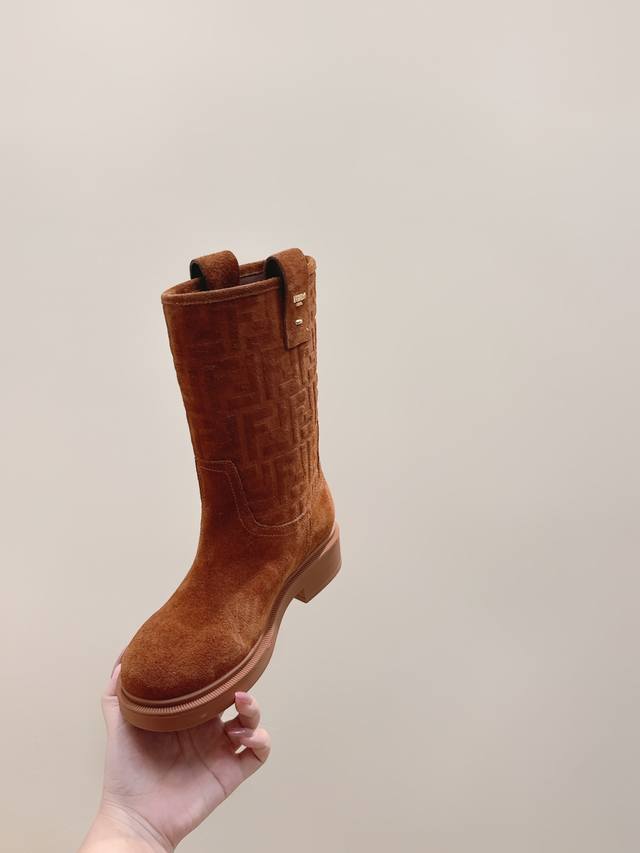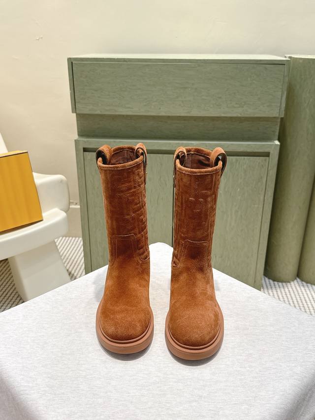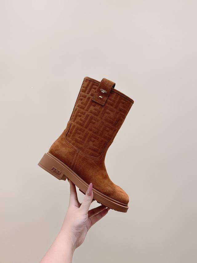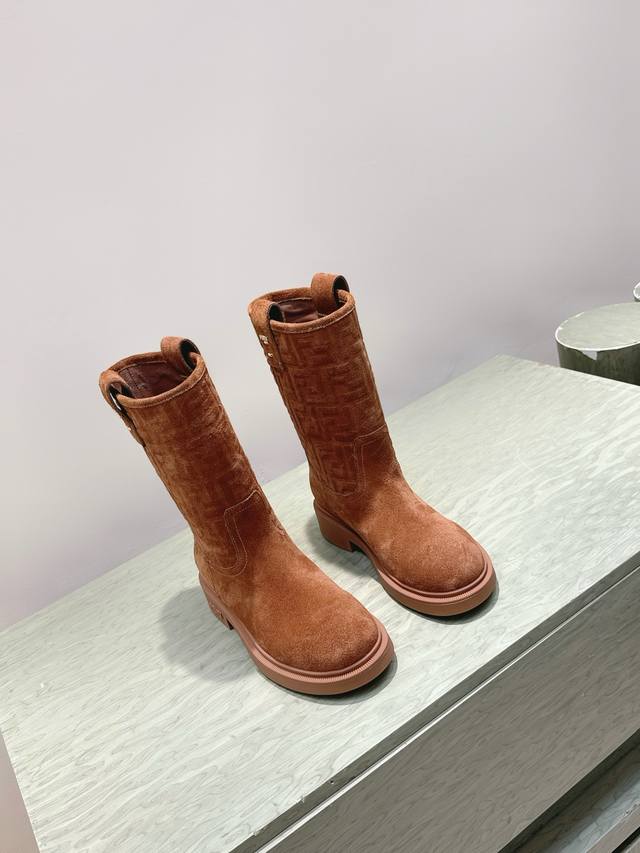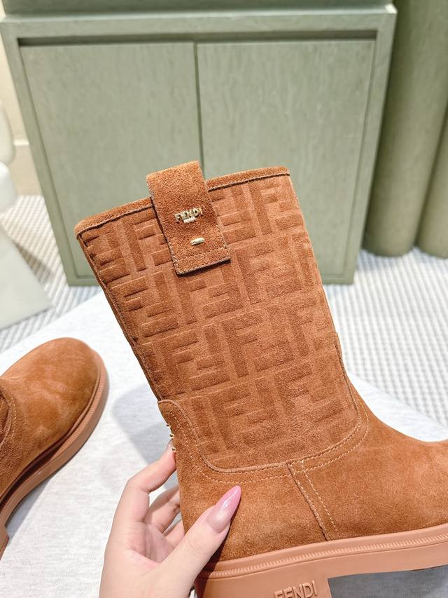 High-quality Fendi 2025 Fall/Winter Short Boots, High-top Boots, Riding Boots. Fendi has released more beautiful boots! Made of high-grade suede cowhide, classic Ff monogram, high-grade special embossing, original mold, separate hardware, motorcycle style, fashionable and avant-garde. Very comfortable to wear, sheepskin lining, original TPU outsole, 3.5cm thick, original set, extremely beautiful, and super slimming! A must-have item for winter! Size: 35-40. Size 40 is custom-made and non-refundable.