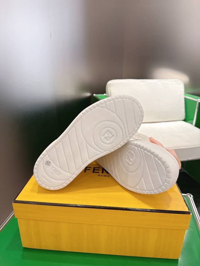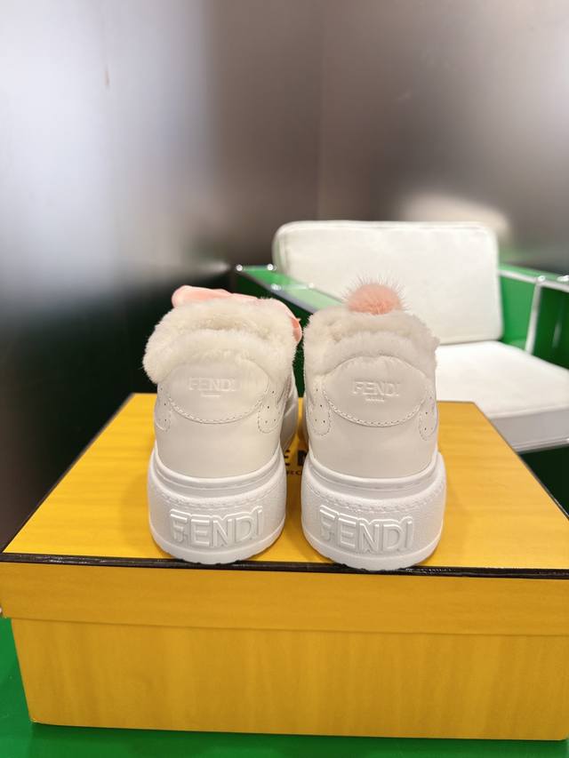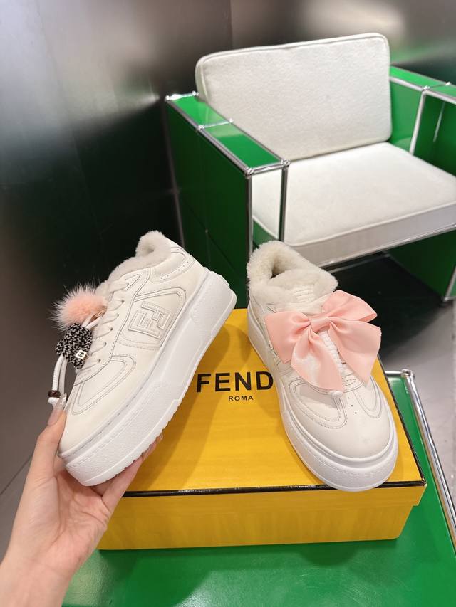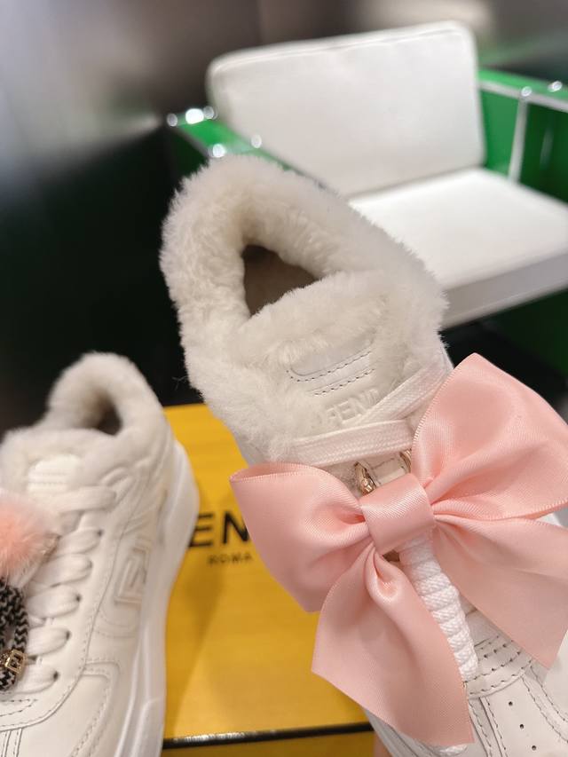 K023 Fendi's new Match asymmetrical magic platform Charm Match lace-up sneakers. Made of leather, denim-effect printed suede. The right shoe features a braided doll with colorful mink fur details and a gold-plated metal Ff pattern bracelet. The left shoe is adorned with a large brown taffeta bow. This contrasting design, "half playful, half elegant," is surprisingly harmonious despite its seemingly contradictory styles, and is full of cute and exquisite details, truly elevating platform shoes to an art form. Original denim upper, full cowhide leather, sheepskin lining. Outsole 5cm, size 35-40.