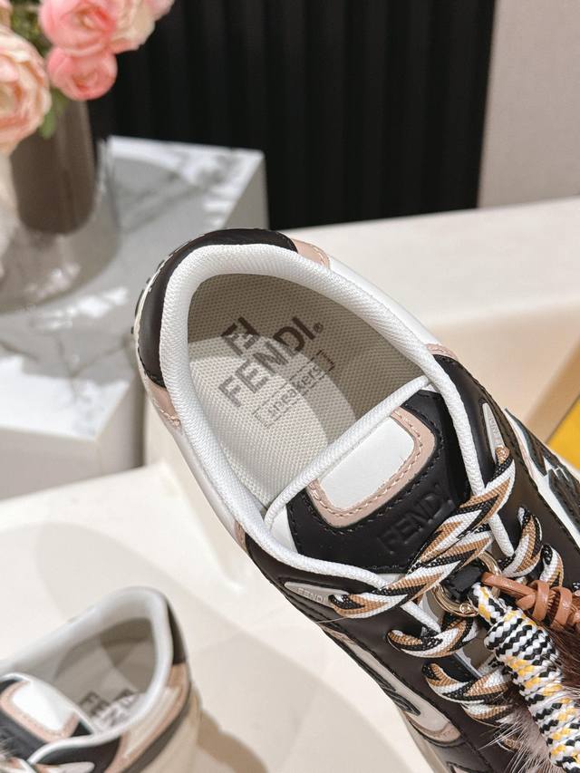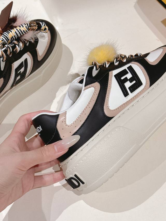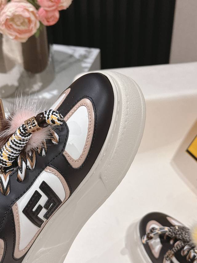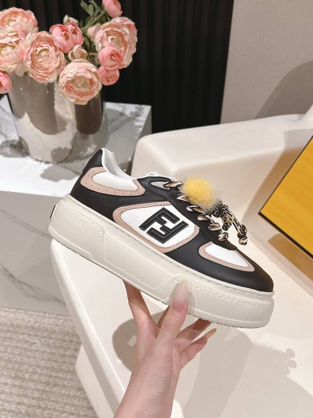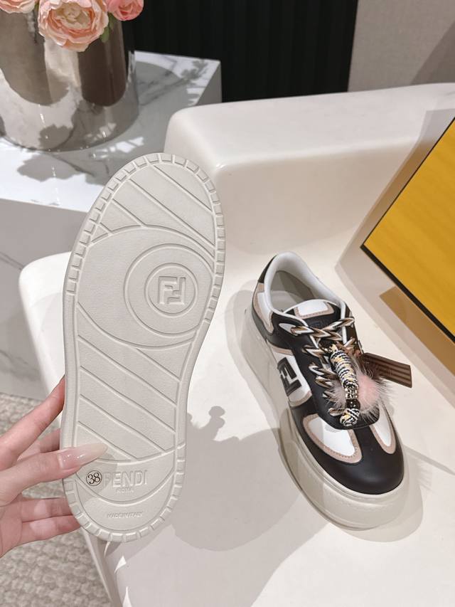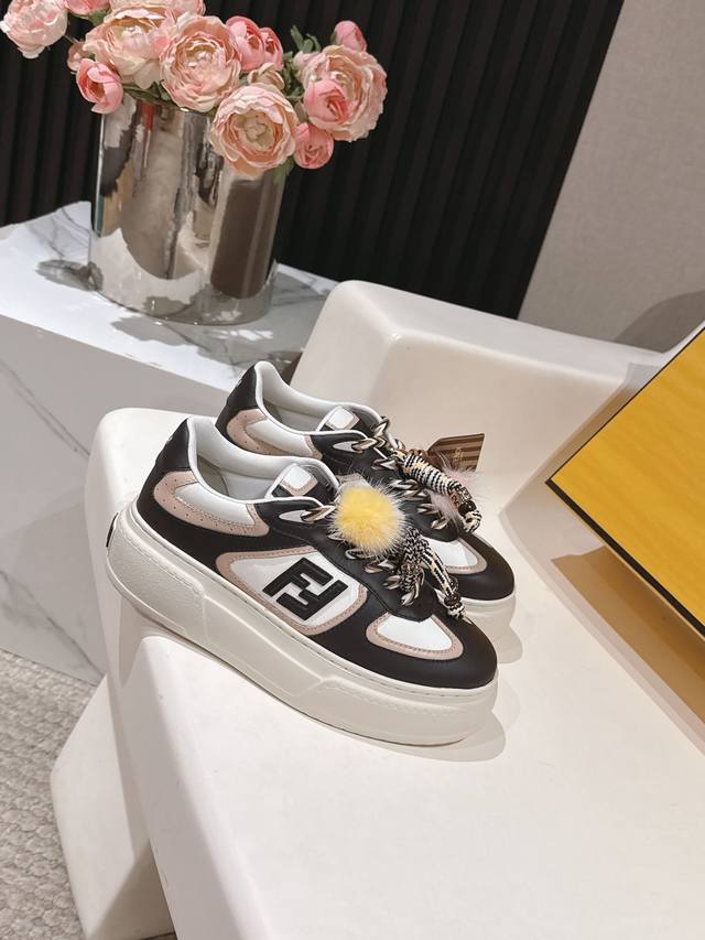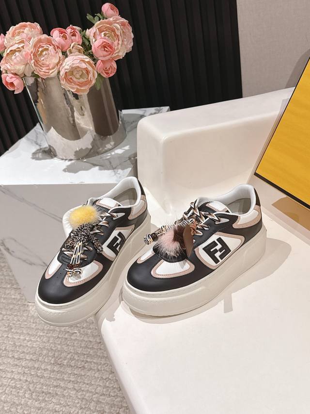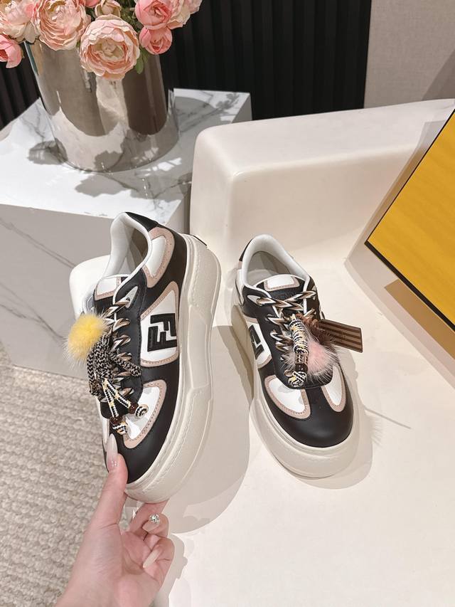 Selling Fendi's latest Match asymmetrical magic platform Charm Match lace-up sneakers in all white leather. Features a denim-effect printed suede upper. The right shoe is adorned with a braided doll featuring colorful mink details and a gold-plated Ff pattern bracelet. The left shoe is decorated with a large brown taffeta bow. This contrasting design, "half playful, half elegant," is surprisingly harmonious despite its seemingly contradictory styles, and is full of cute and exquisite details, truly elevating platform shoes to an art form. Original denim upper, full cowhide leather, sheepskin lining, IP outsole, 5cm, size 35-41.