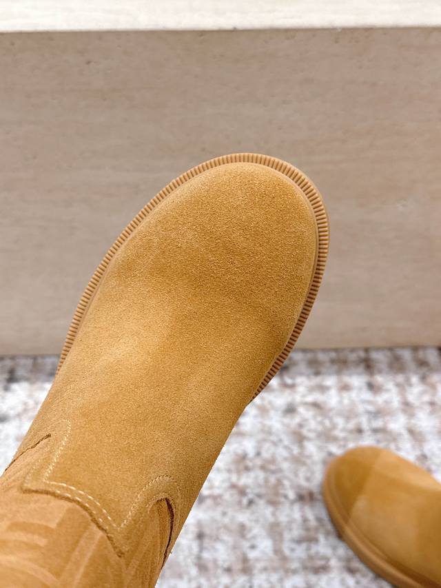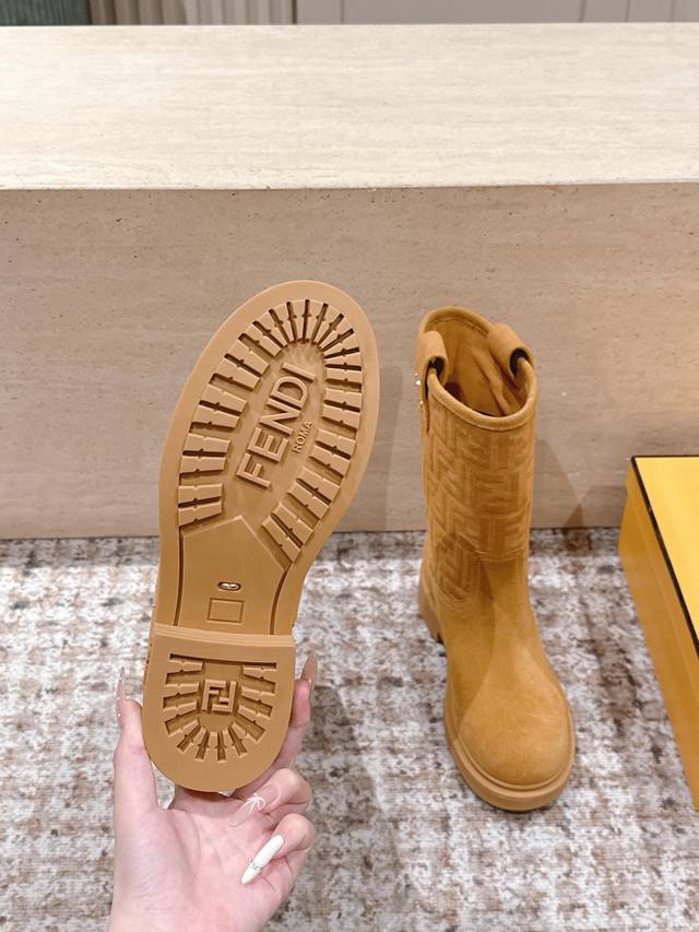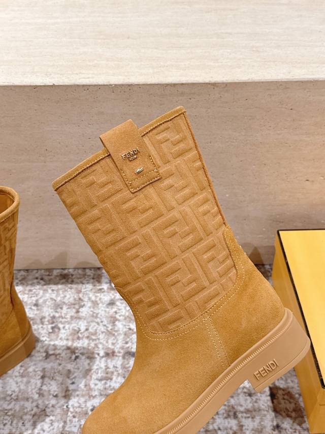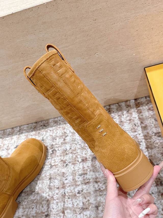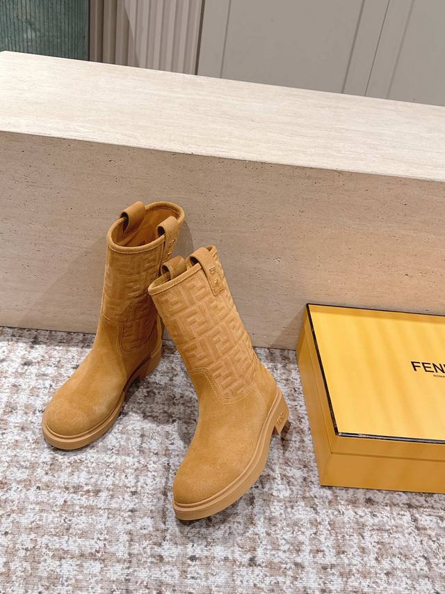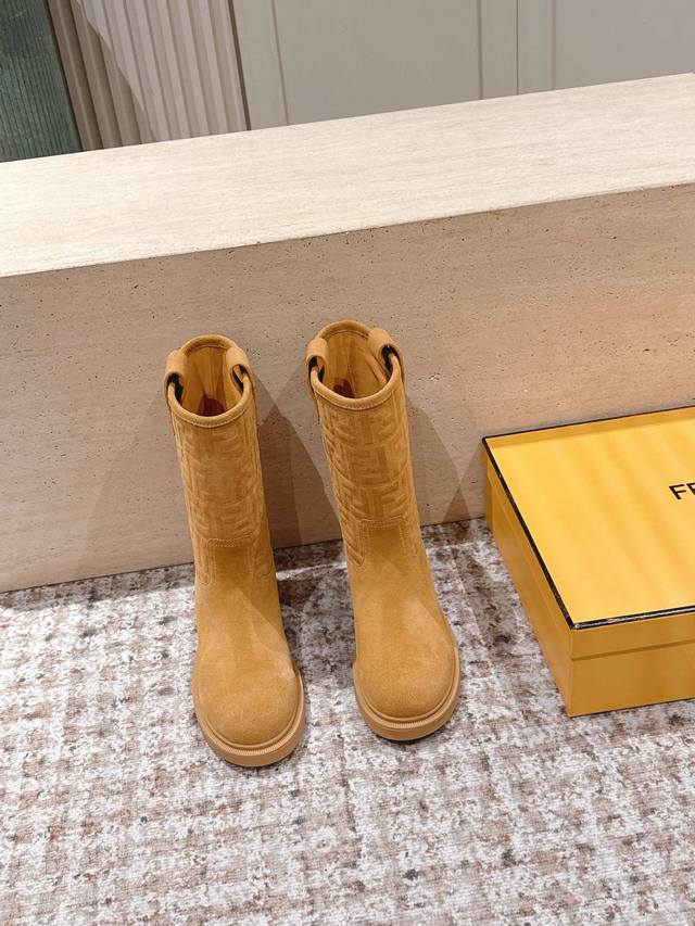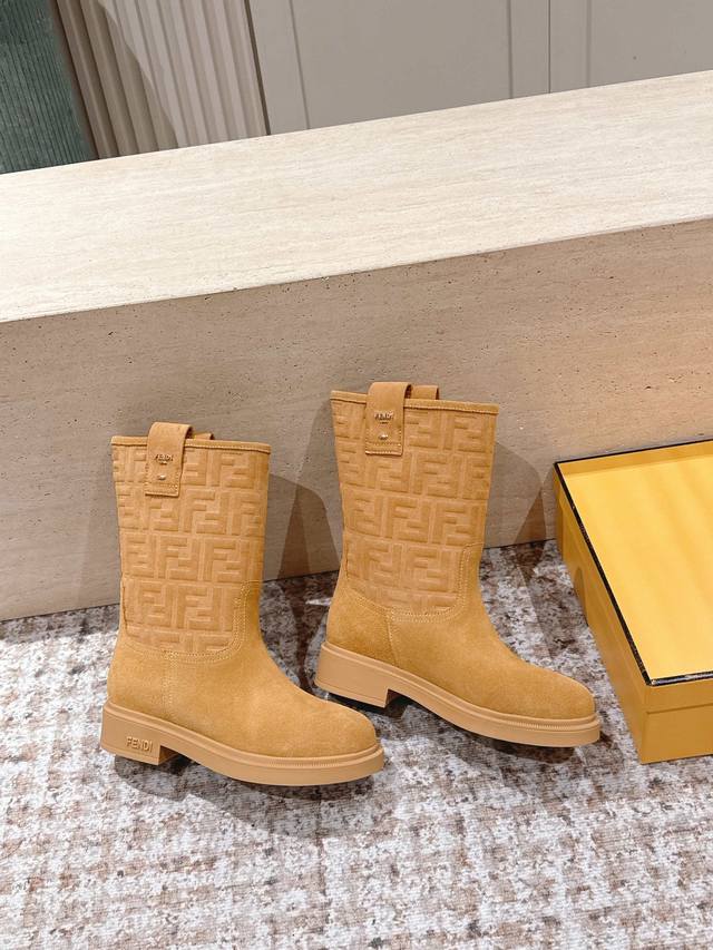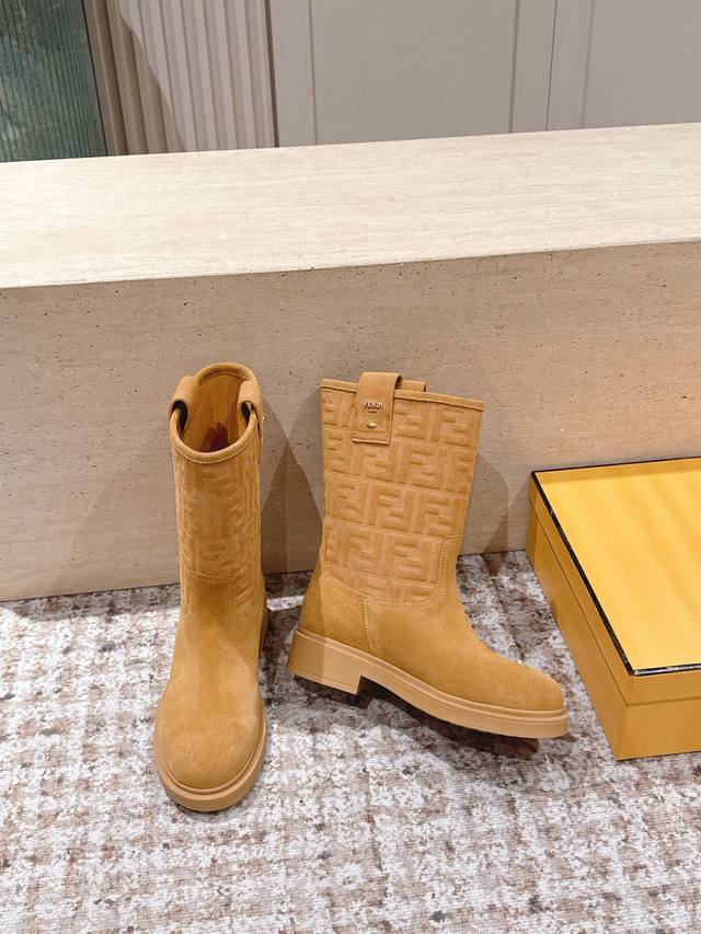 Top Version: Ankle Boots: High Boots. :Fend* Classic Monogram Mid-Calf Boots DDD Also features the brand's iconic Ff monogram embossing, with a high-quality suede material; the mid-calf design offers a more casual feel than knee-high boots, and the low heel ensures comfort. Metal accents on the side add detail. DDD Pairs well with straight-leg jeans and knit cardigans; the dark brown version is a great choice, showcasing a retro-casual vibe. With suit pants and a solid-color shirt, the black version creates a simple and sophisticated professional image. Combined with a floral skirt and knit sweater, the caramel brown version adds a touch of retro sweetness to a sweet style. DDD Upper: Cowhide Suede DDD Lining: Cowhide DDD Outsole: TPU Outsole DDD Size: 35-41 DDD
