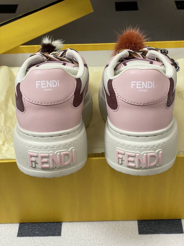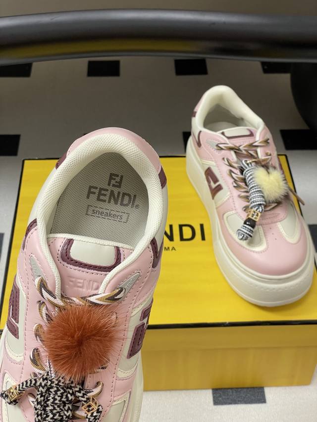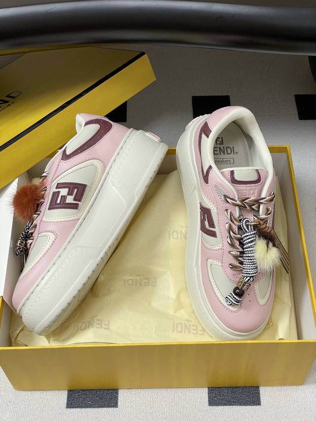 Fendi Match 25 platform sneakers with charms and lace-up casual sneakers in the latest colorway. Made of light pink leather with white and ochre brown details. Contrast leather Ff appliqu