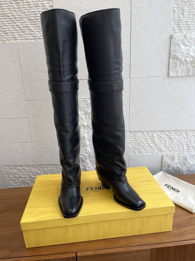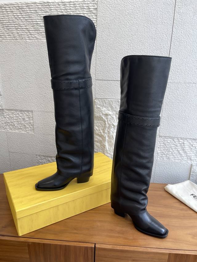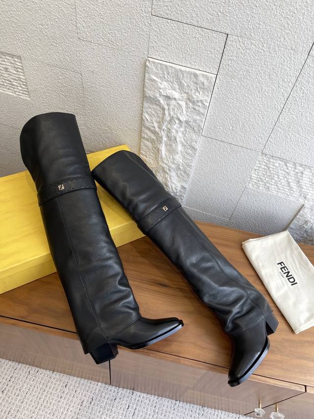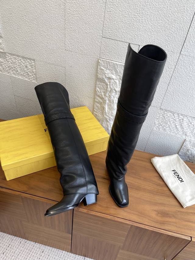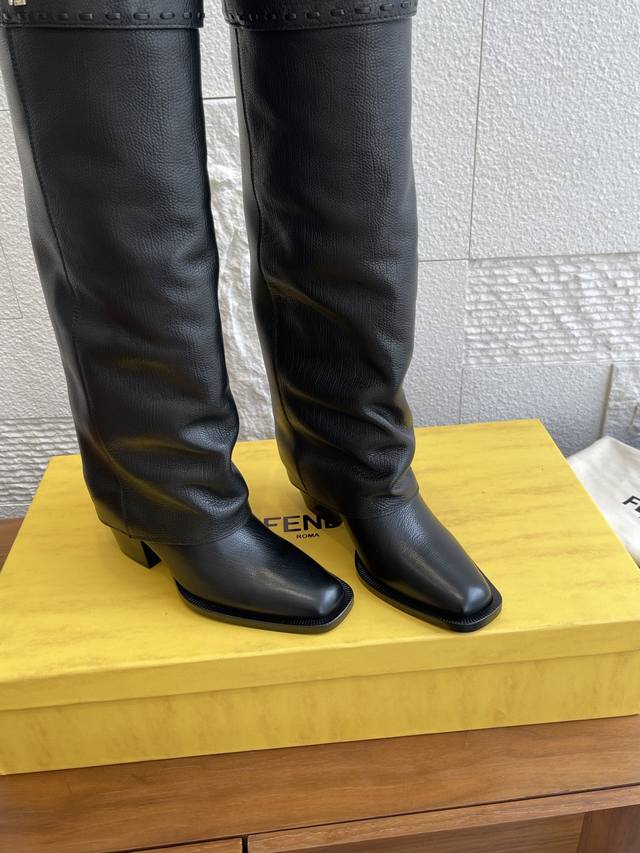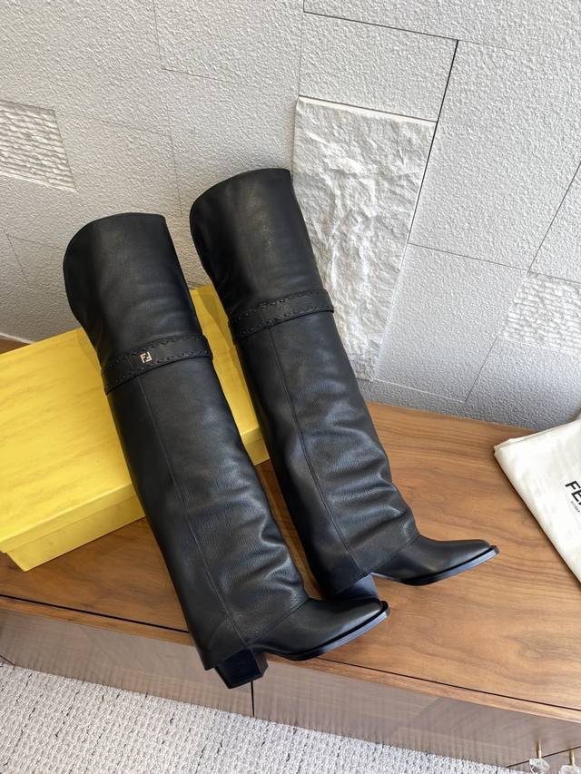 Fendi 2025 Winter New Arrivals are now online. The Fendi wood grain chunky heel design is inspired by this year's runway main collection. A high-end version, the preferred brand for well-known internet celebrities, models, stars, and socialites. Featuring the most popular square toe element of the past two years, the trouser-leg boot construction, and the ever-popular wood grain chunky heel, this is a must-have high-end shoe collection for this fall and winter. Made of slightly wrinkled, distressed, and waxed cowhide, the 6cm mid-heel design with its inherent wrinkles doesn't detract from the overall quality. The novel material color blocking gives it a wintery feel, making it both sexy and fashionable.