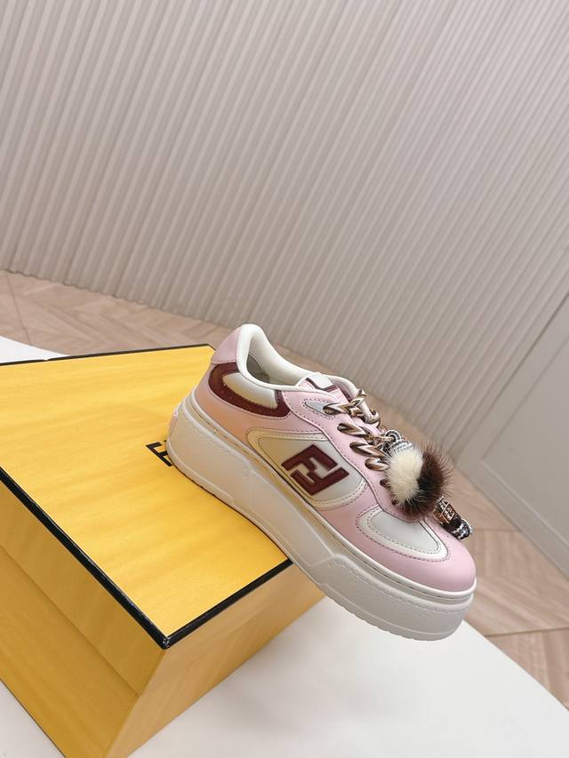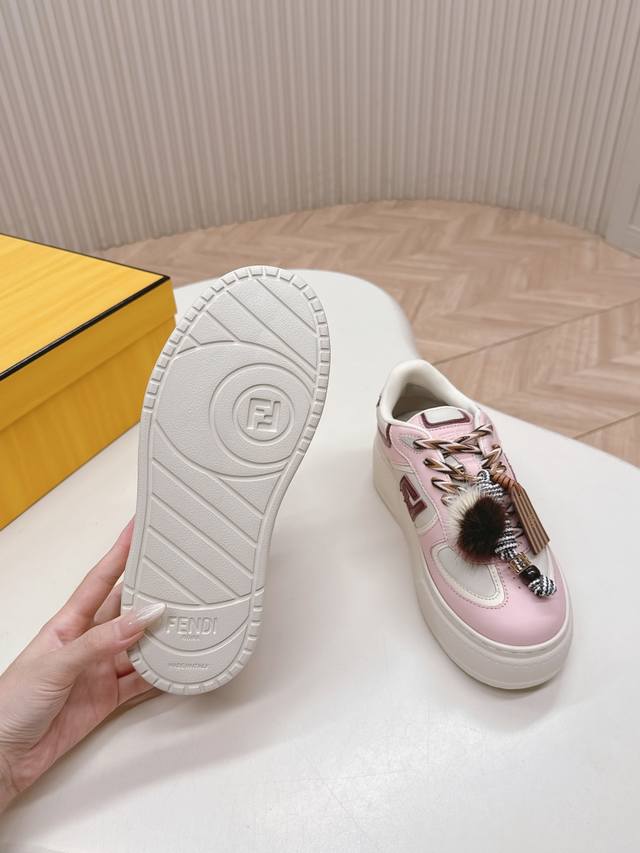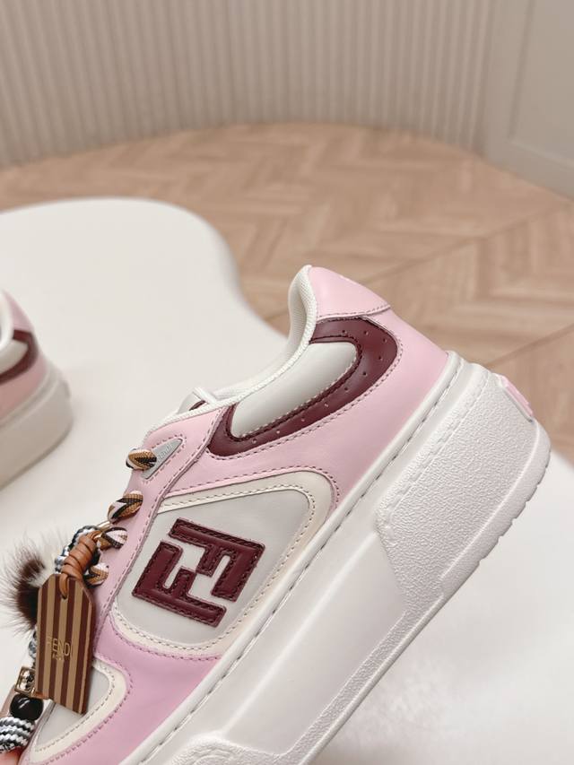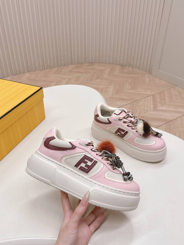 Top-tier version Fendi 2025 platform sneakers with a plush toy design. Upgraded new style with full leather patchwork, original colorways, cute and playful plush toy design, fresh and stylish, with a retro design. Versatile and stylish upper with cowhide patchwork, raised double F logo on the side, breathable lining, lightweight and comfortable, original TPU foam outsole. Sizes: Women's 35-40.