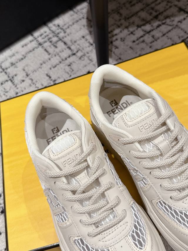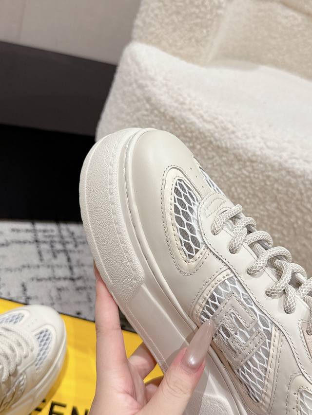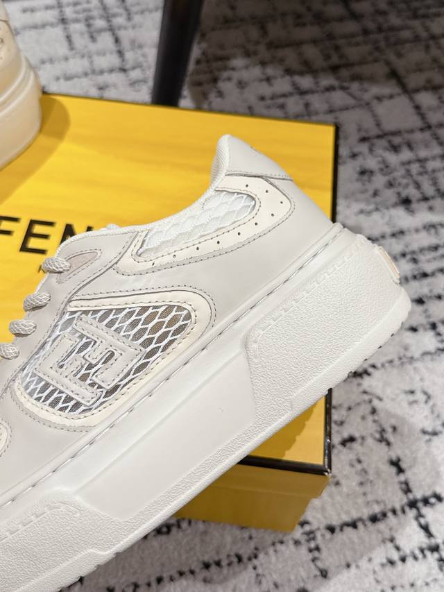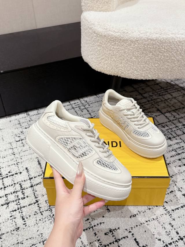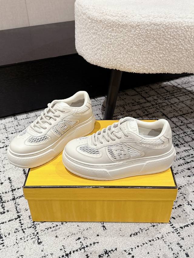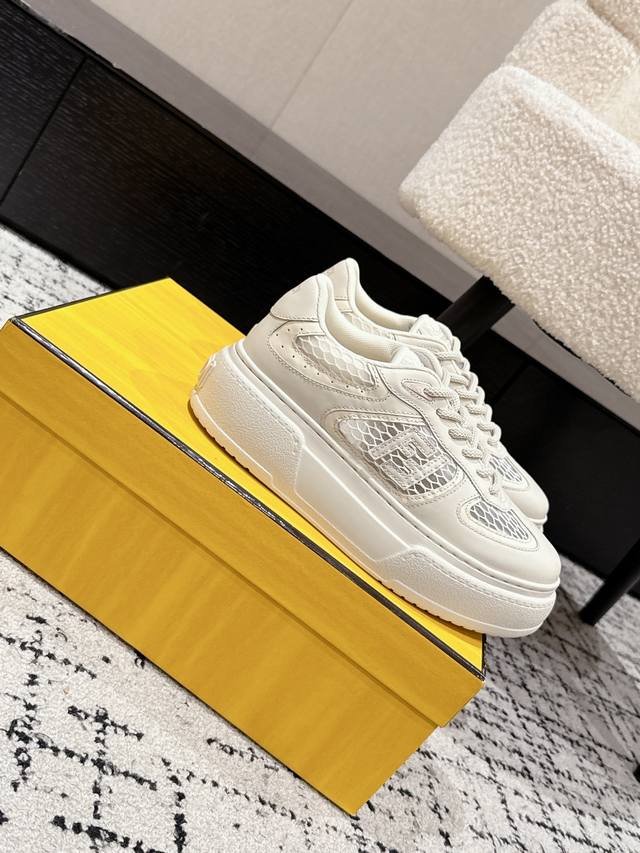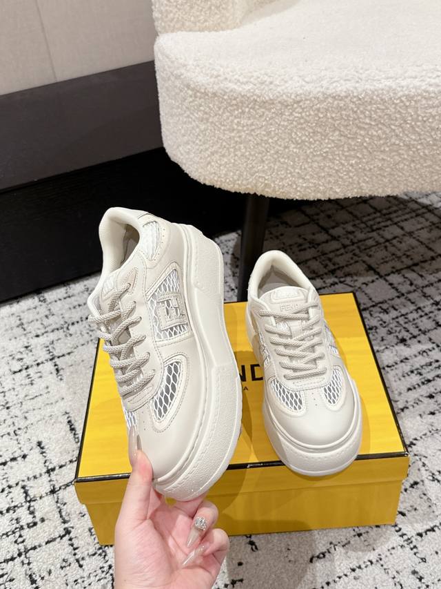 Top-tier version DDD Fendi 25 Match series thick-soled mesh casual sneakers DDD Original purchase and development. Designer Kim Jones' first sneaker, the Fendi Match, has a similar silhouette to the Louis Vuitton Trainer basketball shoe, but incorporates retro design elements. The upper is a combination of suede and mesh, with a raised double F logo on the side. The lining is made of terry cloth, making it super soft, lightweight, and comfortable. Pairs well with a hoodie for a youthful look. DDD Material: Original custom imported top-grain cowhide and mesh DDD Lining: Imported custom breathable mesh DDD Outsole: Original molded ultra-lightweight foam material DDD Sole thickness: 5cm DDD Size: #Women's 35-40 40 custom-made, no returns or exchanges DDD