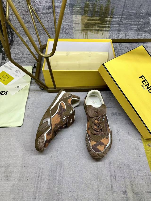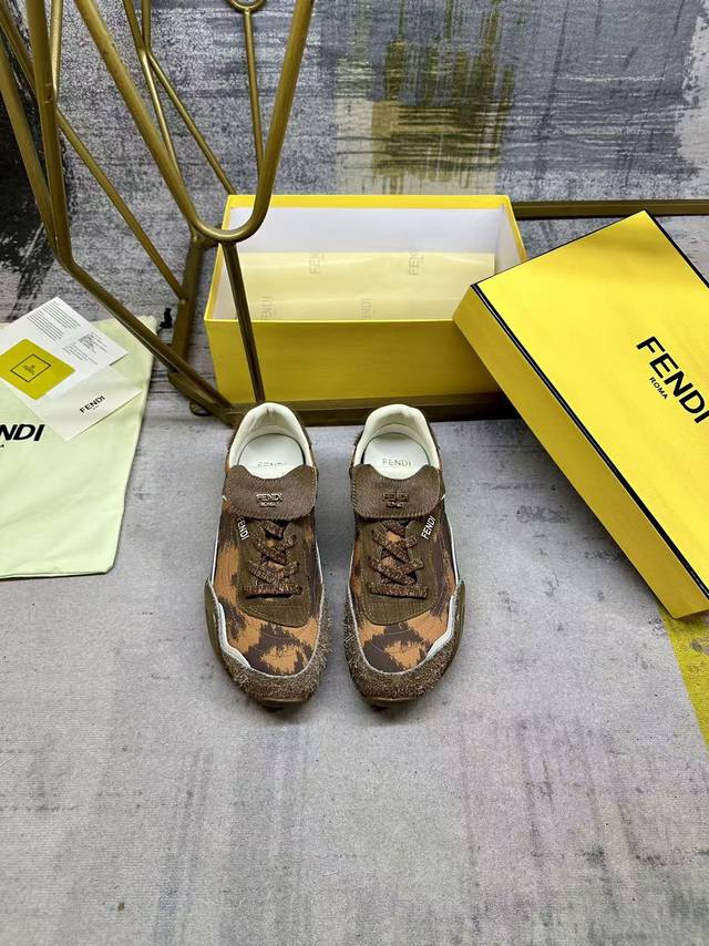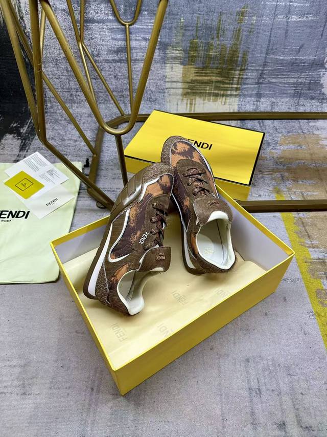 Factory direct price women's shoes, sports shoes, original Fendi Wave Pulse lace-up low-top sneakers. High-tech fabric with orange graphic print and light brown suede inlays. Details include a light brown cavallino leather fold-over tongue and tonal tubular laces. The side features a 3D rubber logo, and the tongue is adorned with a gold-plated metal Fendi logo. The shoe has a beige rubber outsole with a wraparound edge design on the side and a diagonal F pattern. Sizes 35-41 available.