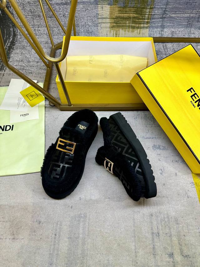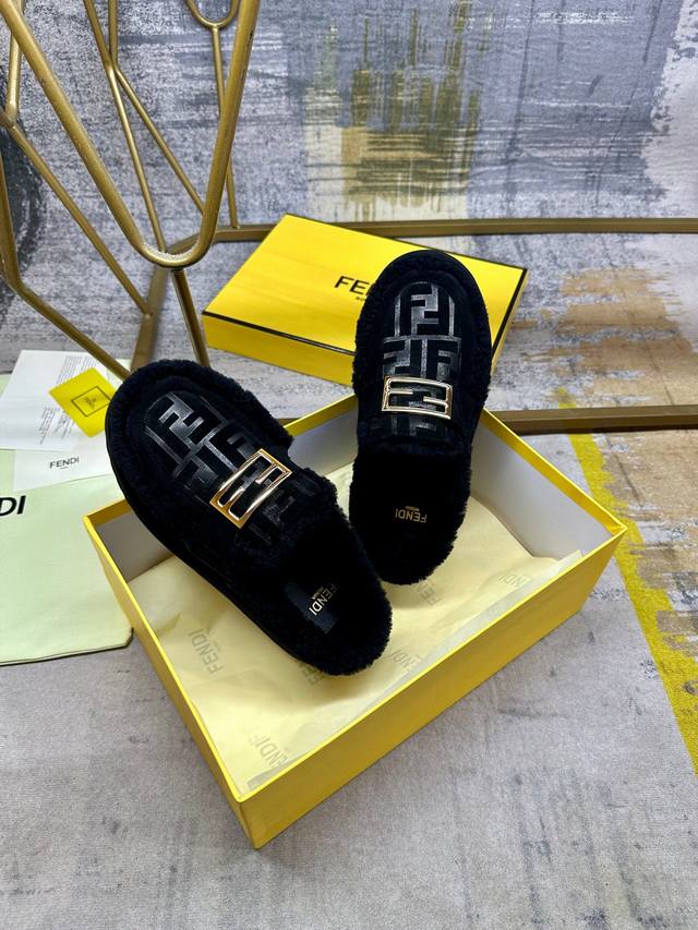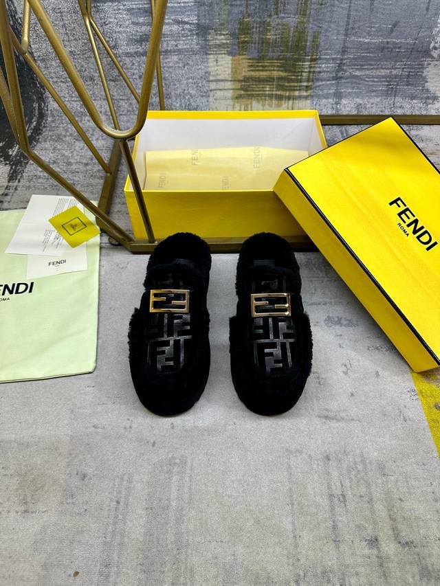Factory direct price women's shoes, sportswear, original Fendi latest casual round toe flat mules. Made of black suede with a tonal embossed Ff pattern. Tonal wool lining and trim. Features gold-plated Baguette hardware. Thick black non-slip sole, heel with contrasting inlays and Fendi logo. Women's sizes 35-40, Men's sizes 39-45.