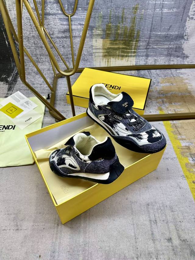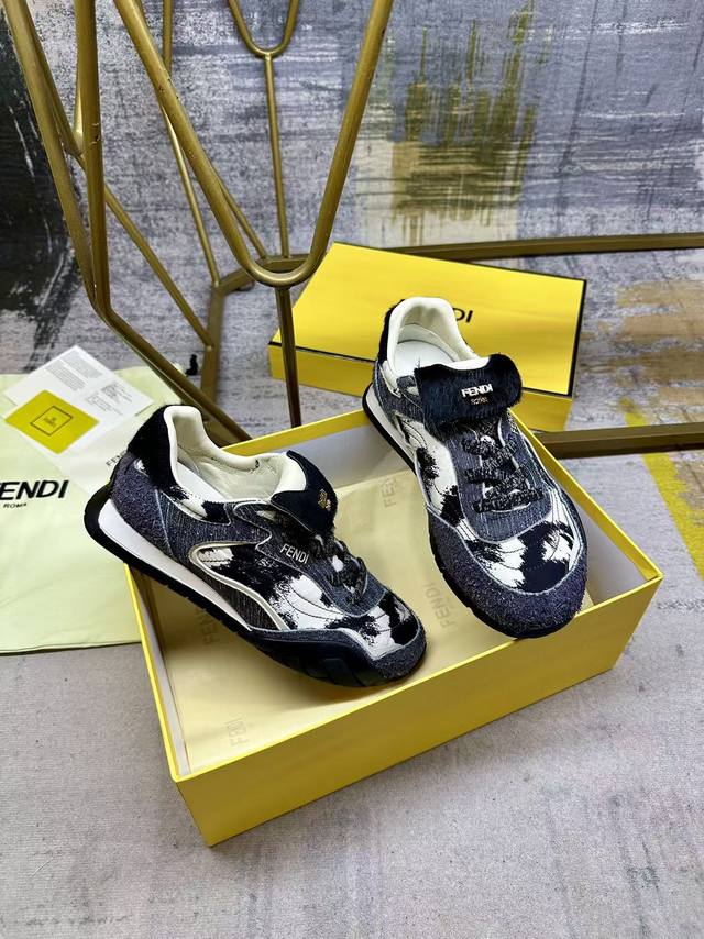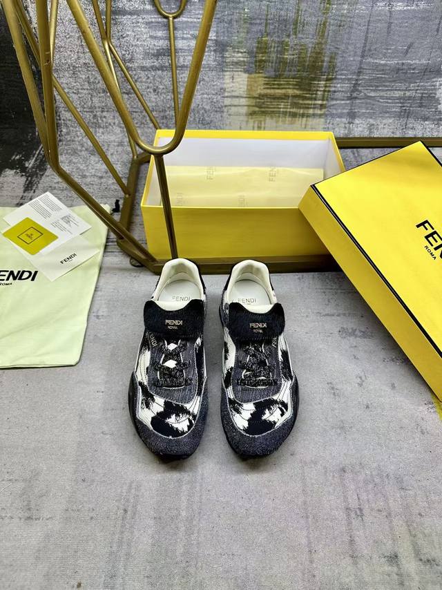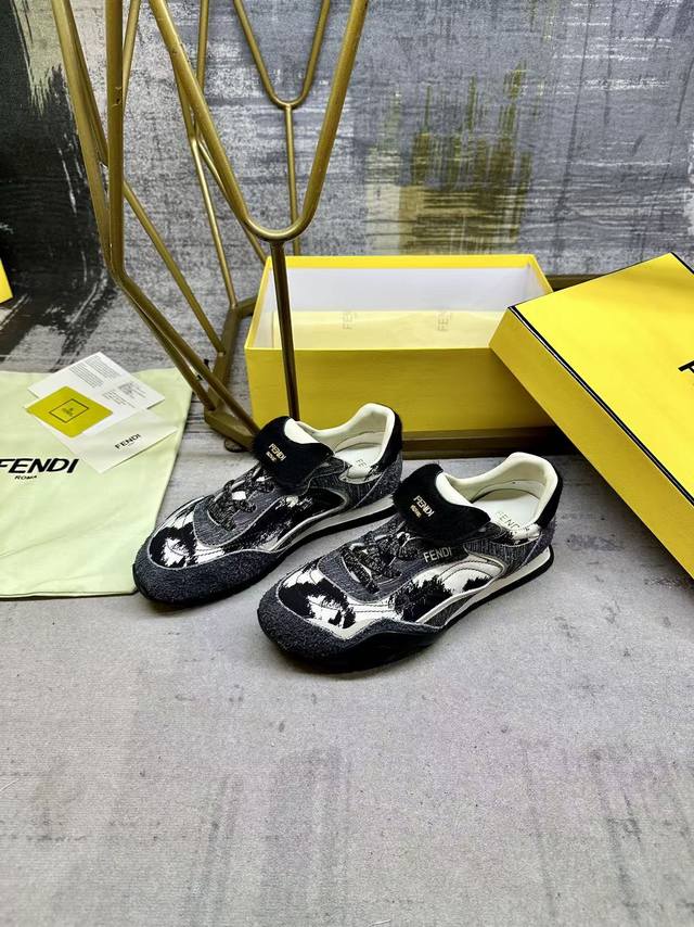 Factory direct price women's shoes, sportswear, original Fendi Wave Pulse lace-up low-top sneakers. High-tech fabric with grey graphic print and tonal suede inlays. Contrasting black cavallino leather details, fold-over tongue. Grey mixed-color tubular laces. Three-dimensional rubber logo on the side, gold metal Fendi logo on the tongue. Black rubber running shoe sole with a wraparound edge design on the side, decorated with a diagonal F pattern. Sizes 35-41 (DDD)