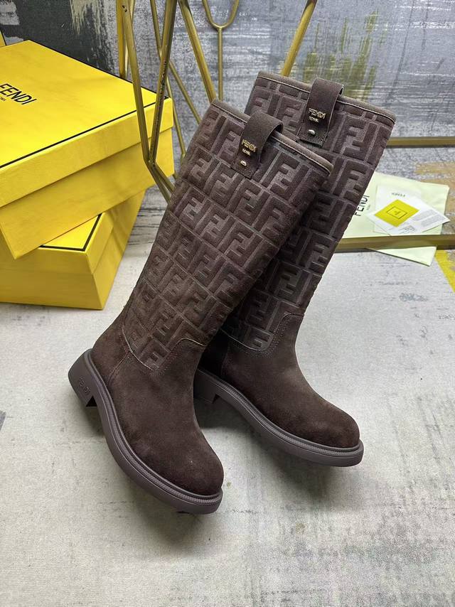 Factory direct women's shoes, sports boots, original Fendi latest hot-selling riding high boots, coffee-colored suede material, iconic Ff pattern embossed on the heel, metal buckle details, sheepskin lining insole, same color outsole, sizes 35-42. (