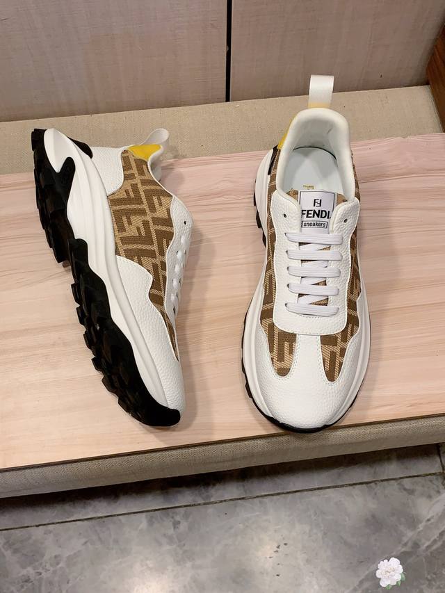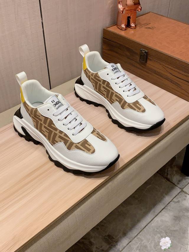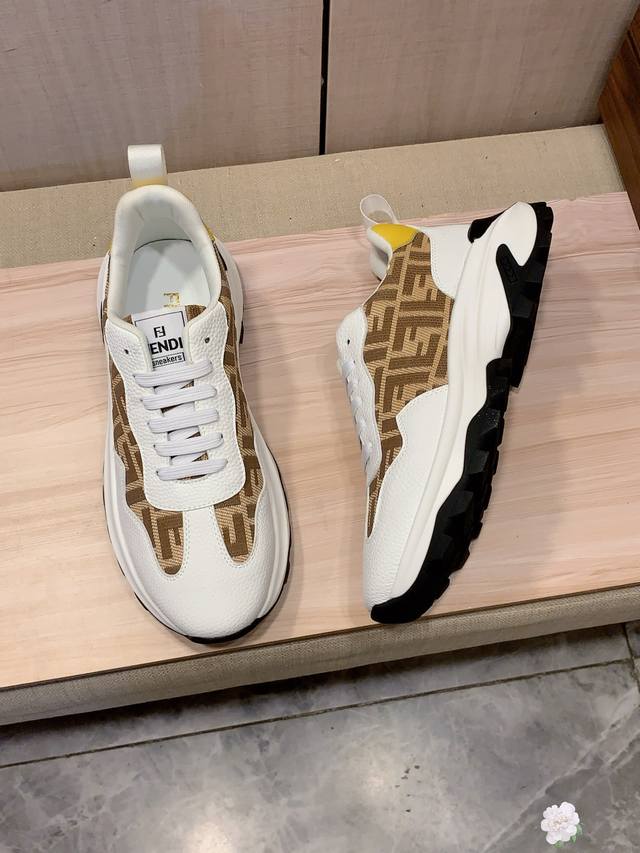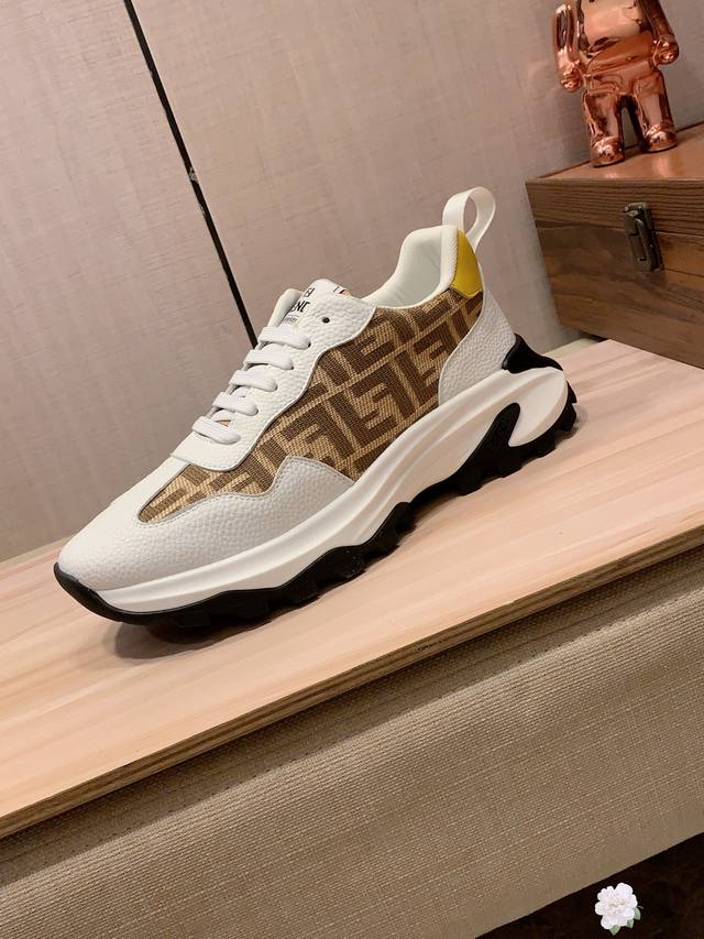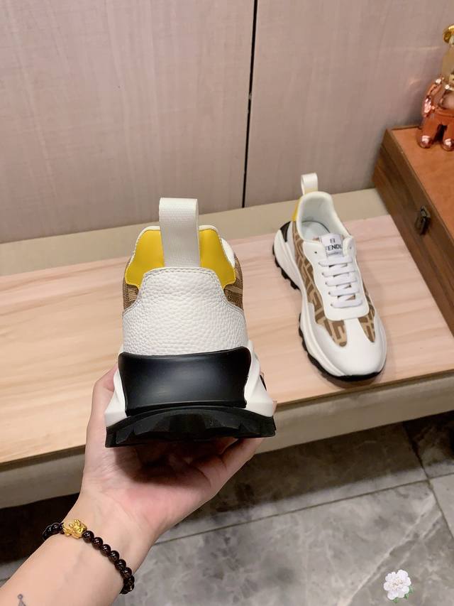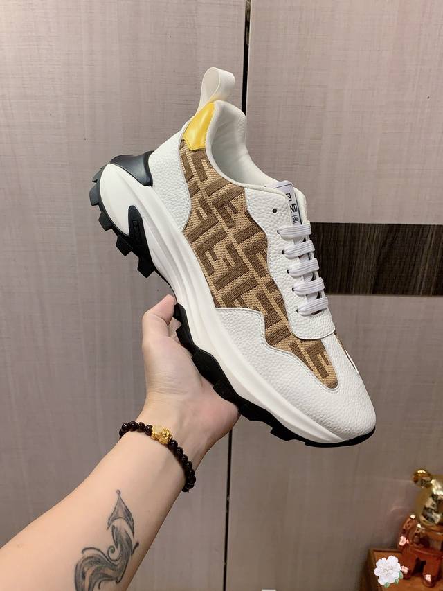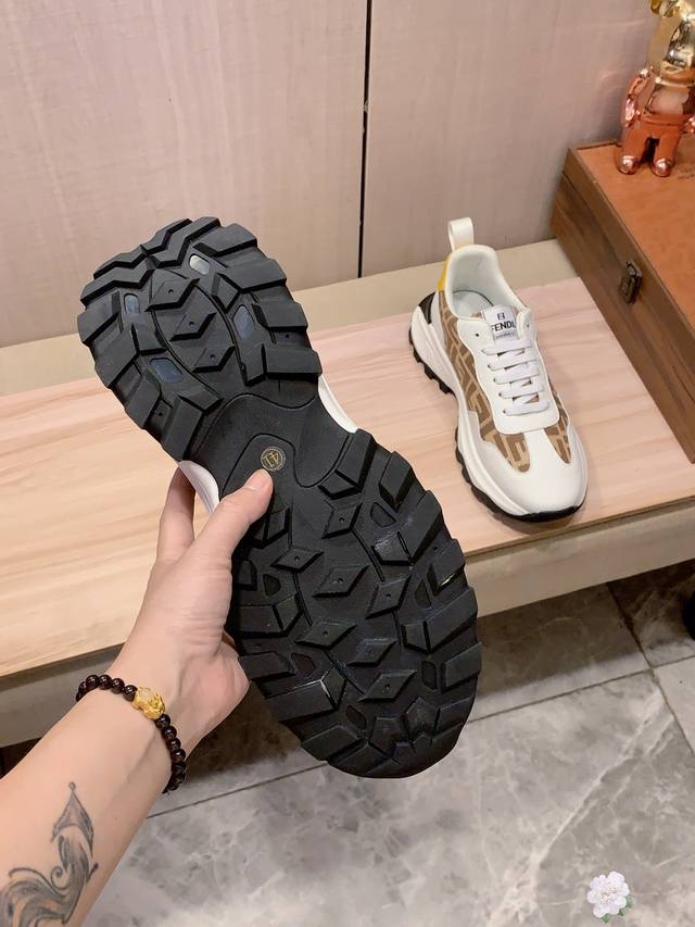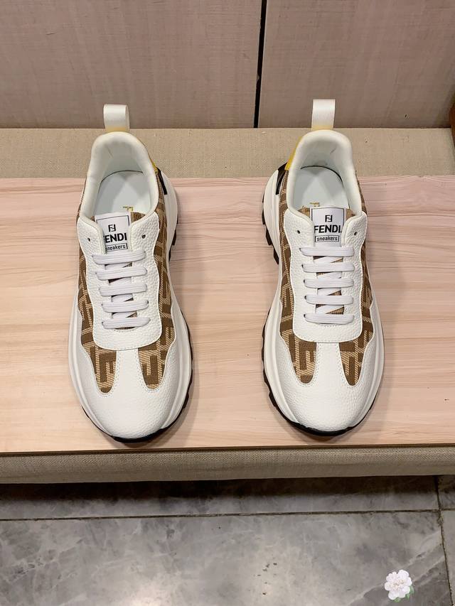 : Factory-priced Fendi*'s latest hit casual shoes, a top luxury brand, top-tier quality. Made from imported breathable cowhide uppers with breathable sheepskin underlays, the shoes are meticulously crafted. The original, stylish, soft rubber outsole is durable and non-slip, providing a lightweight and comfortable fit. Photos show the product in person. Sizes range from 38 to 44, and three colors are available.