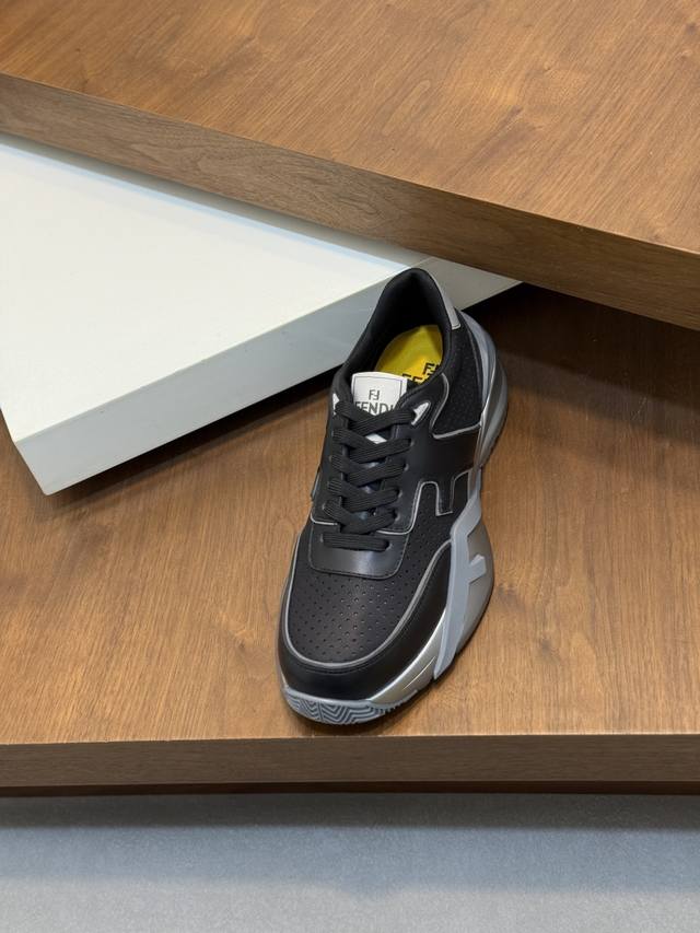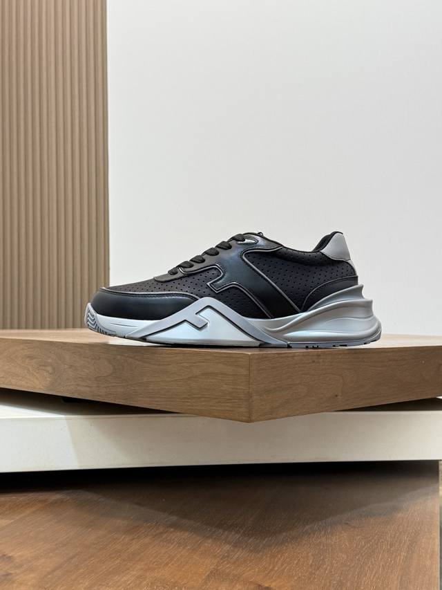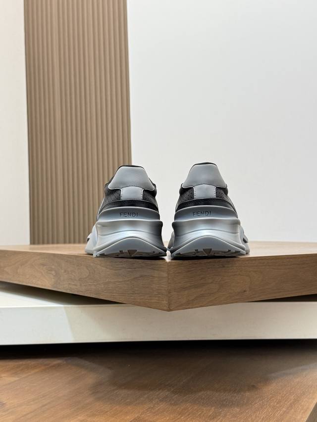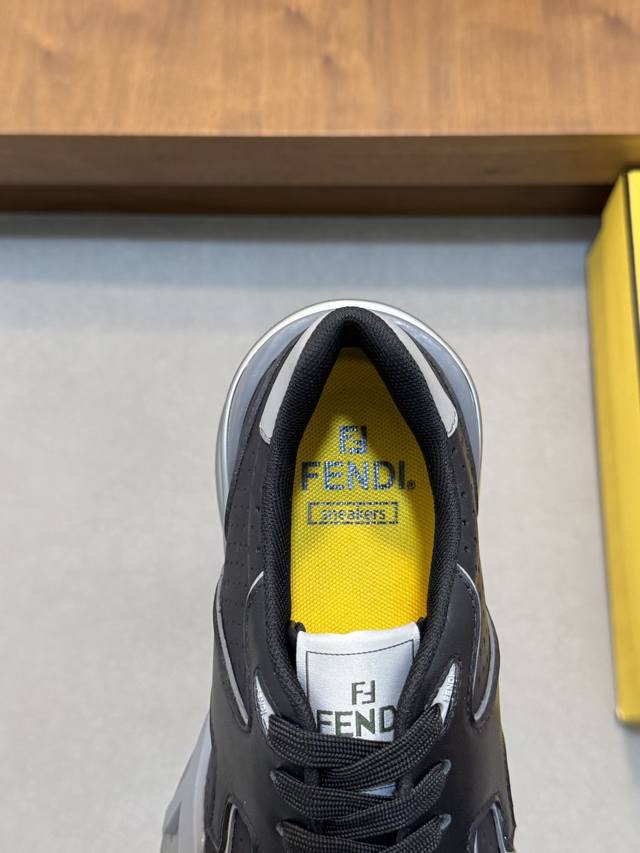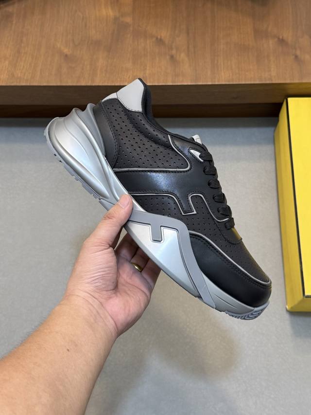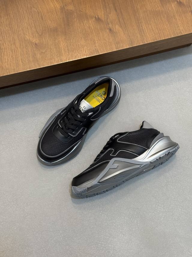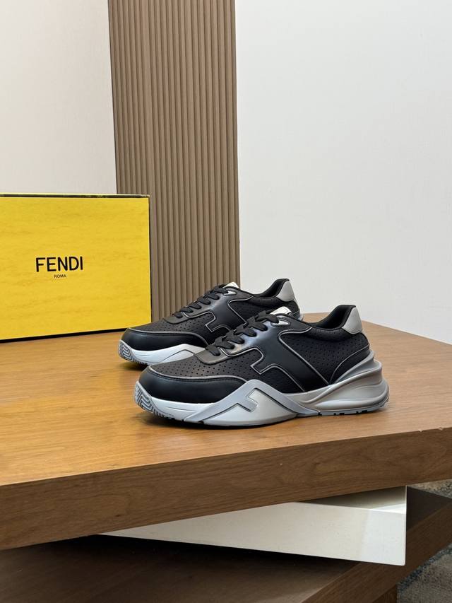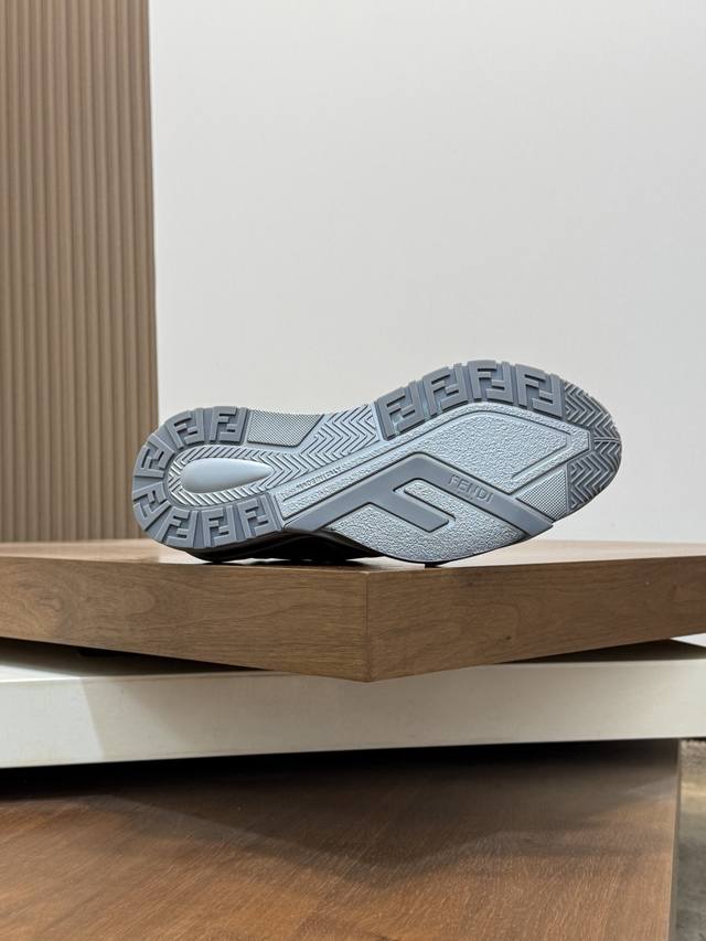 Fend* Fendi Flow men's casual sneakers with elasticated straps, side zippers, and a wavy sole with an F embossed on it. The heel features embossed Fendi Flow lettering. Crafted from a mix of technical fabric and blue leather. Decorative Lycra details. An Ff patterned tongue. Ultra-light and durable EVA sole. Available in sizes 39-44, 45, 46, and 47. Custom-made