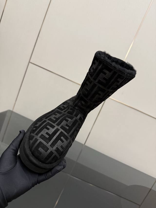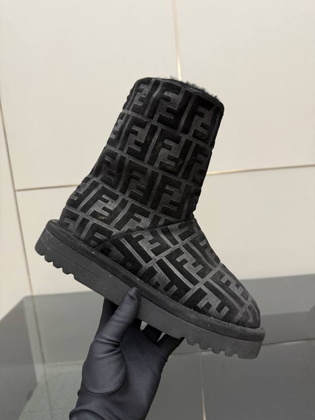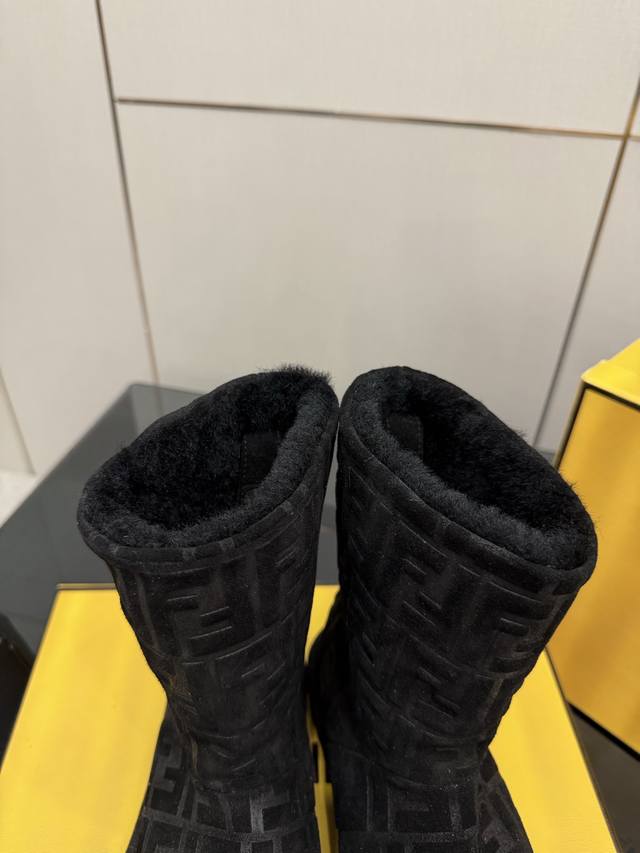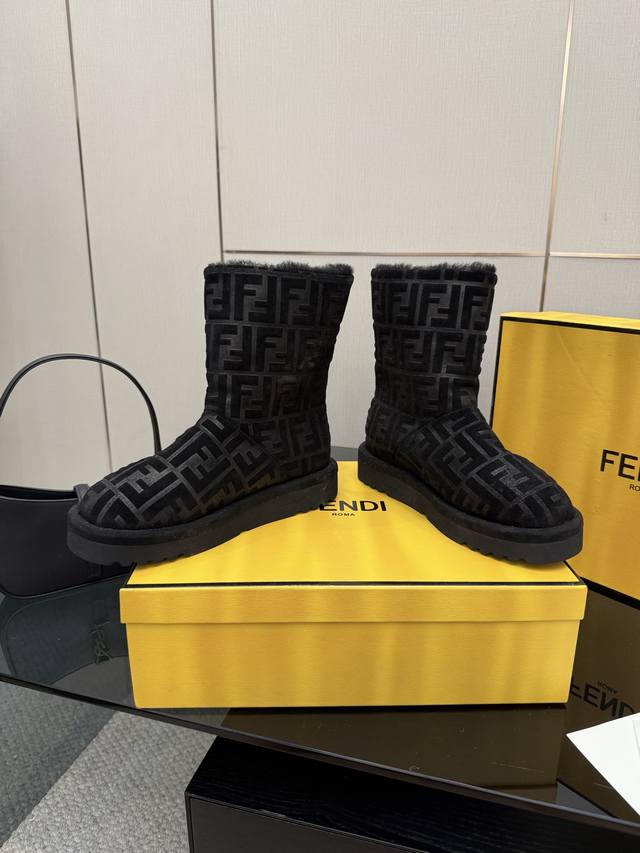 Fendi Apres Chic Snow Boots, calfskin upper, classic Ff embossed pattern, lambskin lining for excellent warmth in autumn and winter. Low-top design, round toe, slip-on style, foam rubber sole, 2.5cm heel height for comfortable wear. Sizes 35-42, 40, 41, 42 (custom orders welcome).
