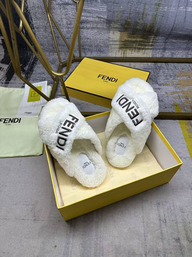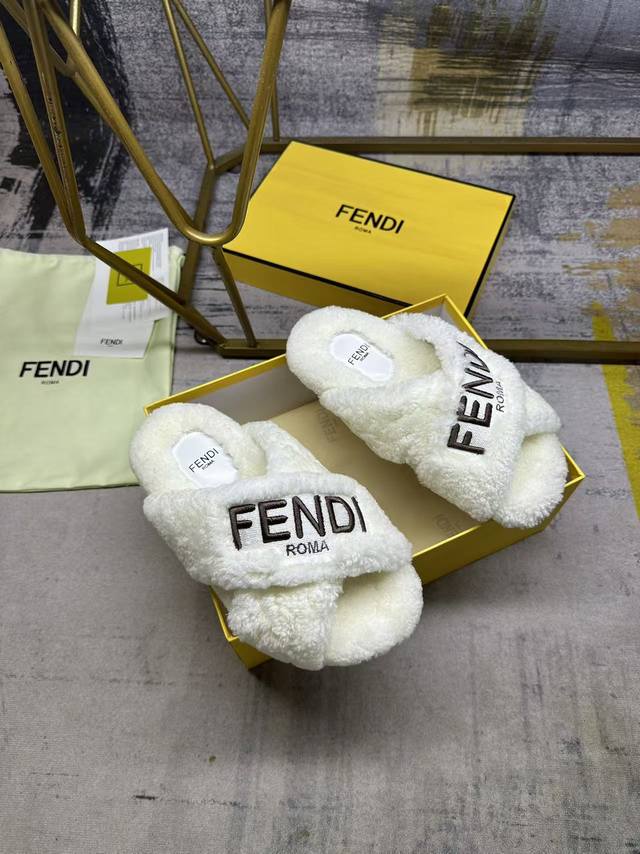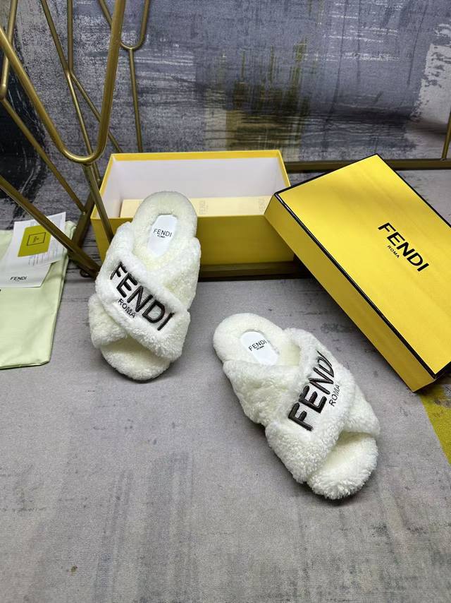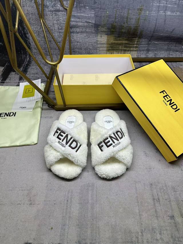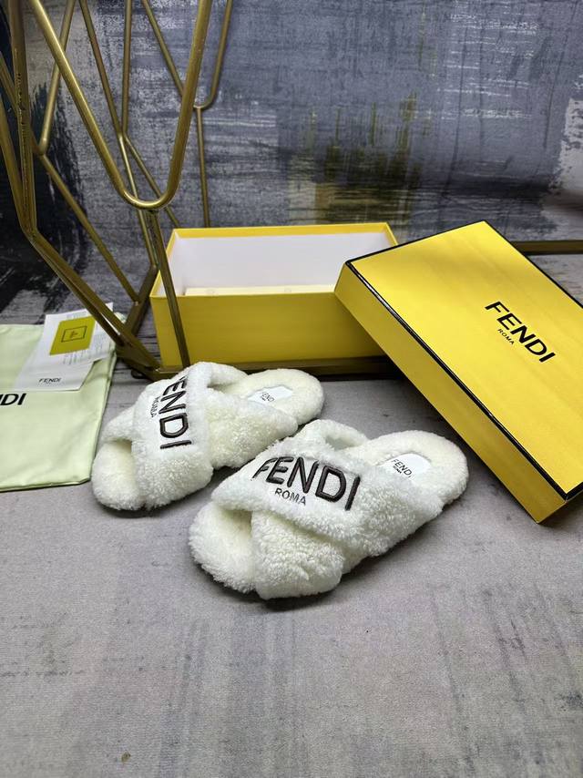 Fendi's latest hit wide-band cross-sole slippers, made of lambswool with Fendi silk embroidery, with the footrest fully covered in lambswool, sizes 35-45.